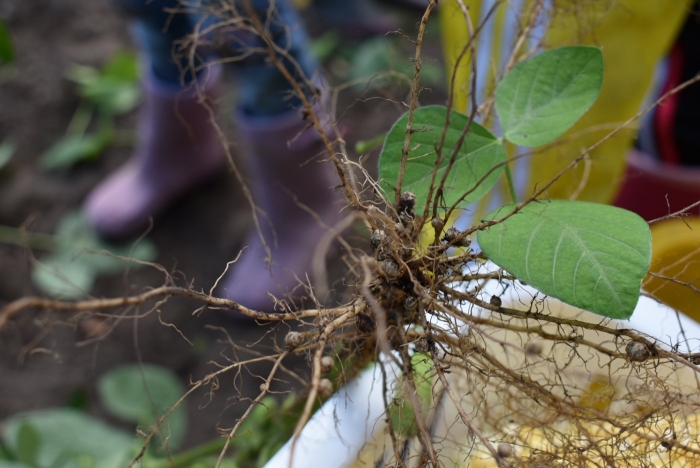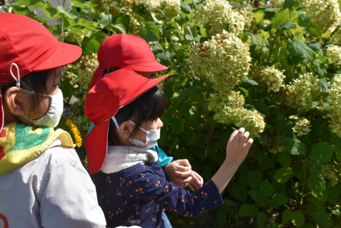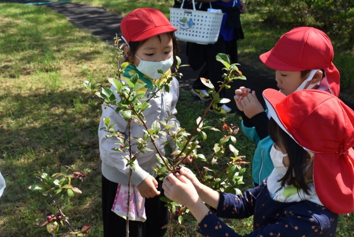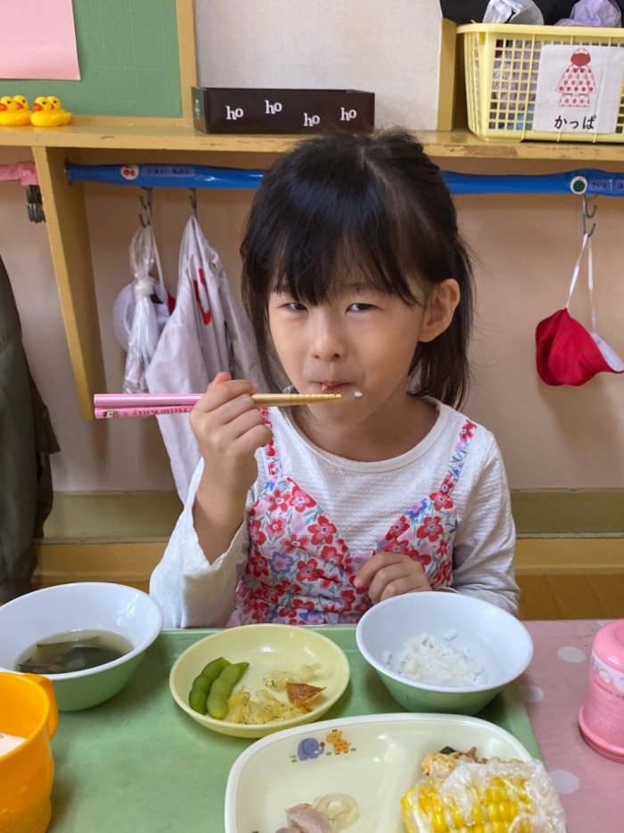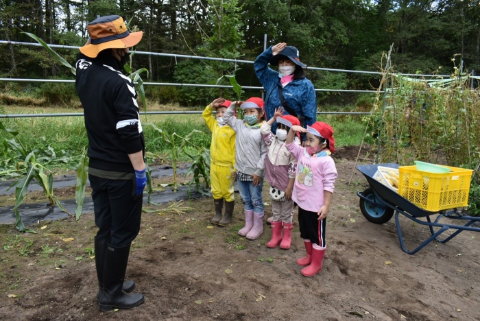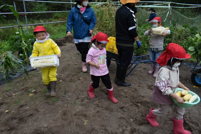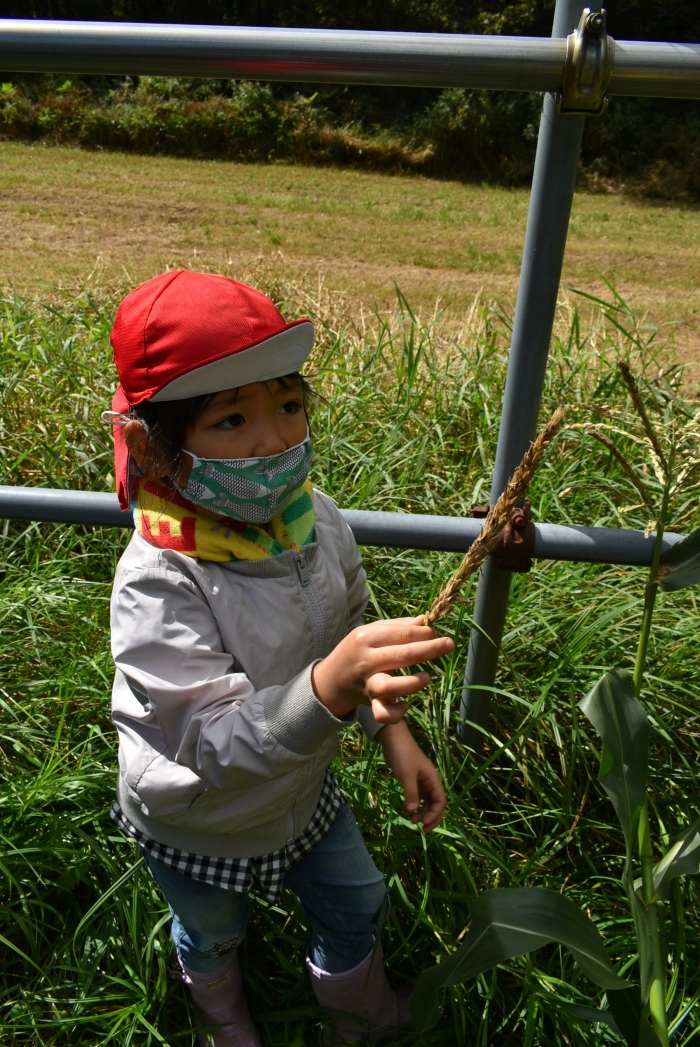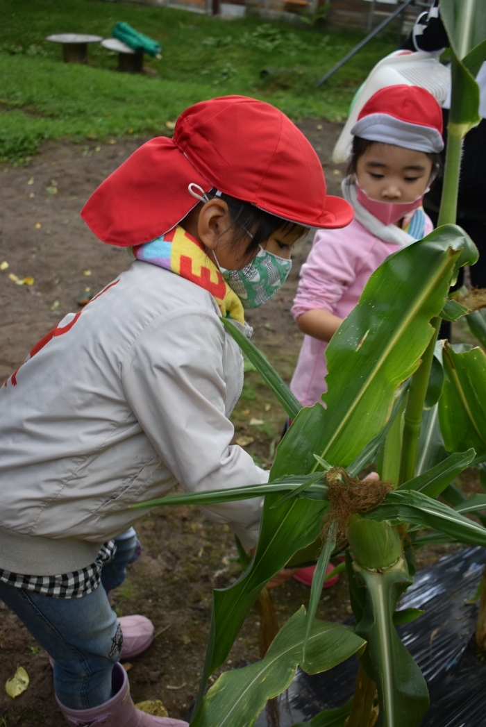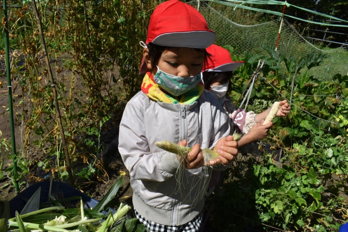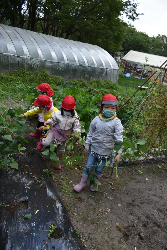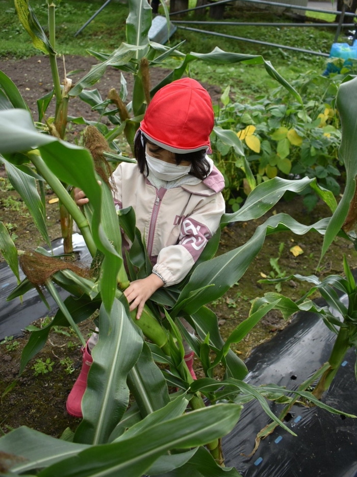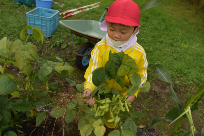 経験者の年中児に採り方を見せてもらい,年少児も意気揚々とチャレンジ! トウモロコシのヒゲの匂いを嗅いだり,フサフサのヒゲを肌に当て感触を楽しんだりする姿。太い茎の下はどうなってるのか? 深くまで張り巡らされている根に驚く姿。ジャガイモ収穫で出会った幼虫との再会!?に喜ぶ姿。まるで職人技!? タマネギの茎を束にして手際よく抜く姿。エダマメの根にコブのようなものがあることを新発見☆彡なんだろう?どうして?を深める姿。収穫後は,率先してマルチシートも剥がして丸めゴミ袋へ,ジャガイモ収穫での体験を思い起こし自分たちで考え行動する姿もありました。