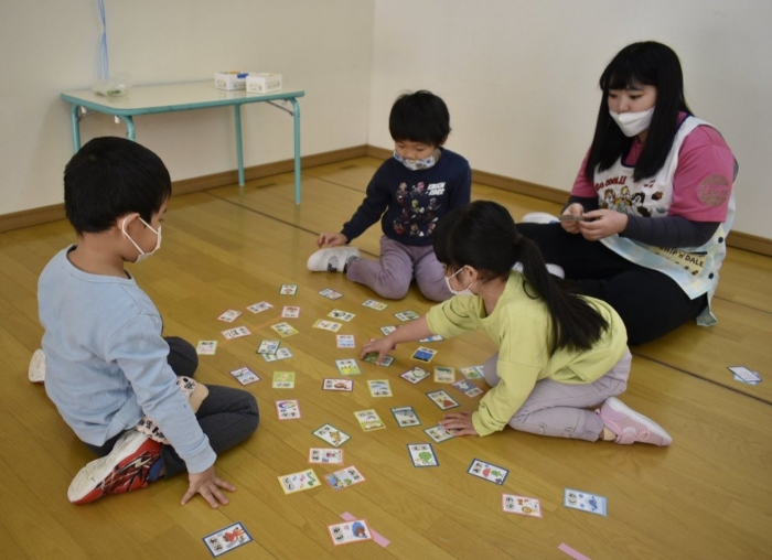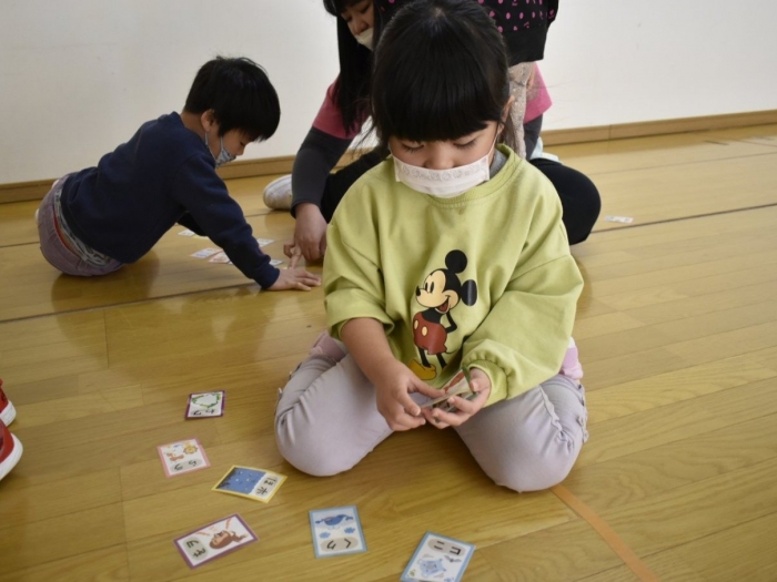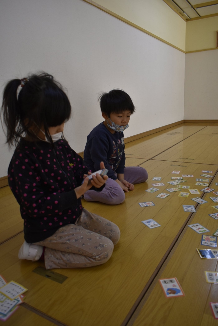 園内では,今日もカルタに燃えていました(笑)  朝遊び,お腹休め,午睡明けと,時間を見つけては友達と誘い合って楽しんでいます。 取れなかった⇒悔しい⇒もう止める…ではなく,もう一回!今度こそ!! と,気持ちを切り替え何度も挑んでいる子ども達です。 目指せ!カルタ名人☆彡