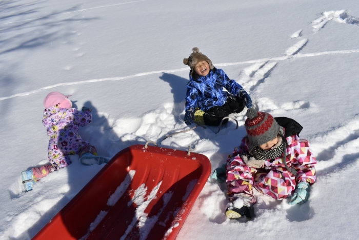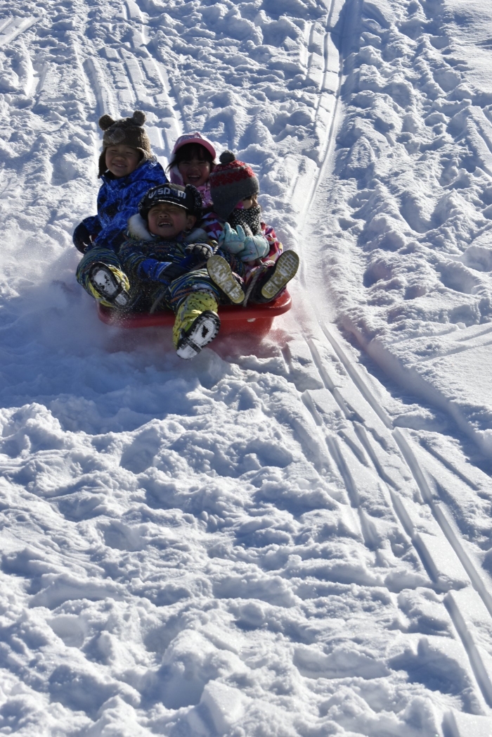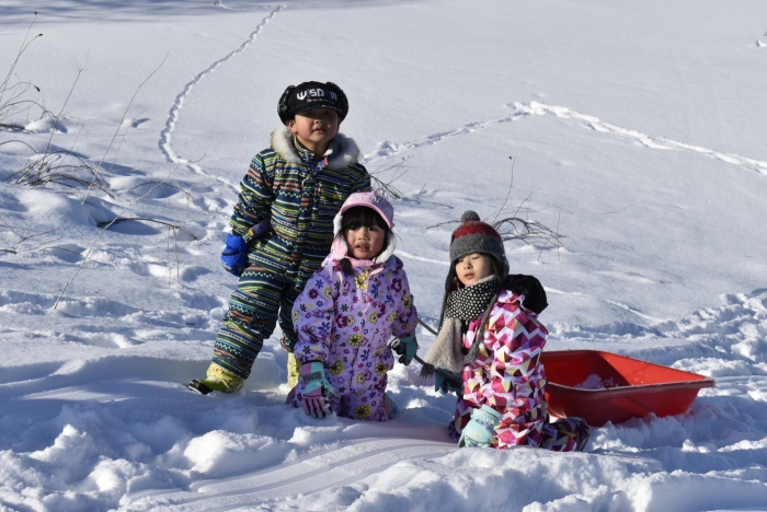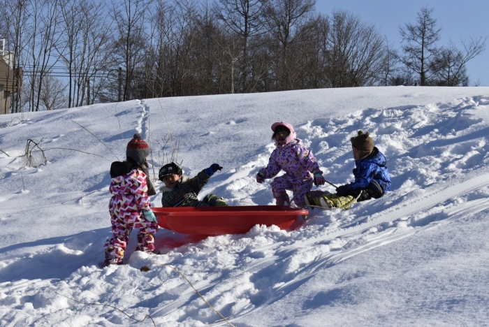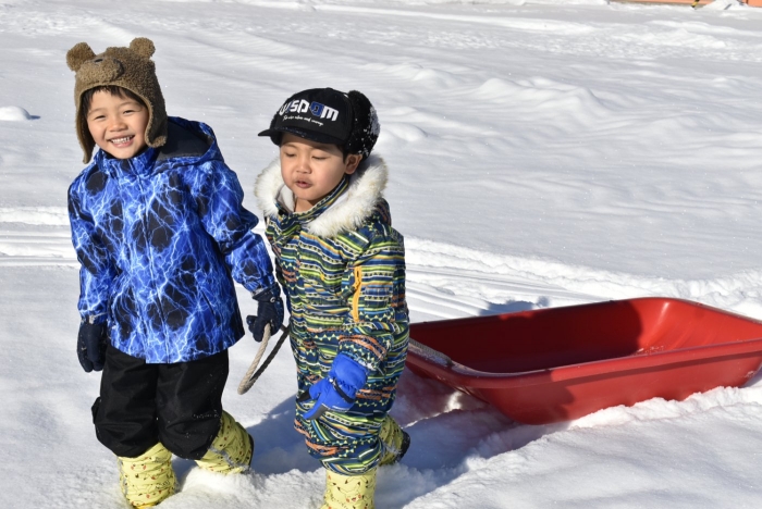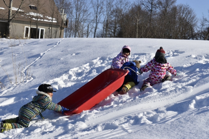 クラス時間後は戸外へ!  今日は,グランドの奥地にある土手まで行き,ソリ滑りを楽しみました。厚手のスノーウエアを着て雪道を歩く,ソリを持って雪山を登るのはなかなかの重労働。何度も足がもつれたり転んだりしながらも,やりたい気持ち,楽しい気持ちの方が先立ち,繰り返し滑ることを楽しんでいました。遊びながら足腰を鍛えたり体のバランス感覚を養ったりできそうです。