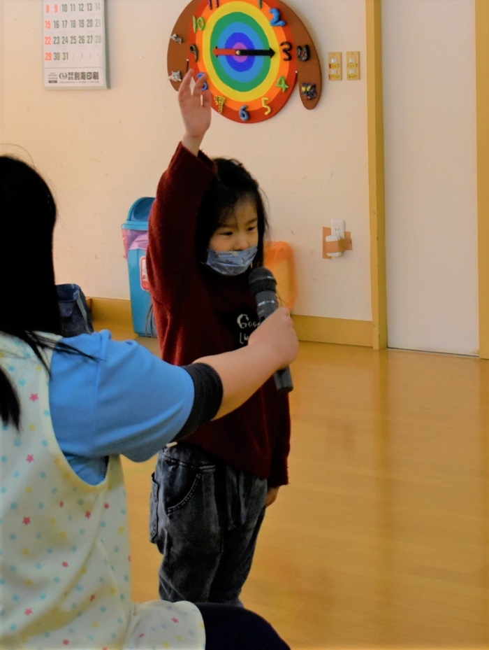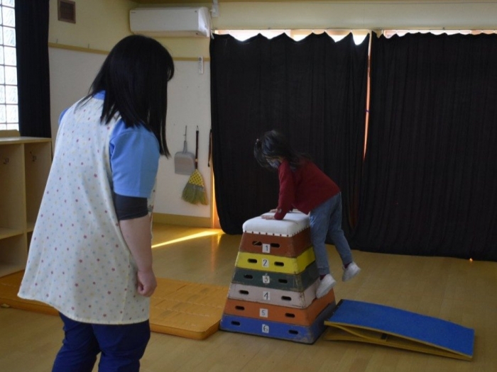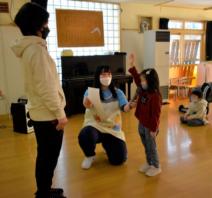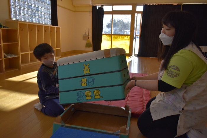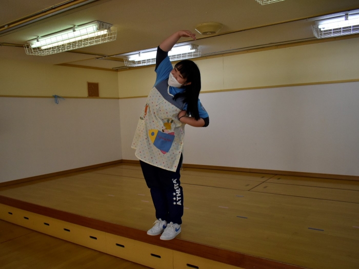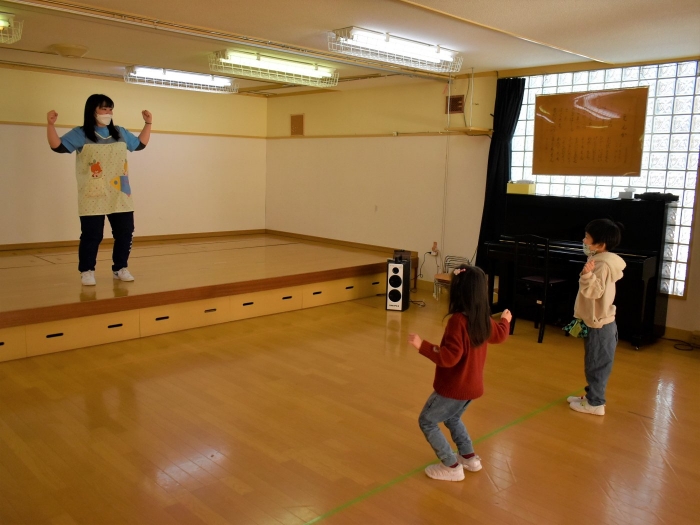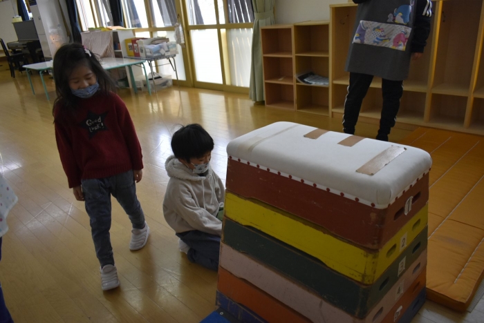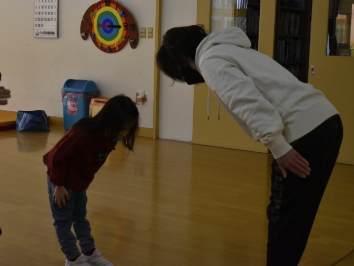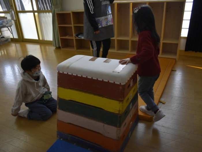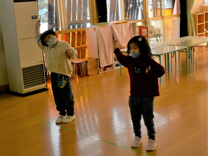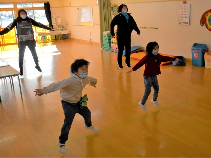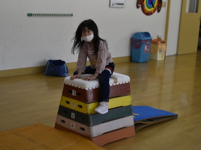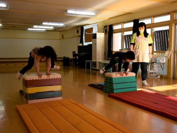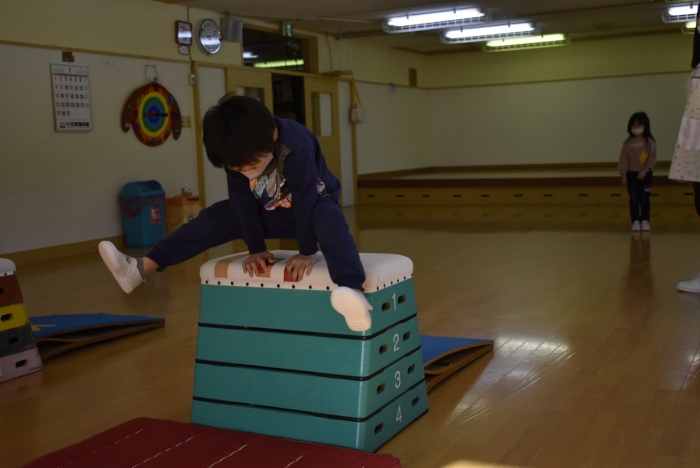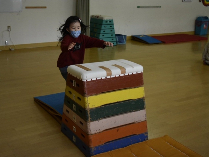 朝遊びでは,『体で遊ぼう』での活動をきっかけに,繰り返し跳び箱に挑戦する姿があります。跳べるようになって楽しい♬と自信や意欲をもったり, もっと跳べるようになりたい! と,目標をもって粘り強く取組んだりしていました。その後は親子雪上運動会に向け,ラジオ体操第2や選手宣誓を実施。少人数でも元気ハツラツでしたよ!