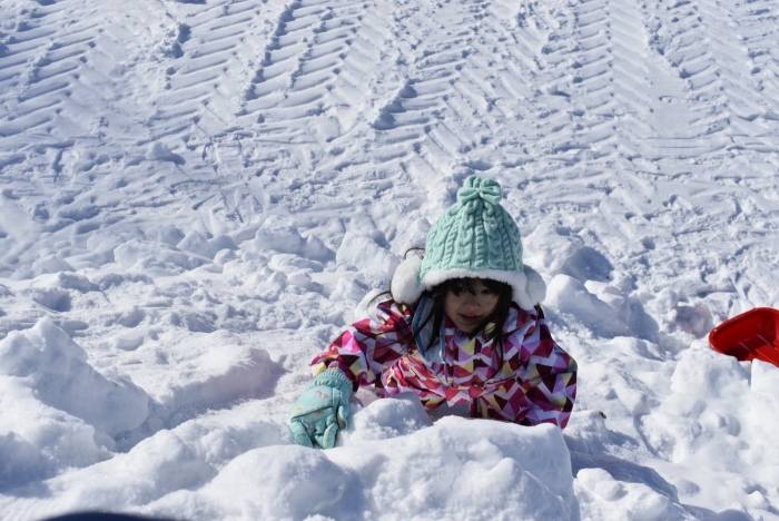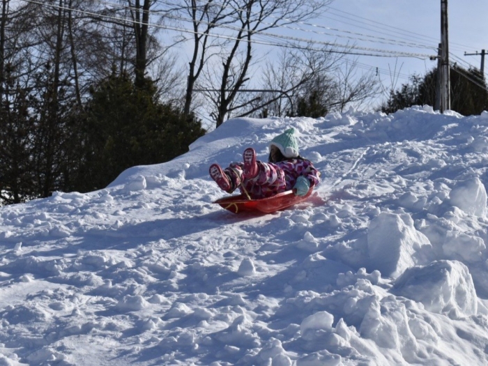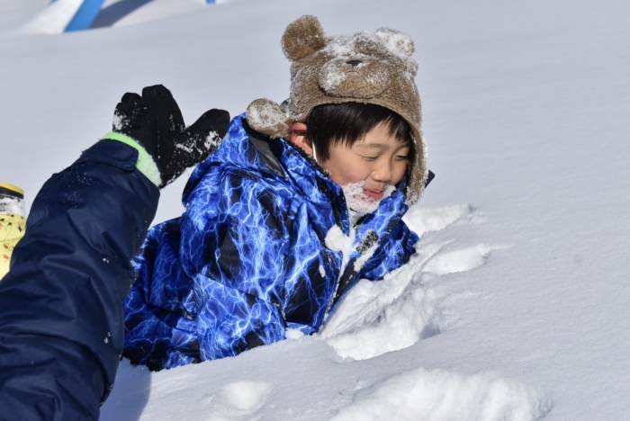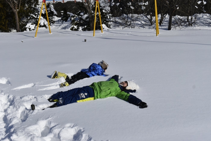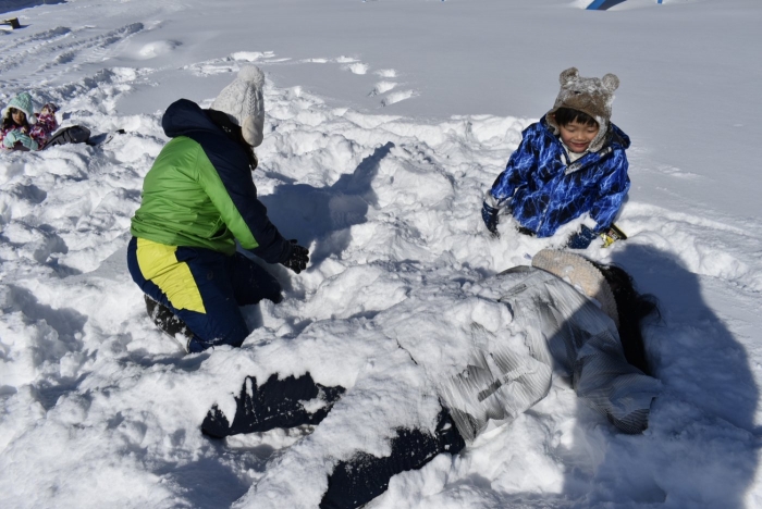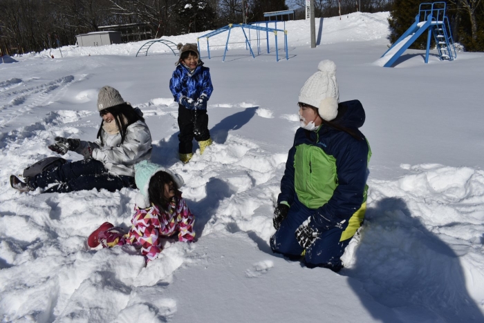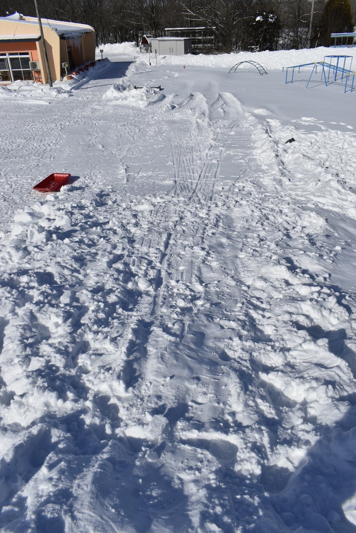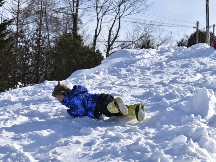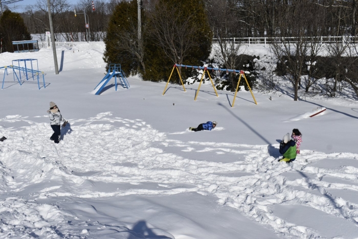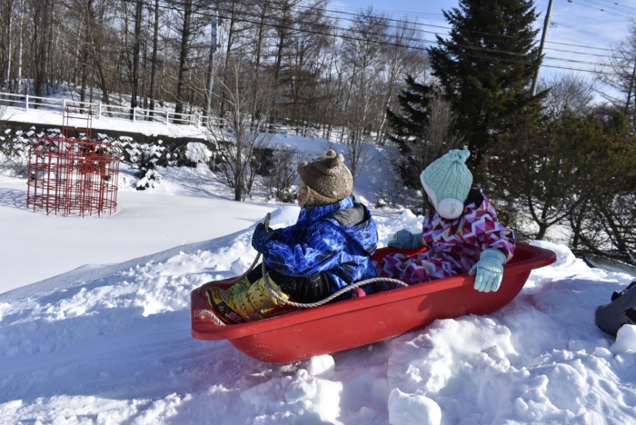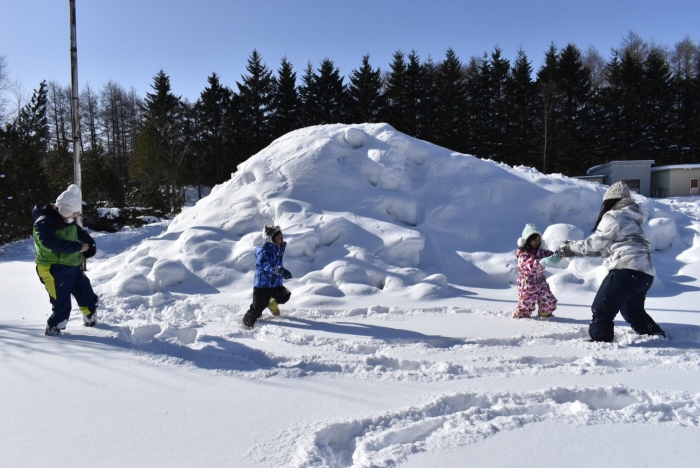 朝の会後は戸外へ! 今日はグランドの雪山や降り積もった雪での遊びを大いに満喫しました。寒さが身に染みる気温でしたが,そんな寒さも吹き飛ばすほど,次々と遊びを見つけ楽しんでいた子ども達です。
