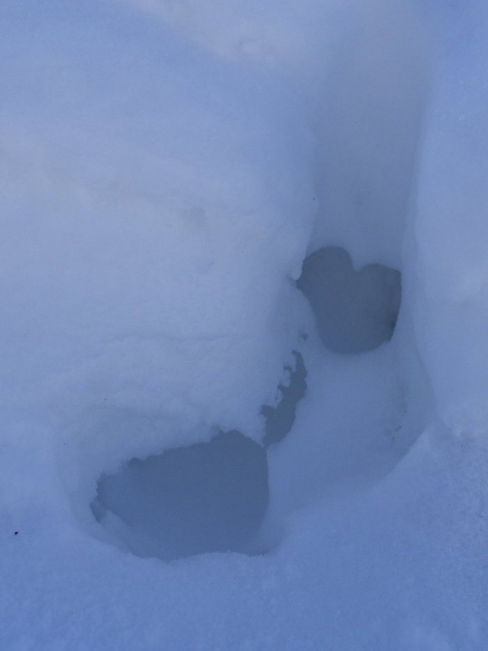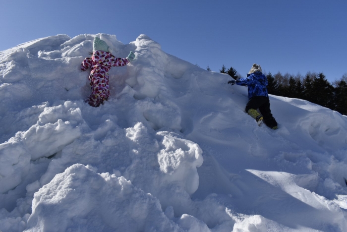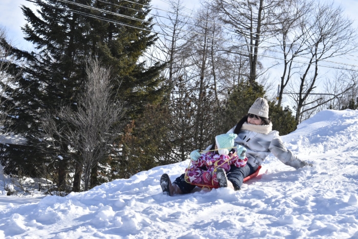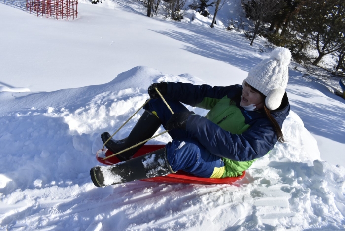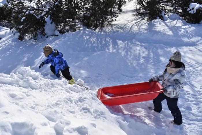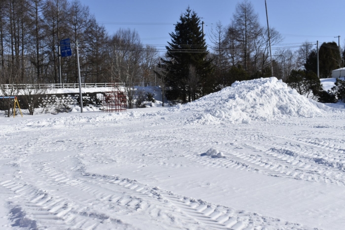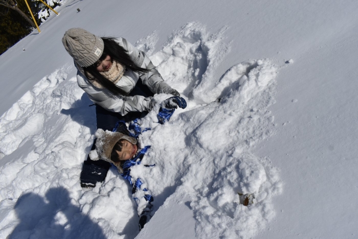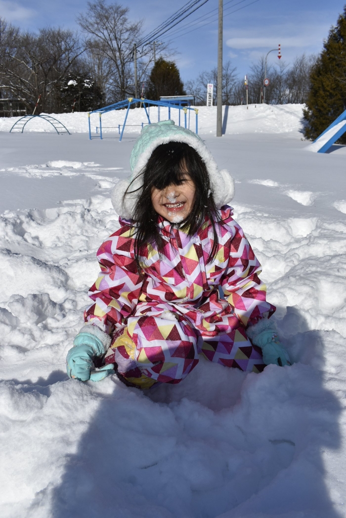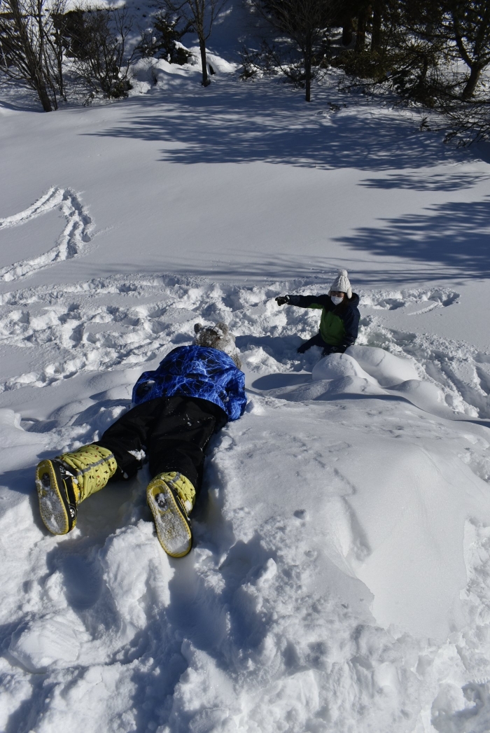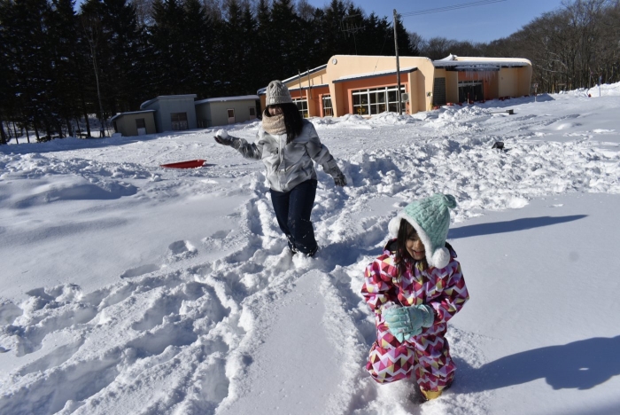 朝の会後は戸外へ! 今日はグランドの雪山や降り積もった雪での遊びを大いに満喫しました。寒さが身に染みる気温でしたが,そんな寒さも吹き飛ばすほど,次々と遊びを見つけ楽しんでいた子ども達です。