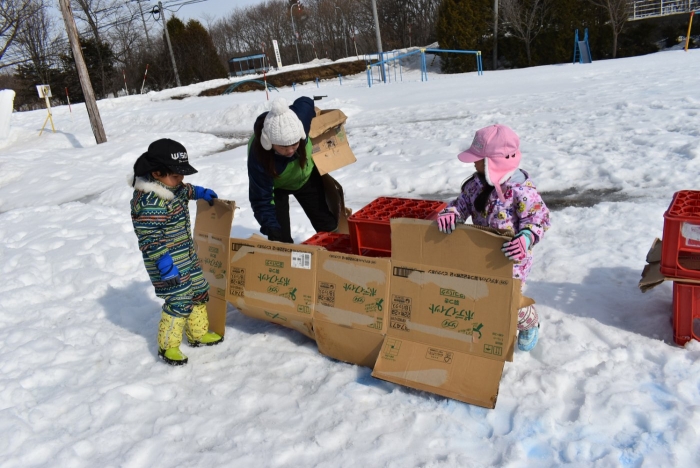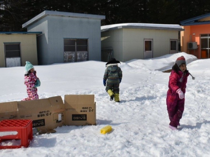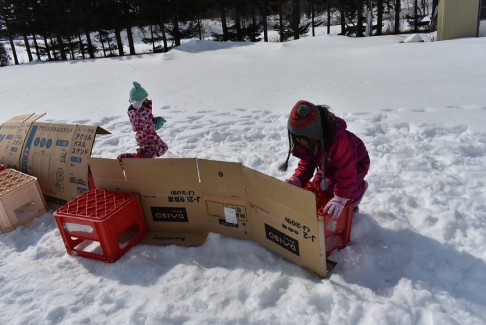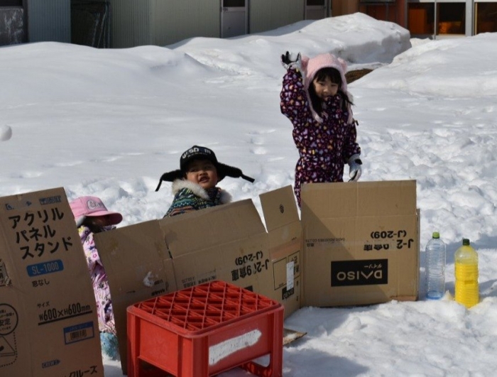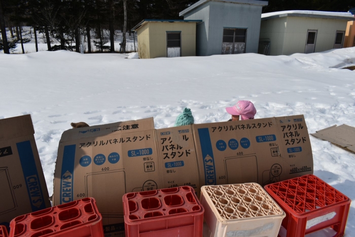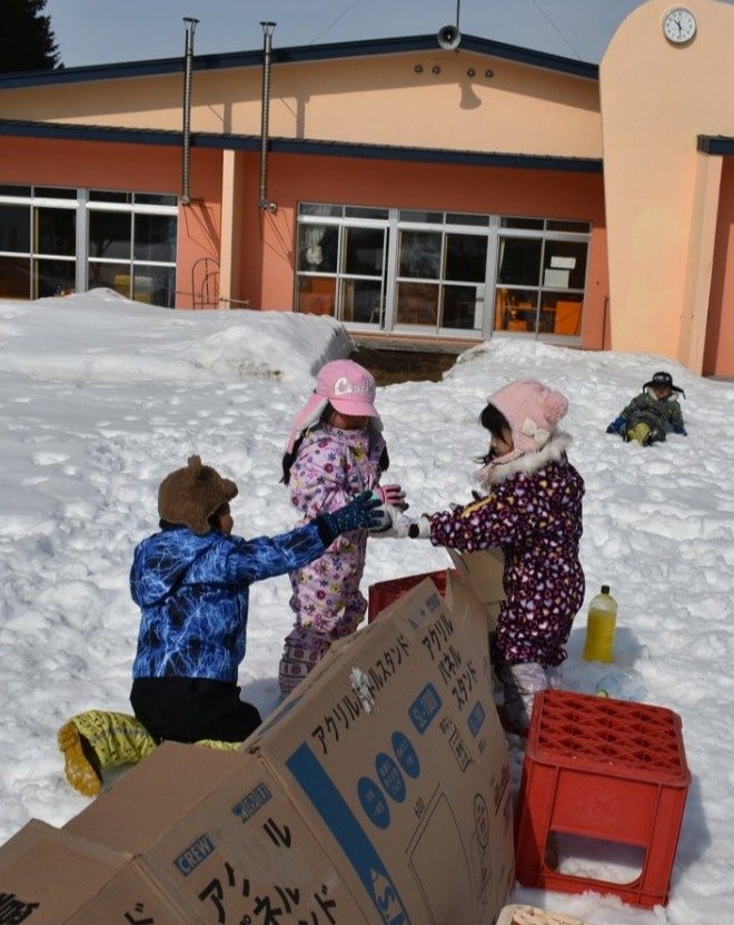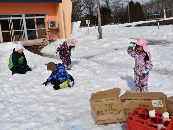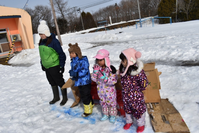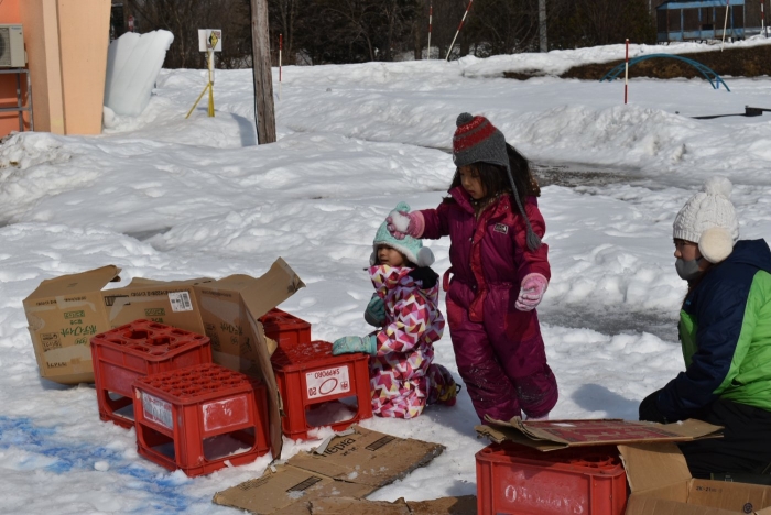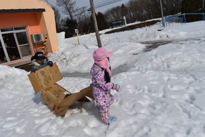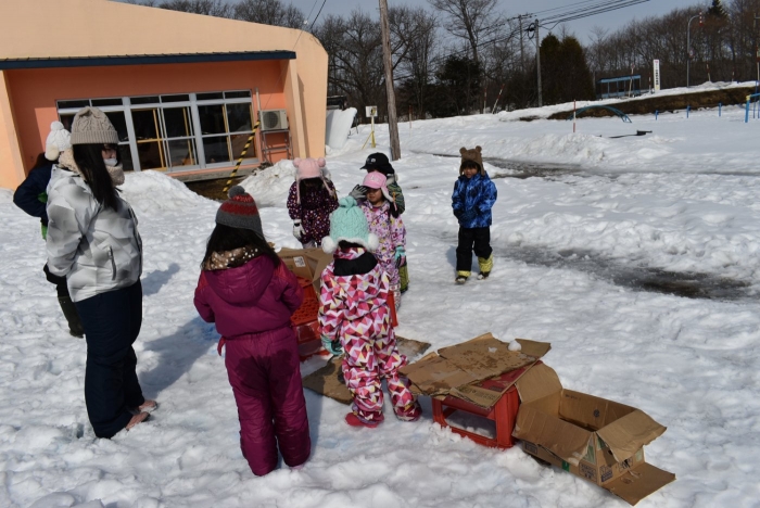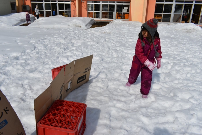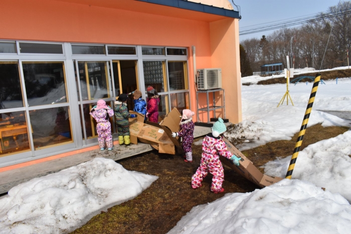昨日作った「雪合戦の隠れ場所,どうなったかな?」と,気に掛けていた年中児。「先生たちも入ったら,隠れるところ足りないんじゃない?」と言っていた年少児。朝の会後,早速みんなで確認しに行きました。プラス気温で雪解けが進み,グランドに向かう途中にも所々水溜まりになっていたため,隠れ場のダンボールを入念にチェック していた子ども達。雪に接触していた部分は少し破れているものの,このまま使えそう!と判断していました。昨日濡れたが乾かしていたダンボールも,再利用できたようです。用途に合わせ適した素材があることや,工夫次第で改良できることに気付けたでしょうか? こうした遊びの中での学びの芽を大切にしていきたいと思います。