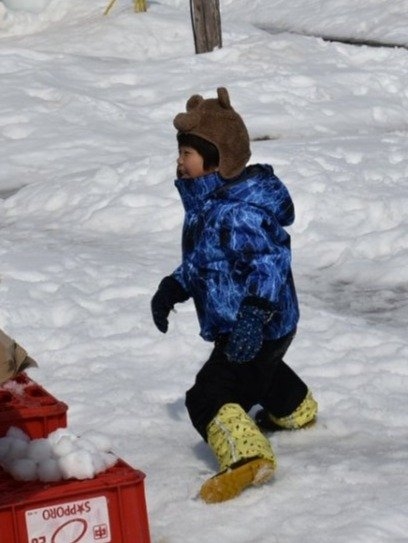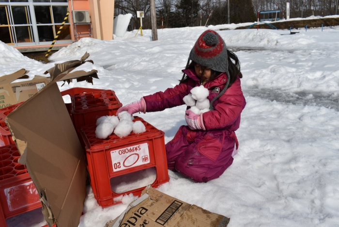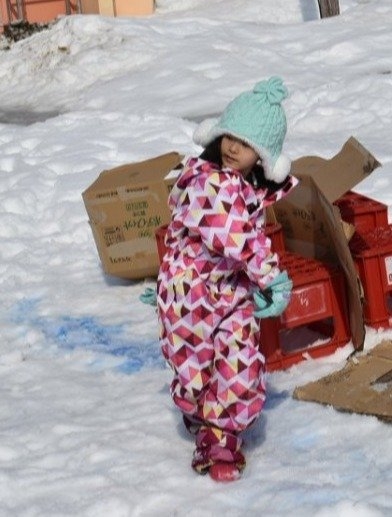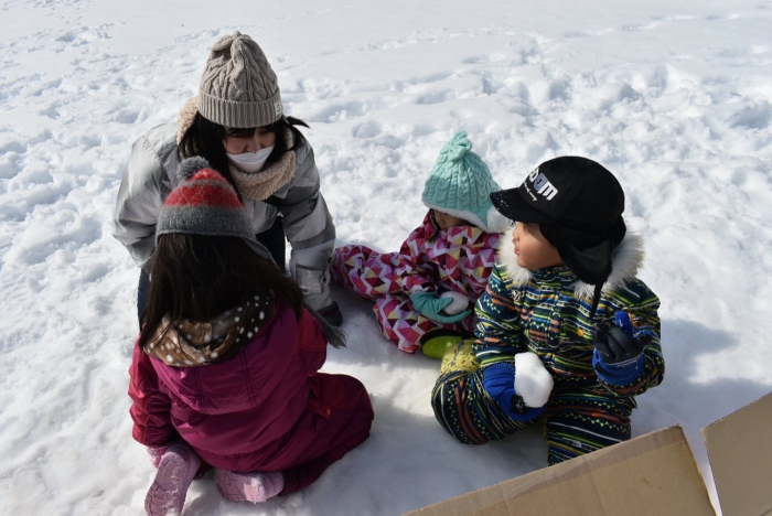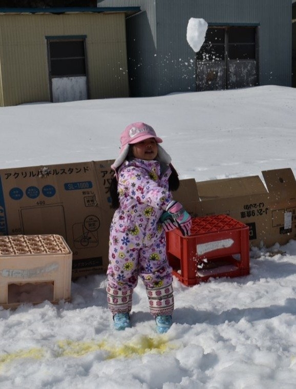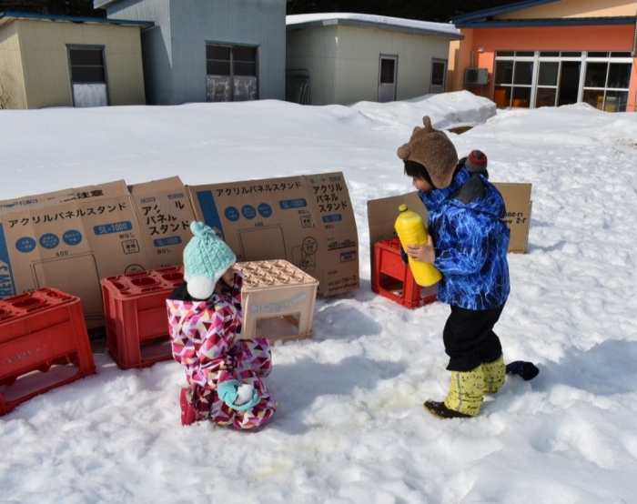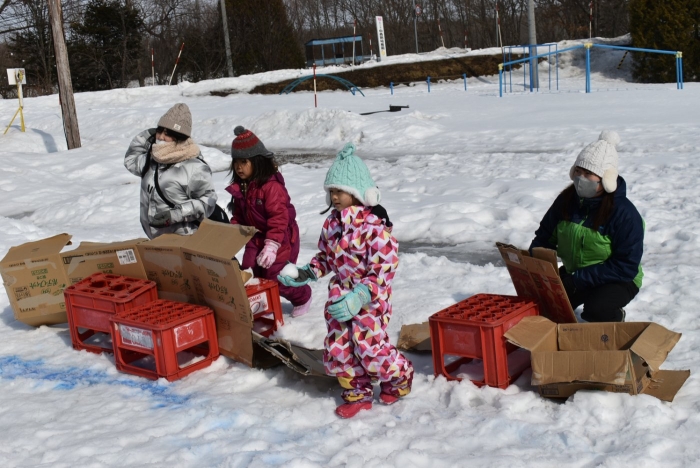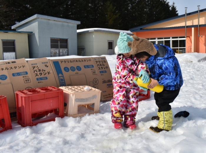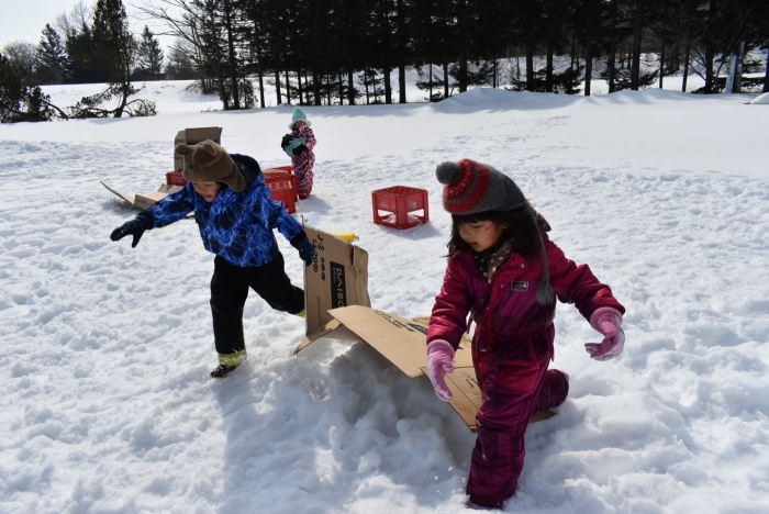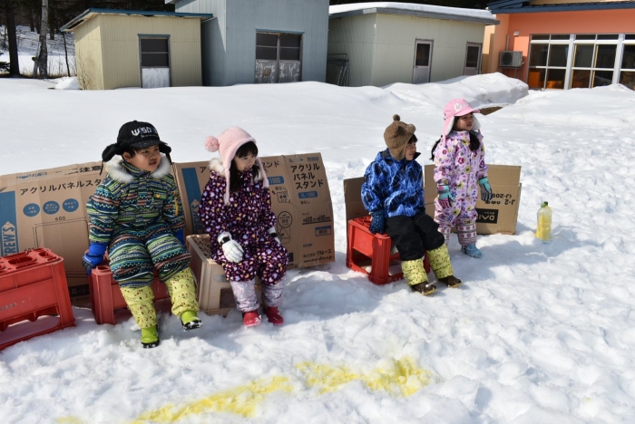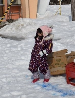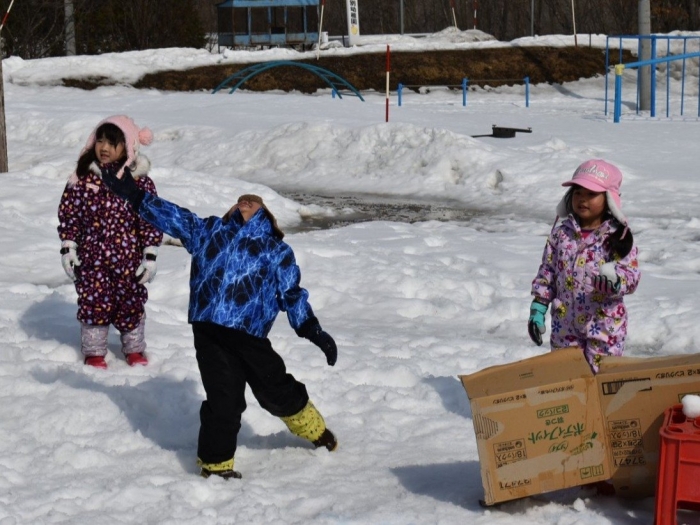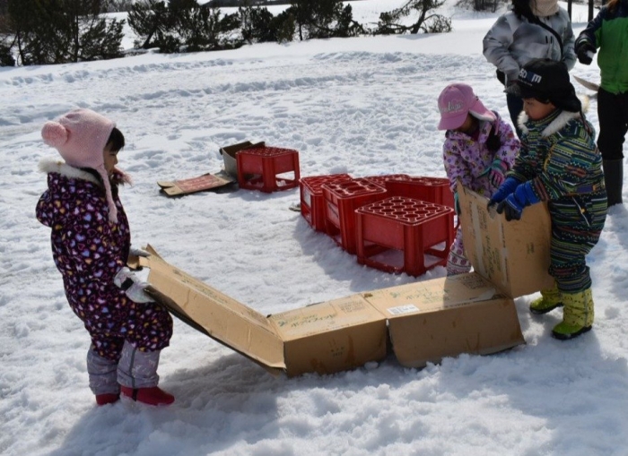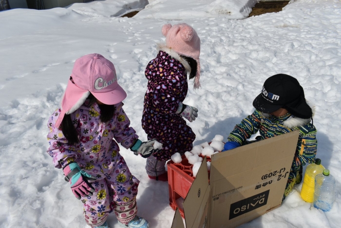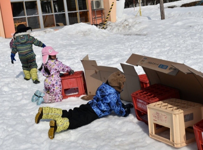 昨日作った「雪合戦の隠れ場所,どうなったかな?」と,気に掛けていた年中児。「先生たちも入ったら,隠れるところ足りないんじゃない?」と言っていた年少児。朝の会後,早速みんなで確認しに行きました。プラス気温で雪解けが進み,グランドに向かう途中にも所々水溜まりになっていたため,隠れ場のダンボールを入念にチェック していた子ども達。雪に接触していた部分は少し破れているものの,このまま使えそう!と判断していました。昨日濡れたが乾かしていたダンボールも,再利用できたようです。用途に合わせ適した素材があることや,工夫次第で改良できることに気付けたでしょうか? こうした遊びの中での学びの芽を大切にしていきたいと思います。