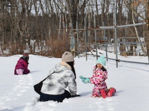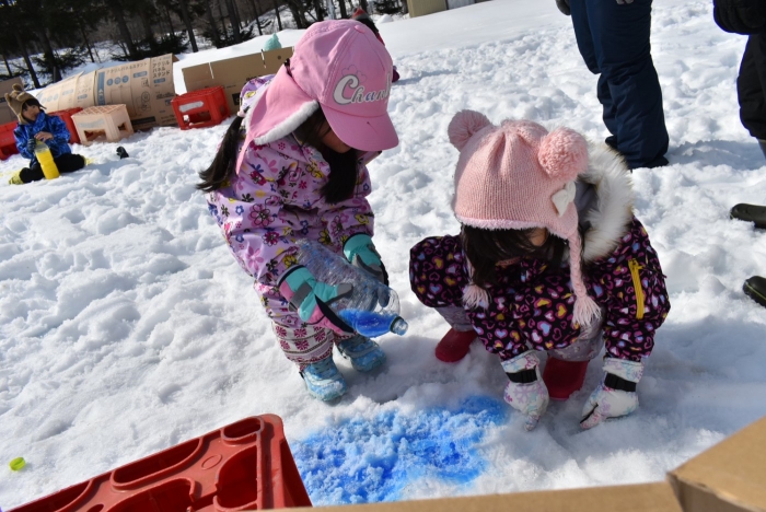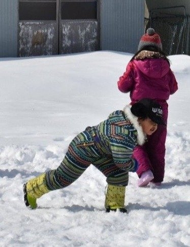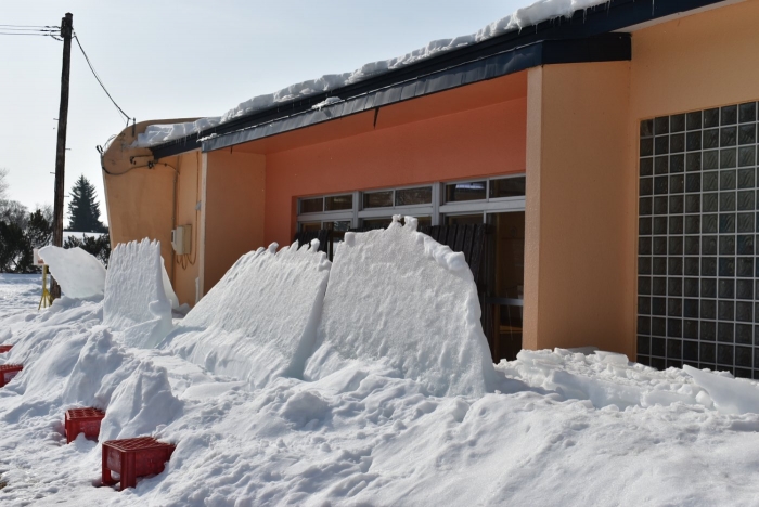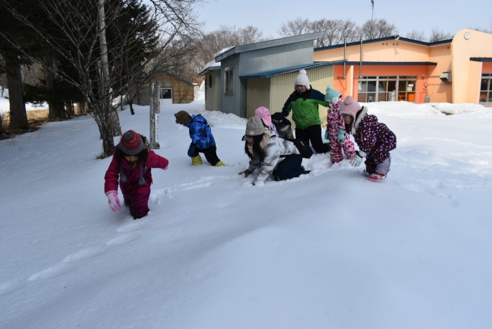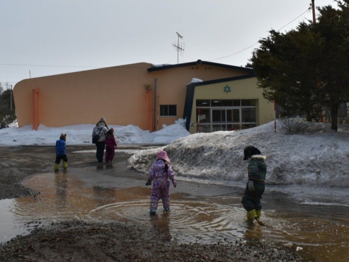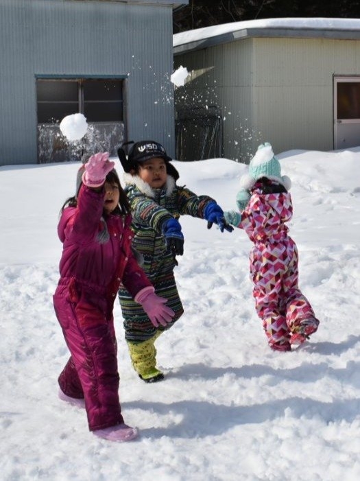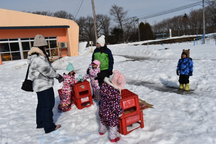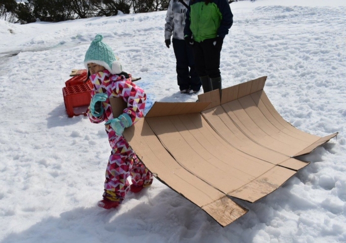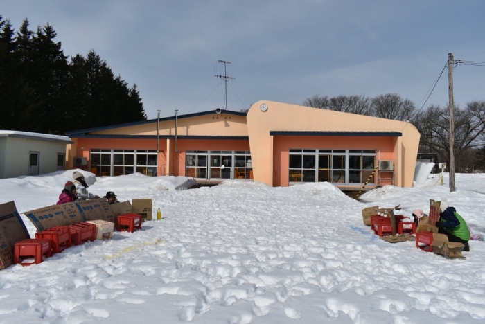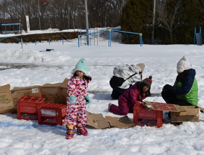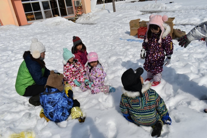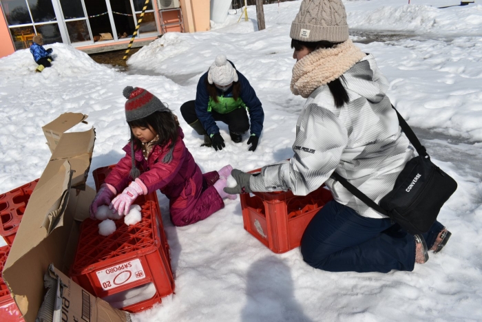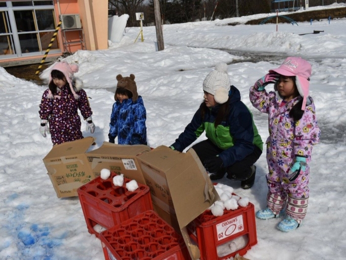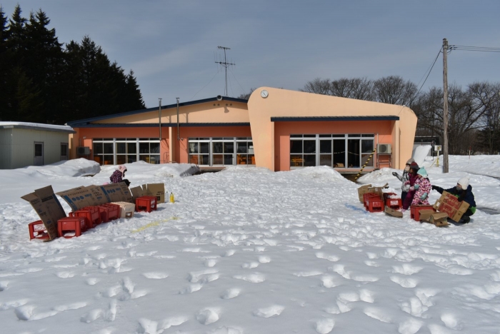 昨日作った「雪合戦の隠れ場所,どうなったかな?」と,気に掛けていた年中児。「先生たちも入ったら,隠れるところ足りないんじゃない?」と言っていた年少児。朝の会後,早速みんなで確認しに行きました。プラス気温で雪解けが進み,グランドに向かう途中にも所々水溜まりになっていたため,隠れ場のダンボールを入念にチェック していた子ども達。雪に接触していた部分は少し破れているものの,このまま使えそう!と判断していました。昨日濡れたが乾かしていたダンボールも,再利用できたようです。用途に合わせ適した素材があることや,工夫次第で改良できることに気付けたでしょうか? こうした遊びの中での学びの芽を大切にしていきたいと思います。