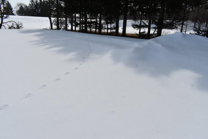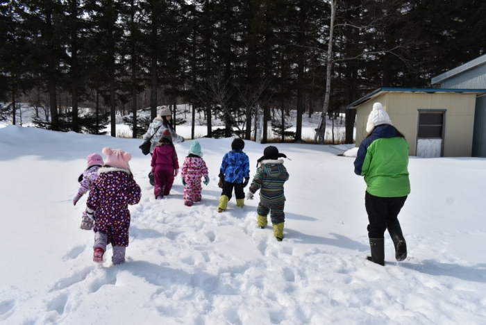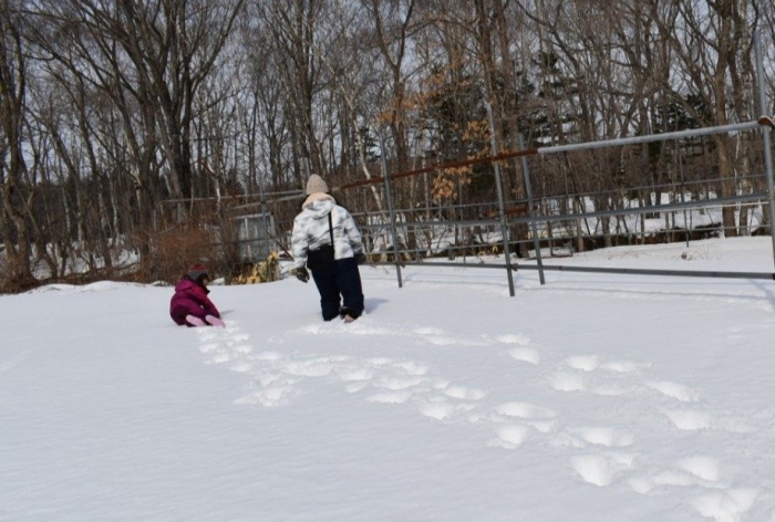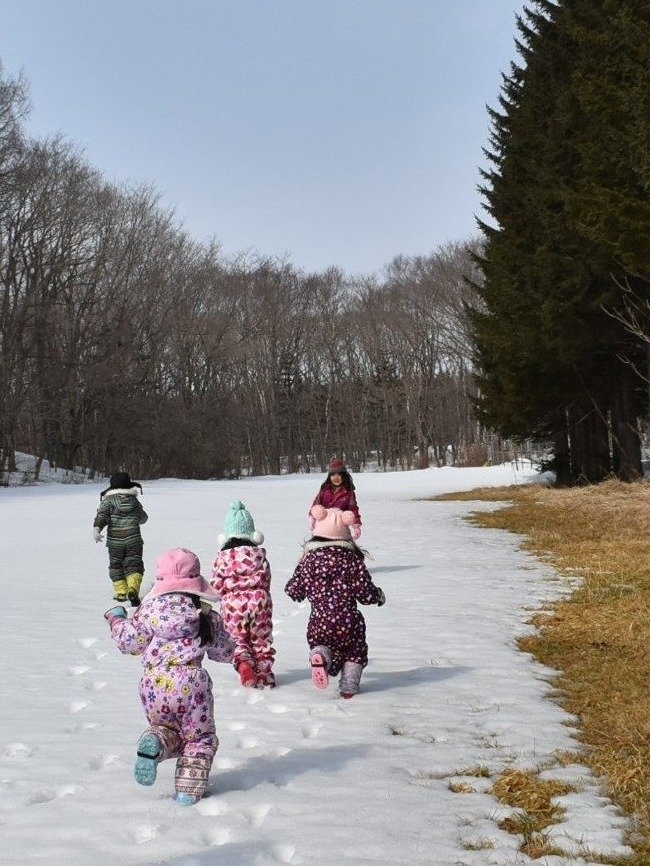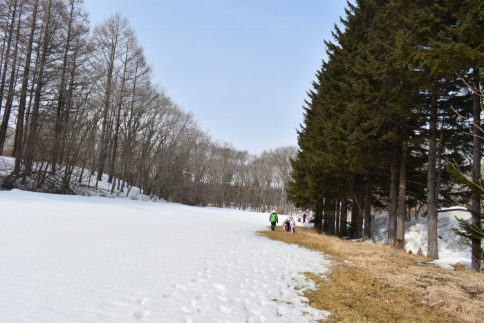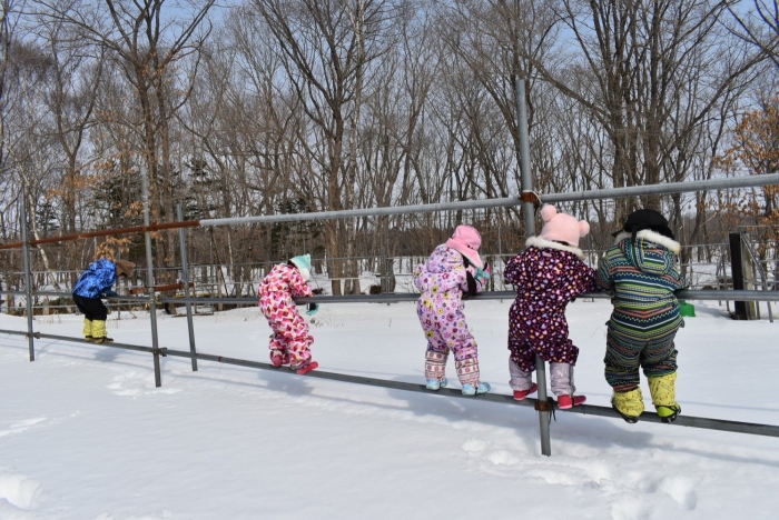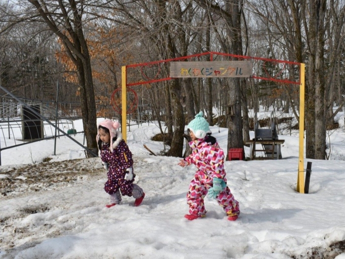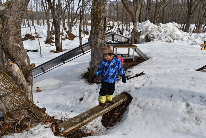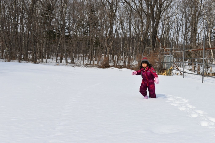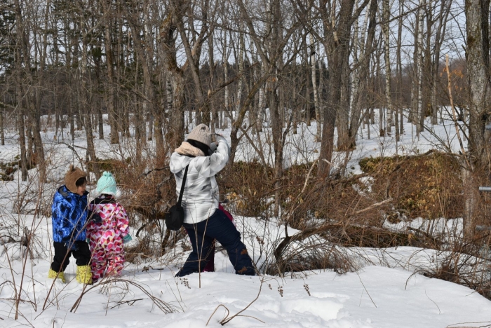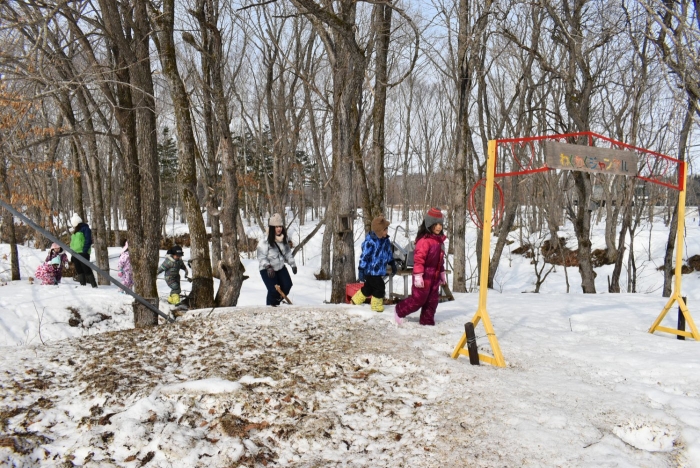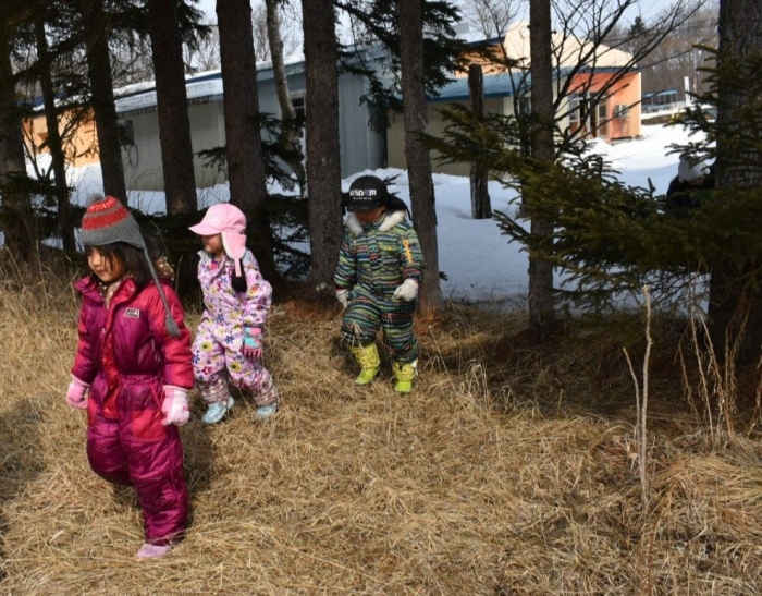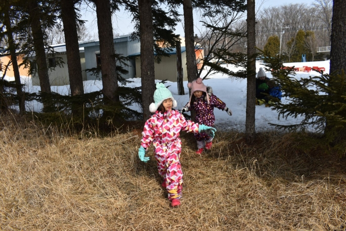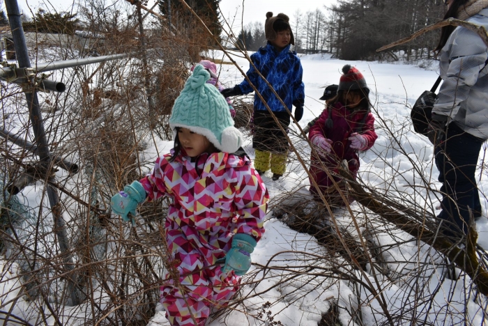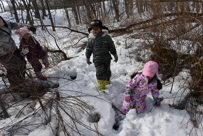 隠れ場の確認,そして,雪合戦を楽しんだ後は,久しぶりに探険に出掛けました。グランドから続く何かの足跡(クマだ!!と確信している子も)をたどり隣の牧草地,そして,わくわくジャングルへ! 「なんか,ここ懐かしい」「前と違うね」と季節により様変わりする風景を眺めたり,雪解けが進んでいる場所を見て「春だー!春あった☆彡」と心を弾ませたりしている姿がありました。開放感を味わったことで,気分もリフレッシュ!でパーティーに臨めそうです。