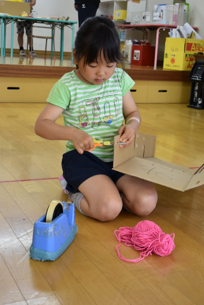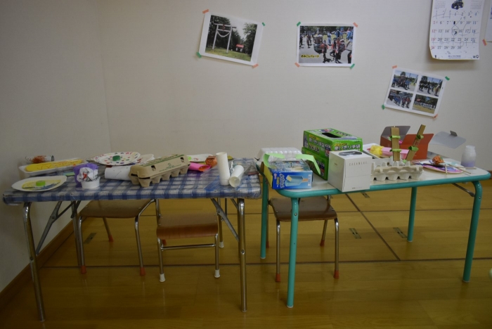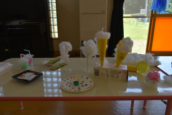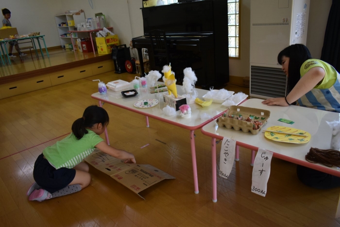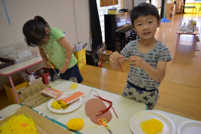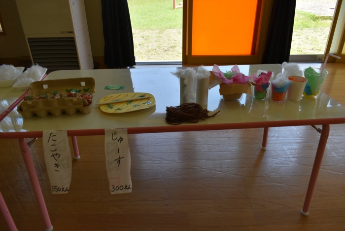 先週から登園後の朝遊びでは,お祭りごっこを楽しんでいる子ども達。それぞれイメージをわかせ,廃品素材や製作用品を利用しながら,お祭りにちなんだ品物を次々と作り出しています。 今日も新たな食べ物を開発していましたよ。