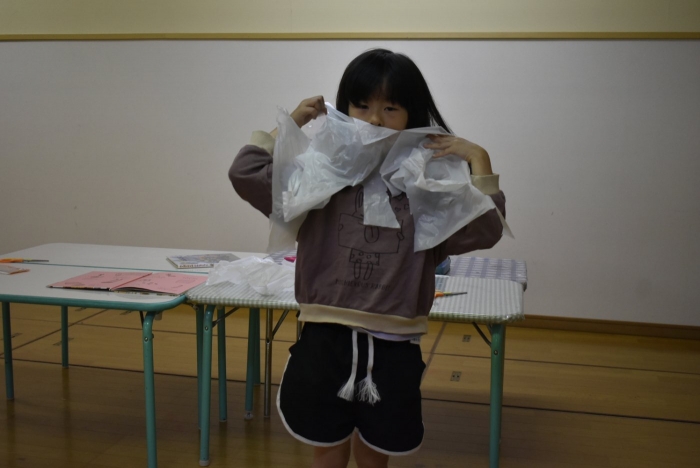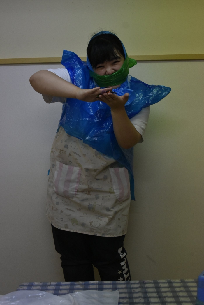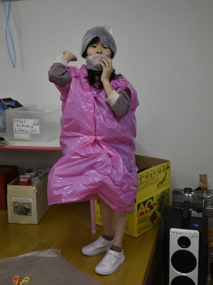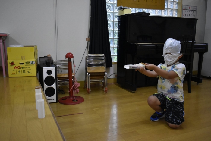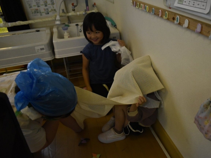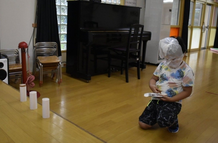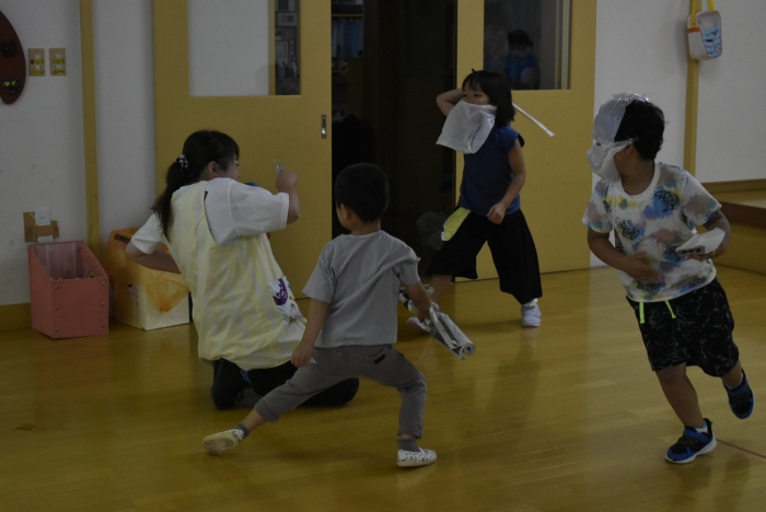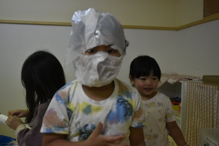 お花紙で作っていた忍者のマスク,実際に付けて遊んでみると,汗で破ける,水に弱いと気付いた年長児。適した素材はないかと,今日は買い物袋を切り貼りしたり,マスクの他に衣装も作ったりと,イメージする忍者を思い描きながら試し工夫し作っていました。
