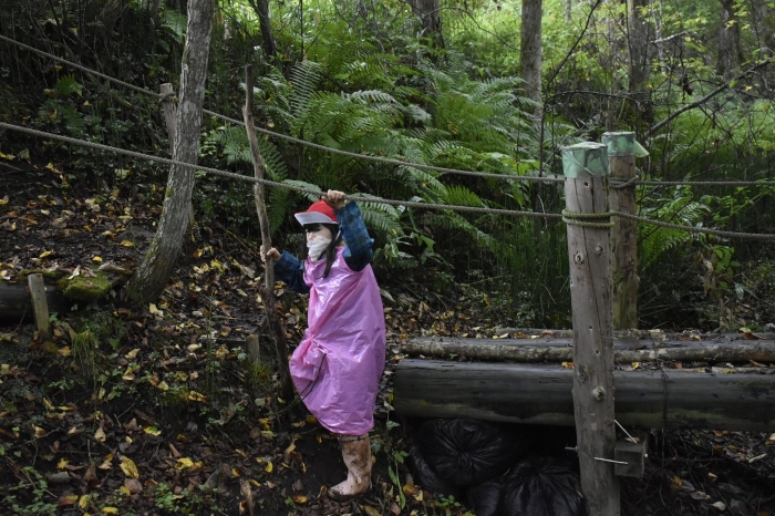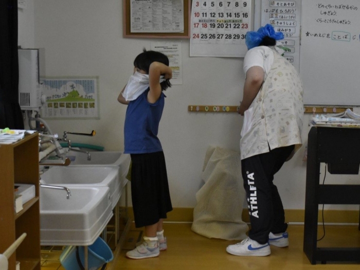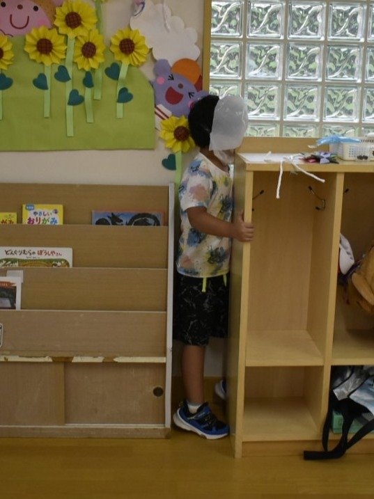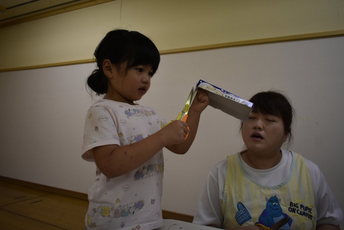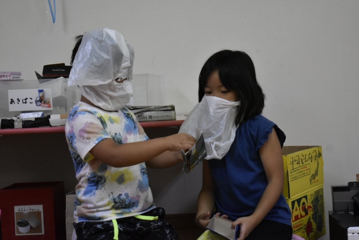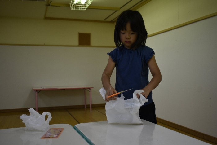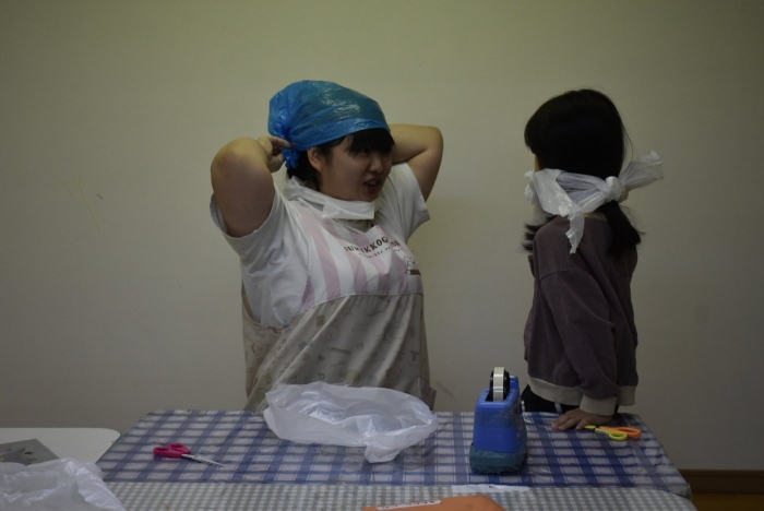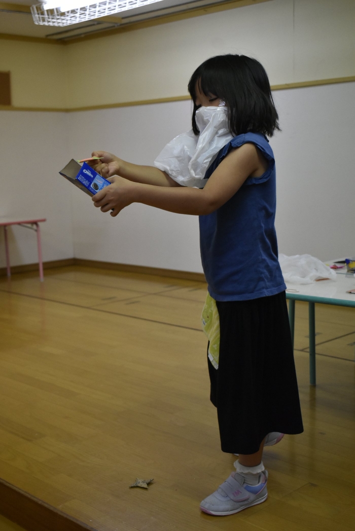 お花紙で作っていた忍者のマスク,実際に付けて遊んでみると,汗で破ける,水に弱いと気付いた年長児。適した素材はないかと,今日は買い物袋を切り貼りしたり,マスクの他に衣装も作ったりと,イメージする忍者を思い描きながら試し工夫し作っていました。