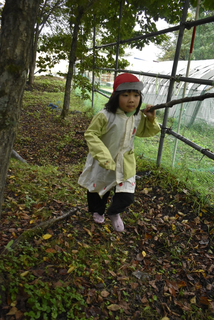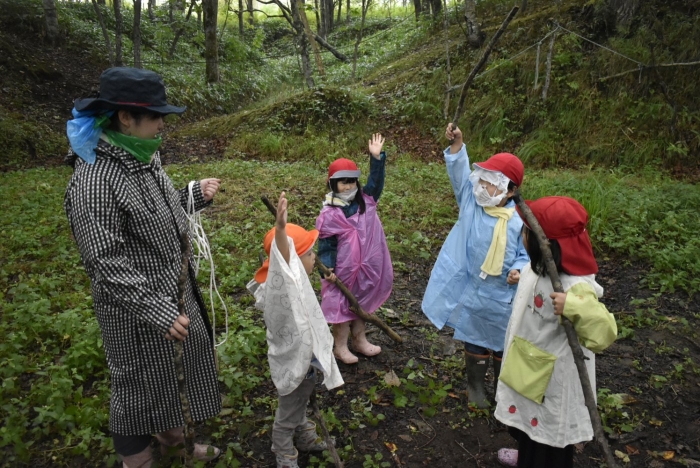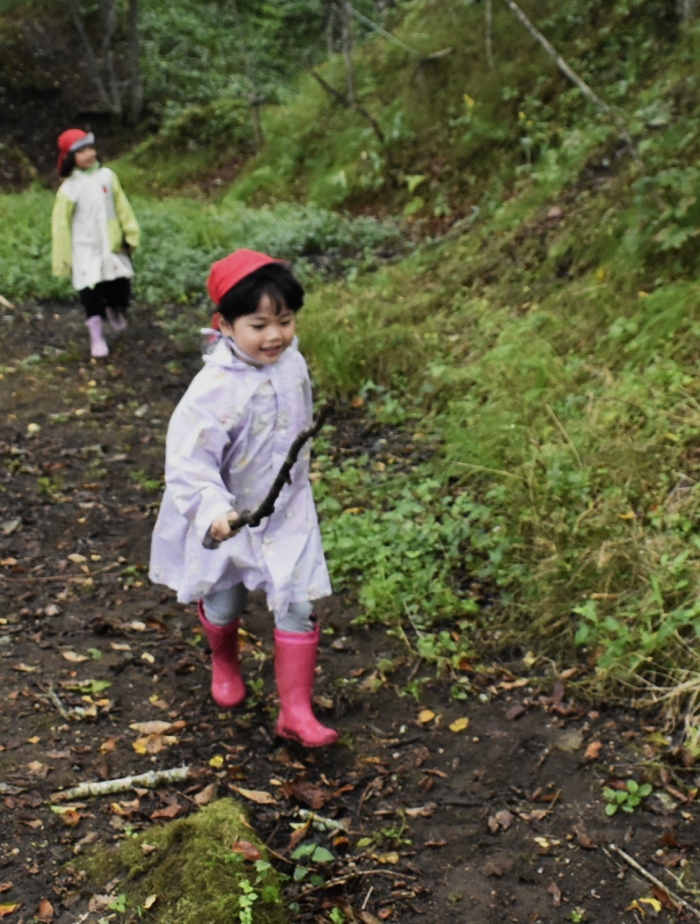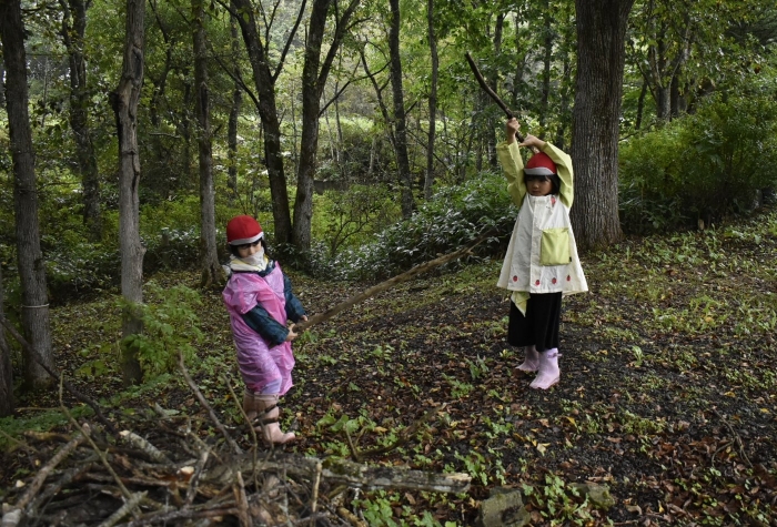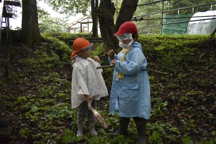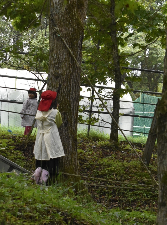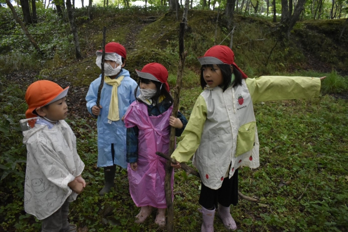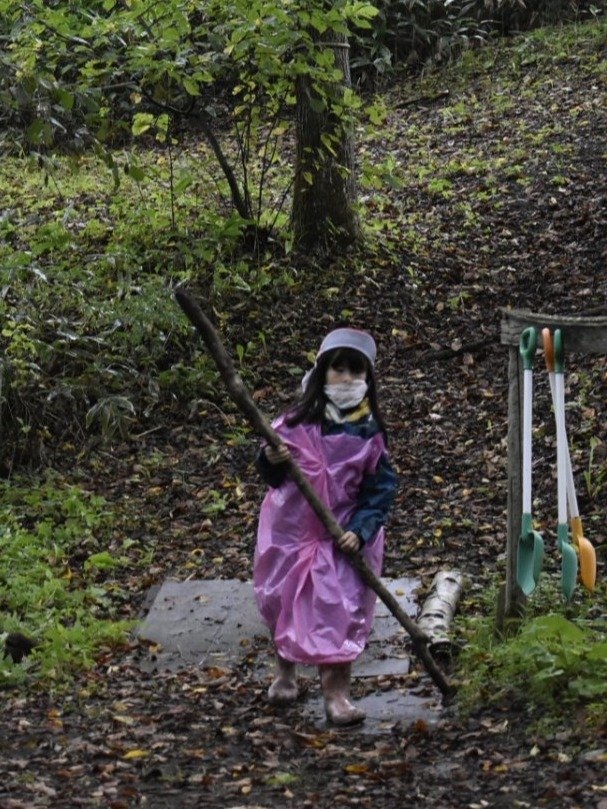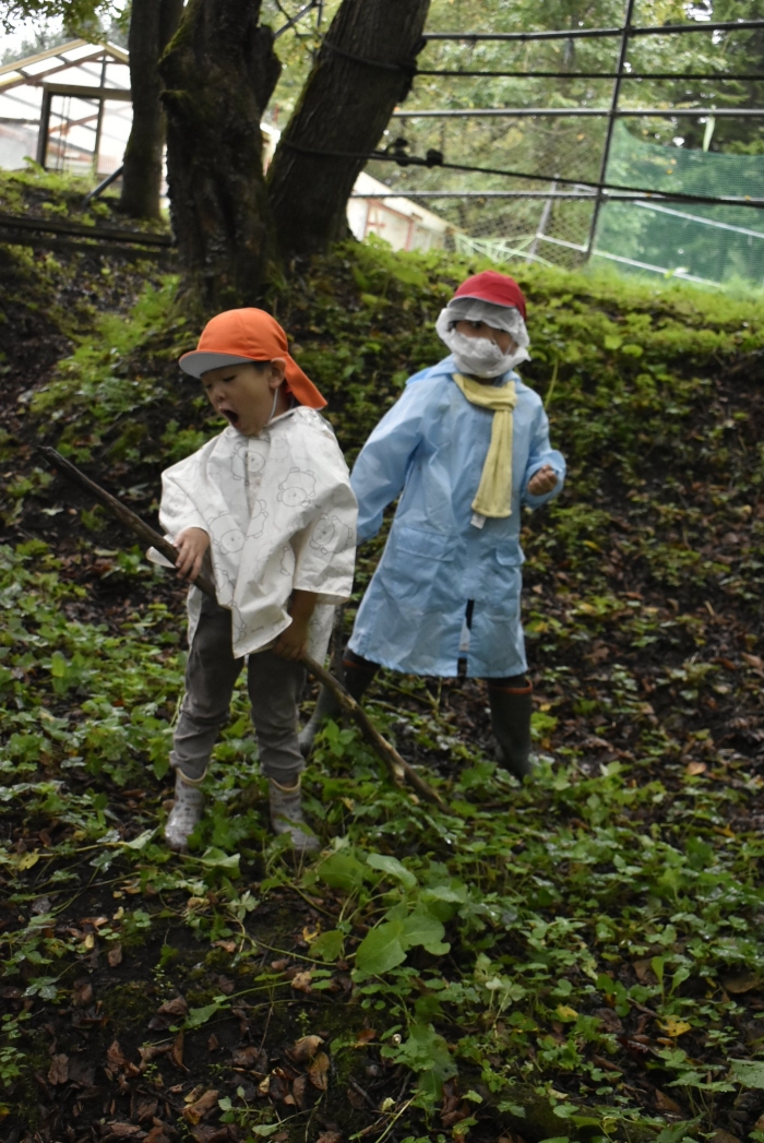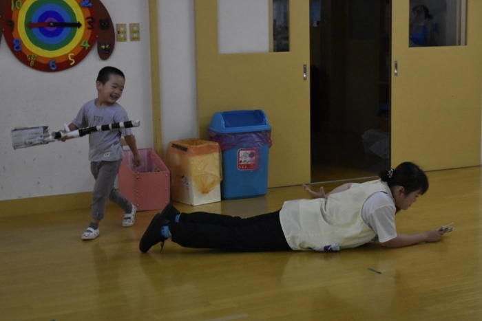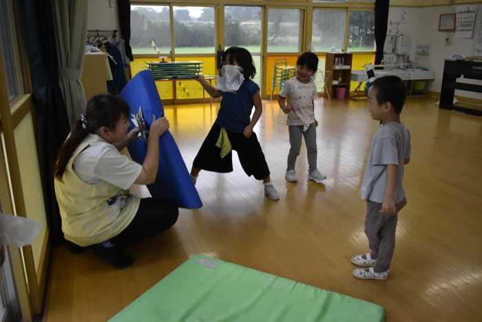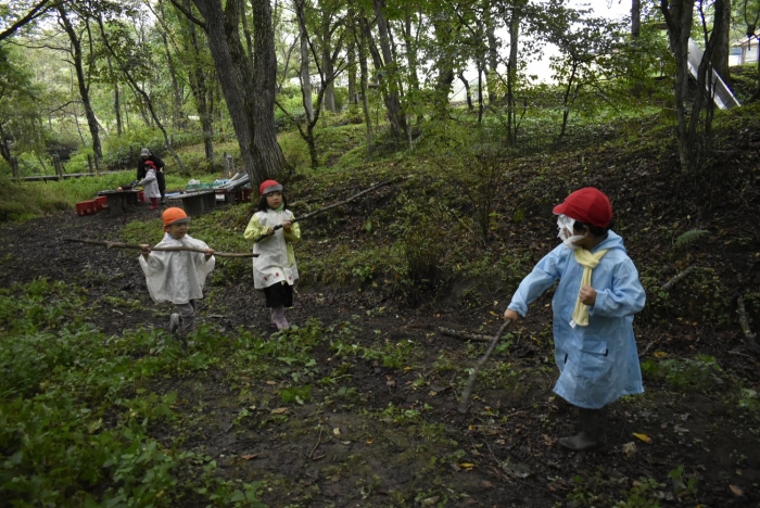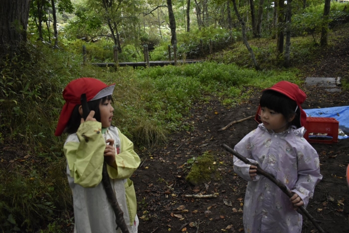 出来た衣装や武器を手に,今日も忍びの戦いをしようと戸外へ繰り出す年長児をみて,一緒に遊んで楽しかった思いのある年中児が仲間に加わったり,興味を引かれ初めて仲間入りする年中児の姿もありました。友達が考えたルールで遊ぶとやっぱり楽しい!と相手のことを認めたり,チームを組んでの戦いに楽しさを見出したり,互いに試行錯誤しながら遊びを展開していた子ども達です。