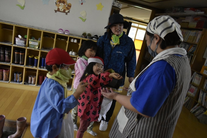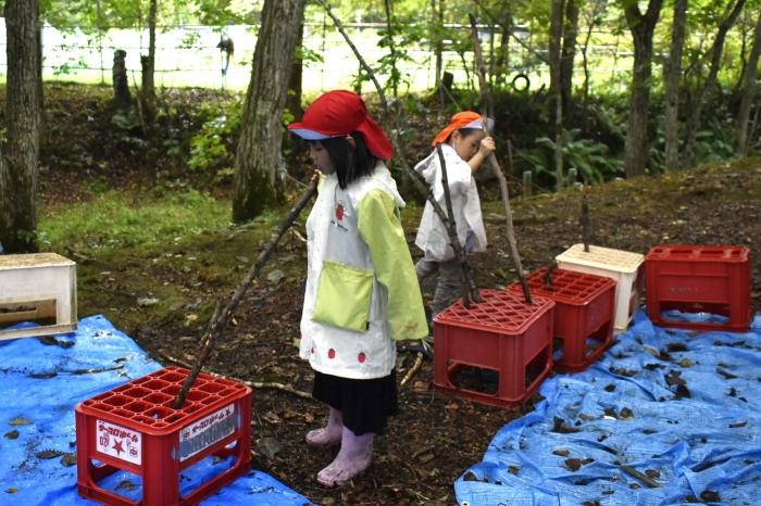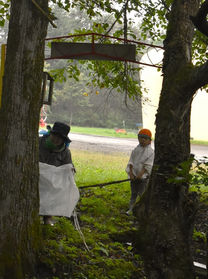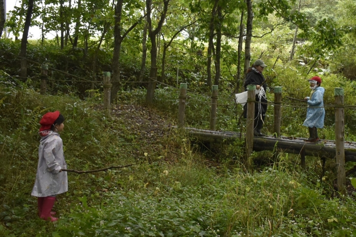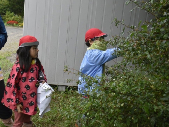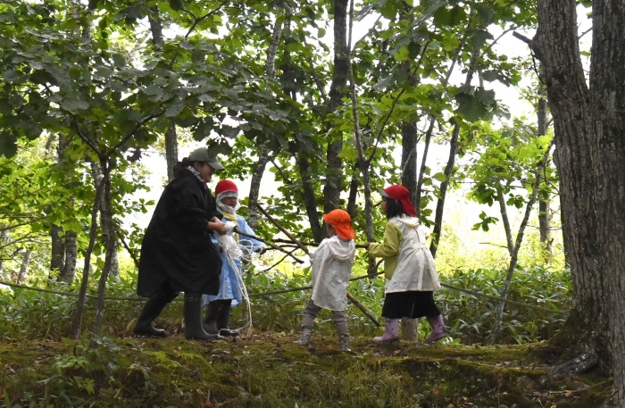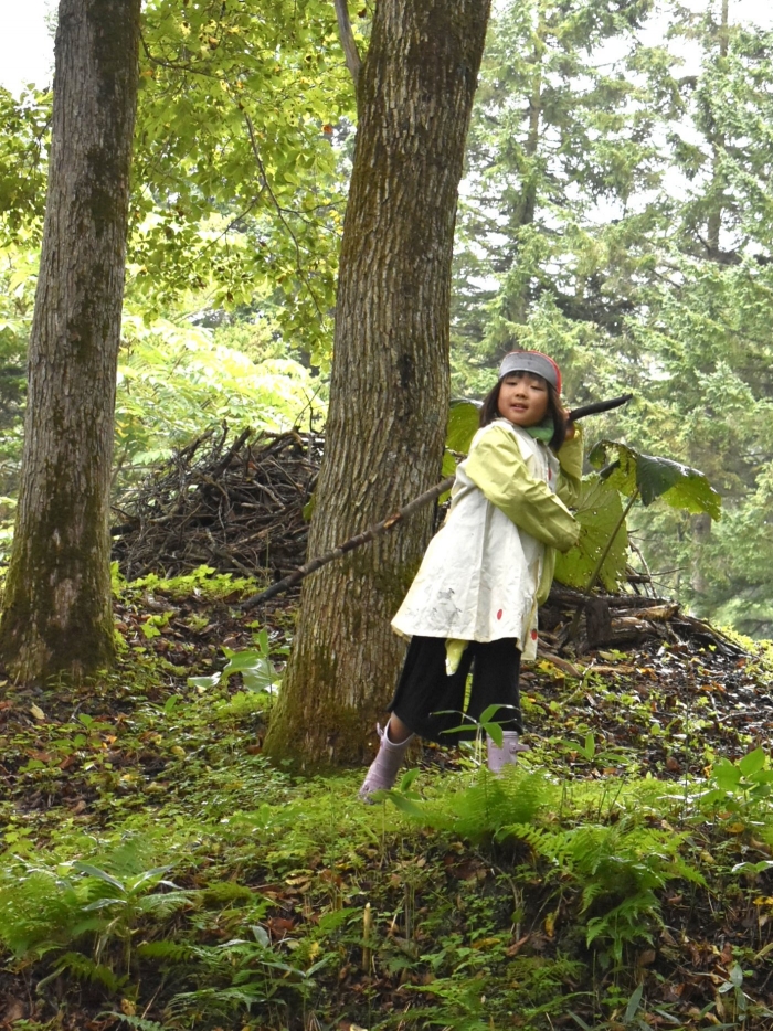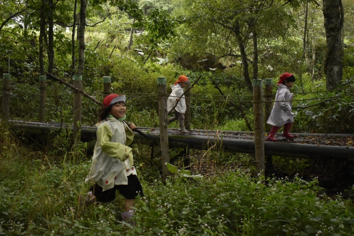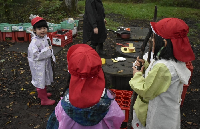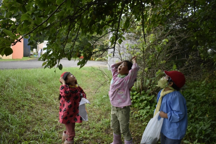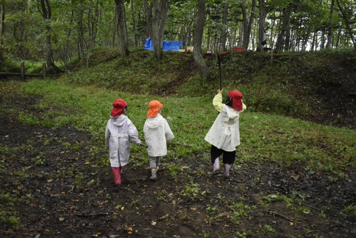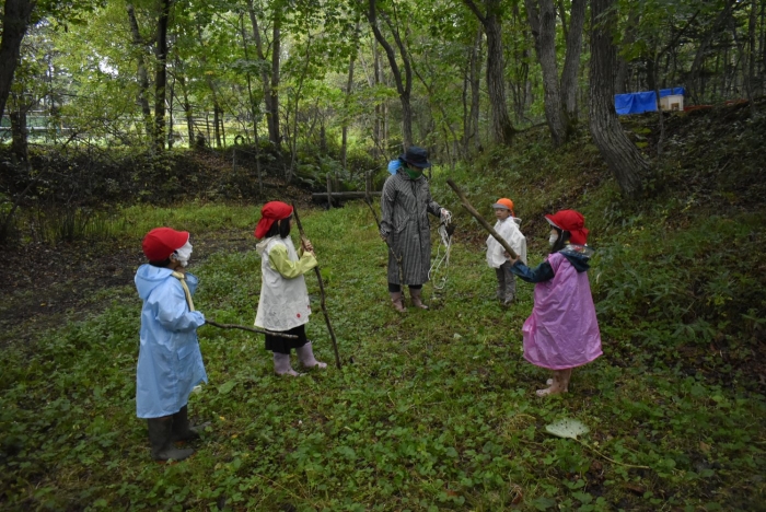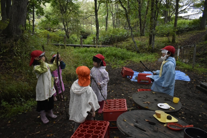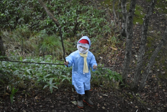 出来た衣装や武器を手に,今日も忍びの戦いをしようと戸外へ繰り出す年長児をみて,一緒に遊んで楽しかった思いのある年中児が仲間に加わったり,興味を引かれ初めて仲間入りする年中児の姿もありました。友達が考えたルールで遊ぶとやっぱり楽しい!と相手のことを認めたり,チームを組んでの戦いに楽しさを見出したり,互いに試行錯誤しながら遊びを展開していた子ども達です。