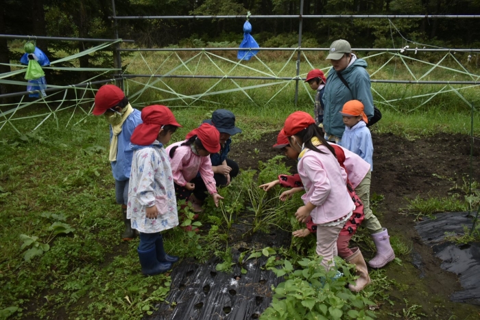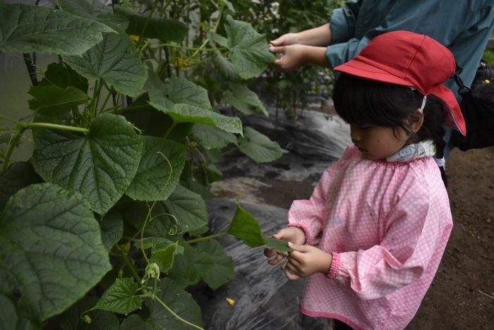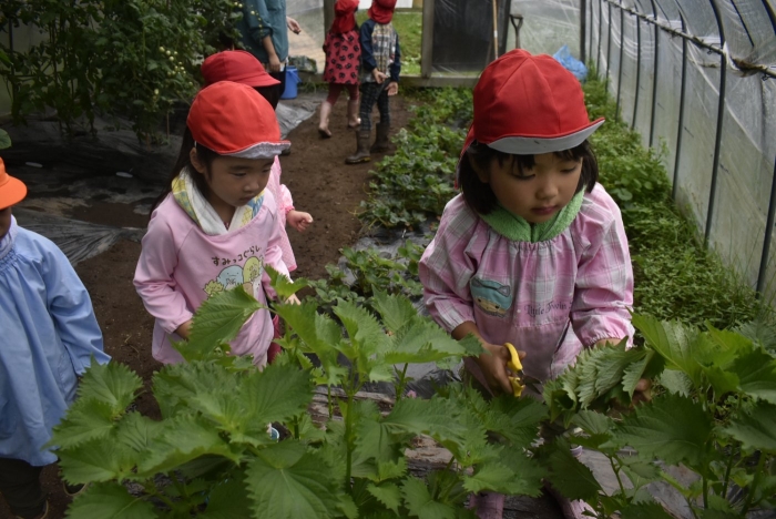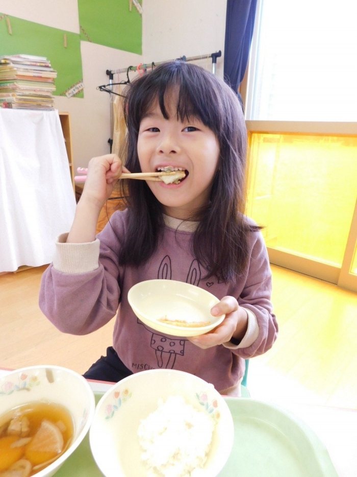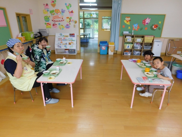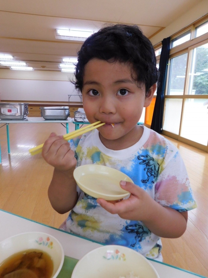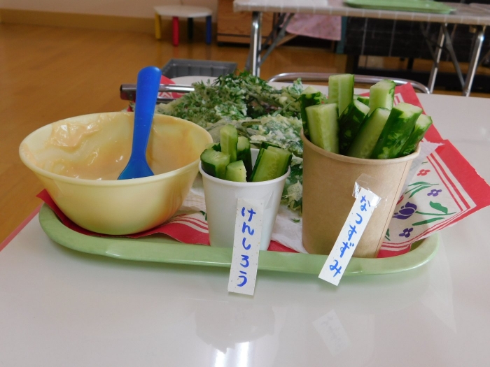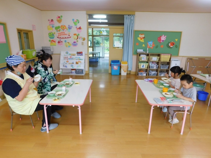 全園集会での『五感で感じよう』の話も思い起こし,植えてある野菜の葉の香りを嗅いだり,触ったり,収穫した野菜を様々な形で調理してもらい,よ~く味わっていた子ども達。採ったばかりの野菜が食卓に並ぶ喜び,食べ比べることで興味をもって味わうなど,食材を身近に感じられることで豊かな食体験につながっています。