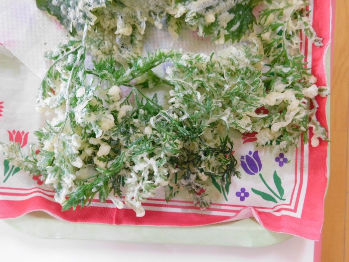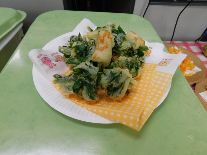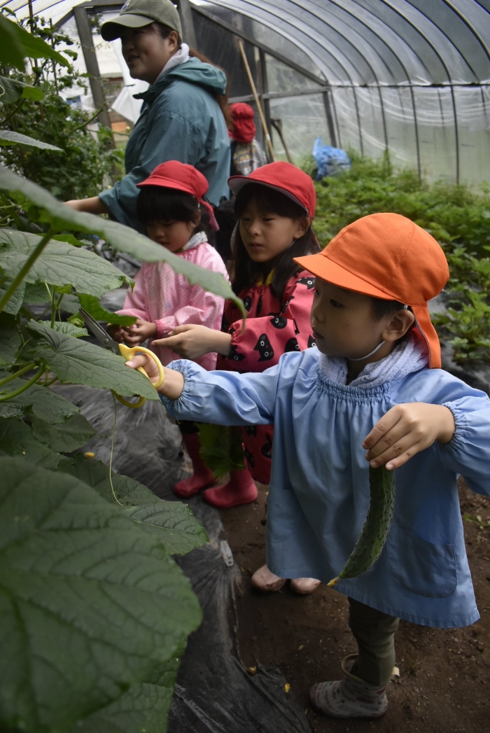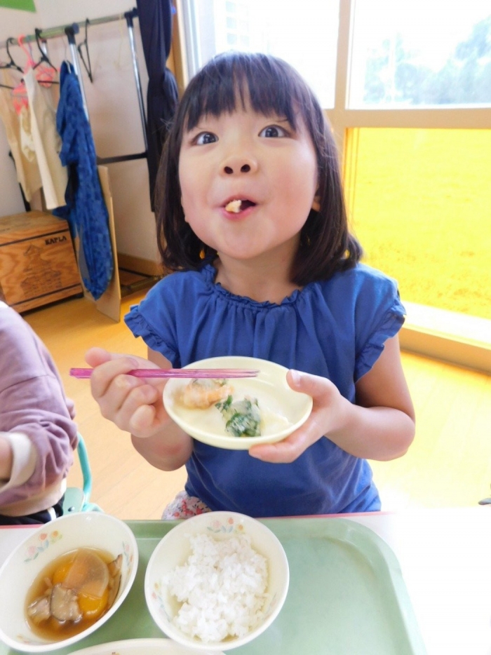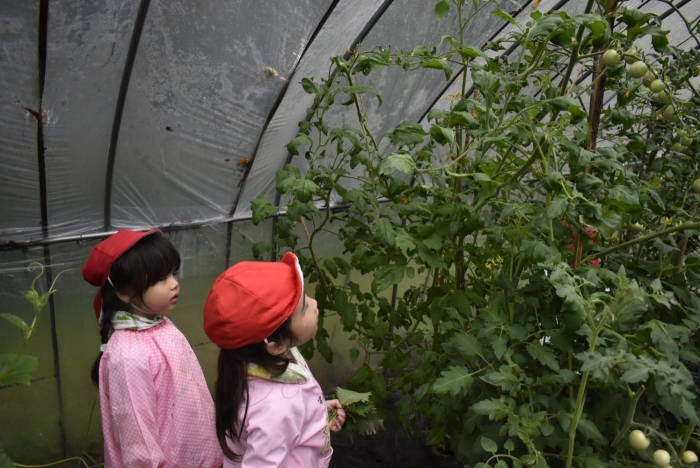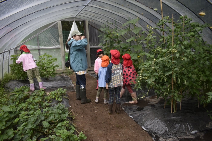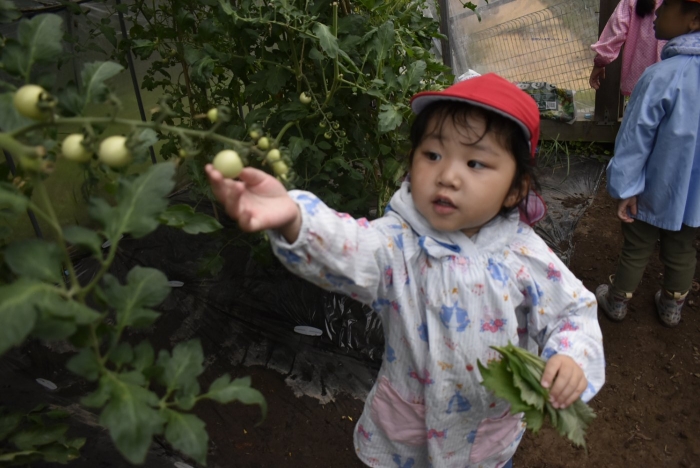 全園集会での『五感で感じよう』の話も思い起こし,植えてある野菜の葉の香りを嗅いだり,触ったり,収穫した野菜を様々な形で調理してもらい,よ~く味わっていた子ども達。採ったばかりの野菜が食卓に並ぶ喜び,食べ比べることで興味をもって味わうなど,食材を身近に感じられることで豊かな食体験につながっています。