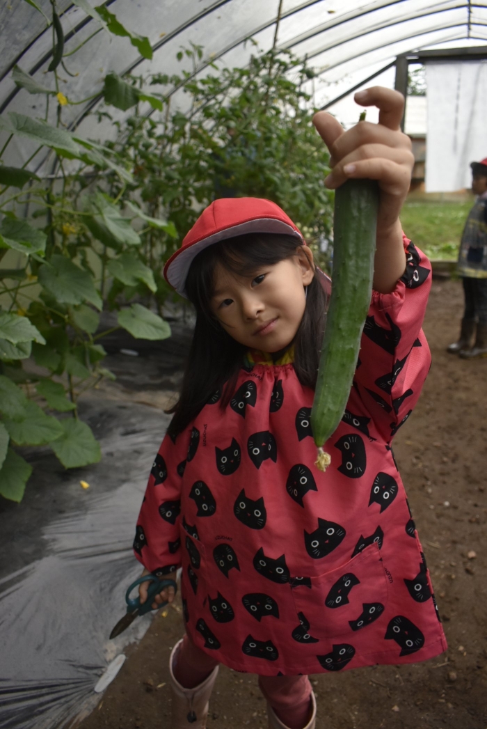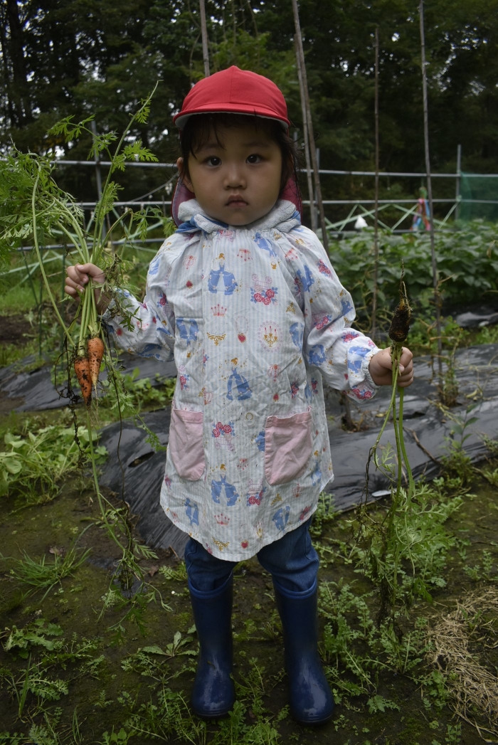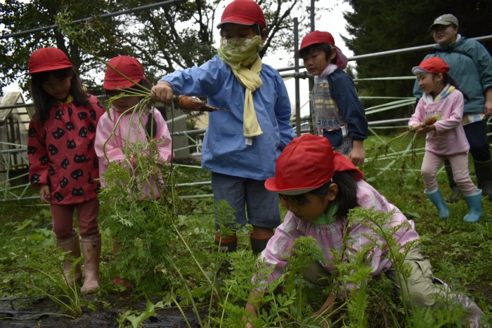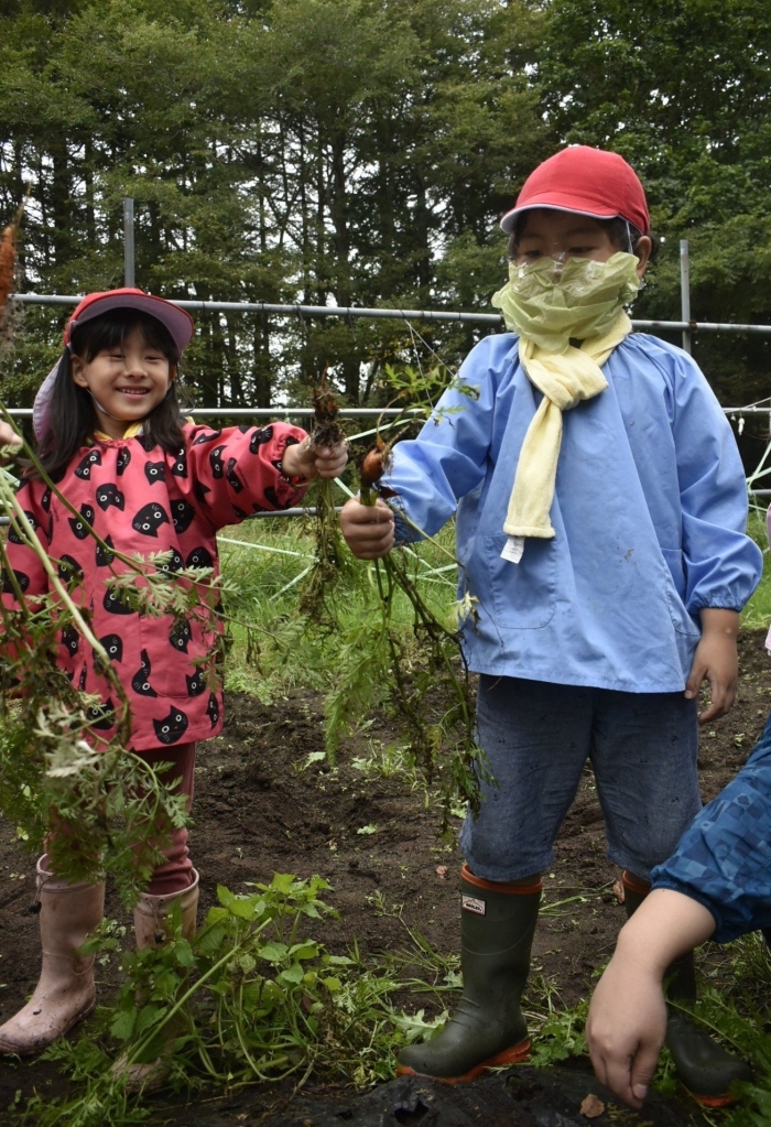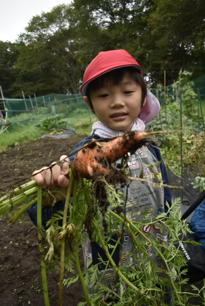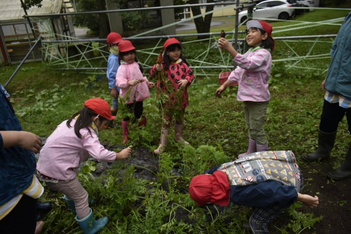 昨日,「大きくなったかな?」と気に掛けていたニンジンを収穫! 間引きした時は,小指くらいの大きさだった実が土の中でどうなっているのか,わくわくしながら引き抜いていました。大小様々な形,中には半分腐っているのも出できて,友達や先生と一喜一憂しながら収穫を楽しんでいました。
