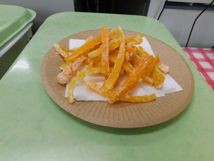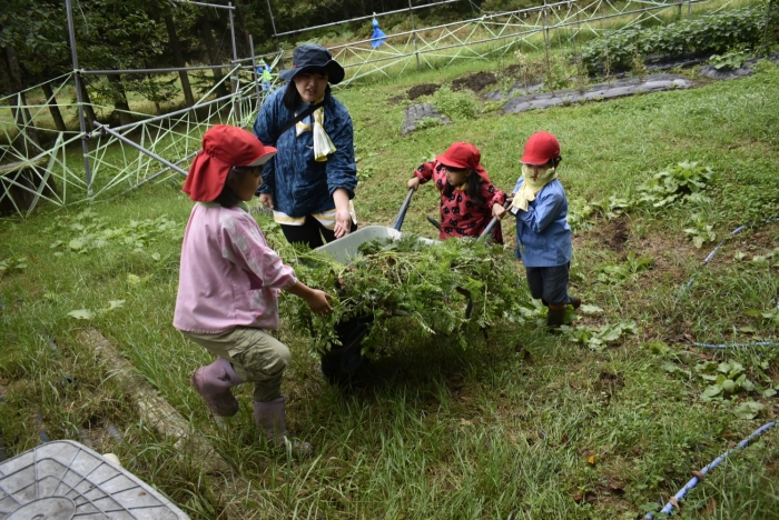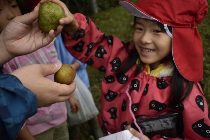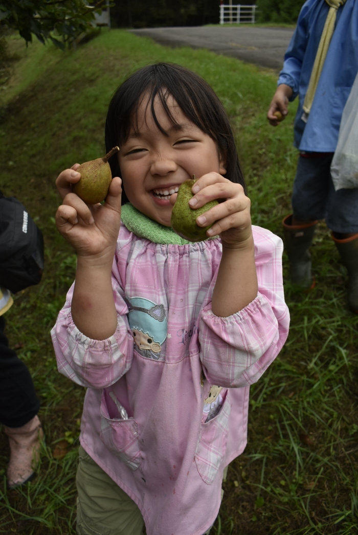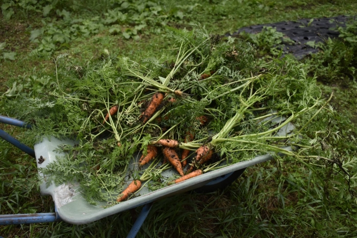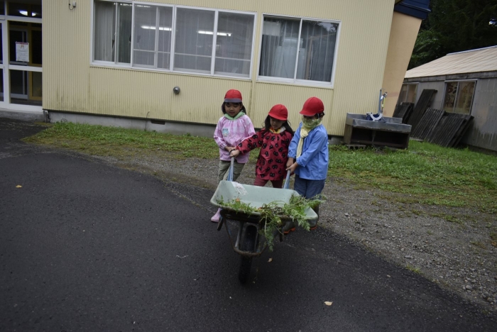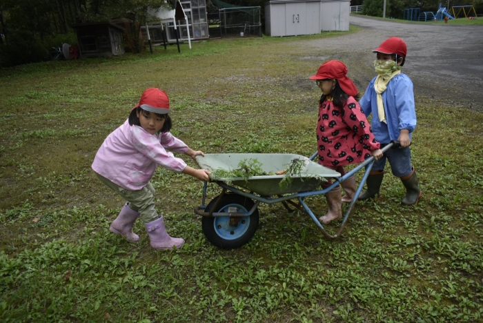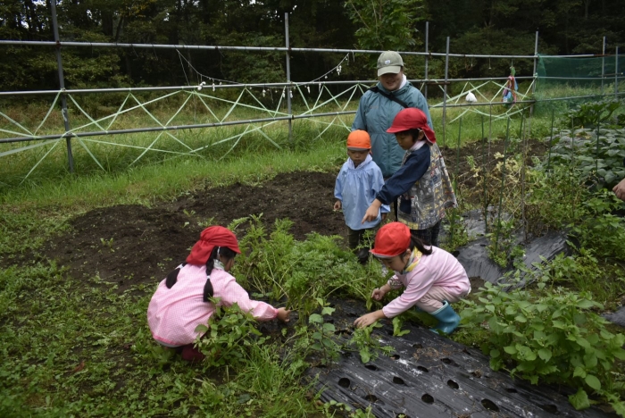 昨日,「大きくなったかな?」と気に掛けていたニンジンを収穫! 間引きした時は,小指くらいの大きさだった実が土の中でどうなっているのか,わくわくしながら引き抜いていました。大小様々な形,中には半分腐っているのも出できて,友達や先生と一喜一憂しながら収穫を楽しんでいました。