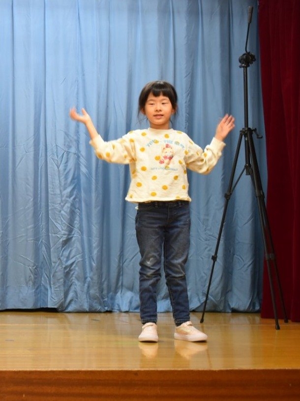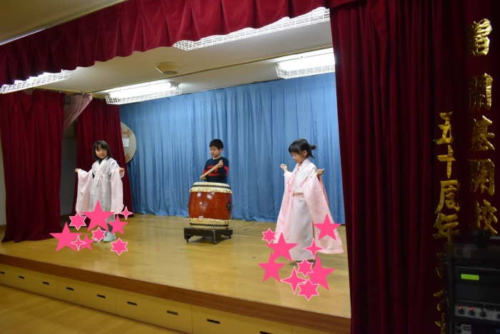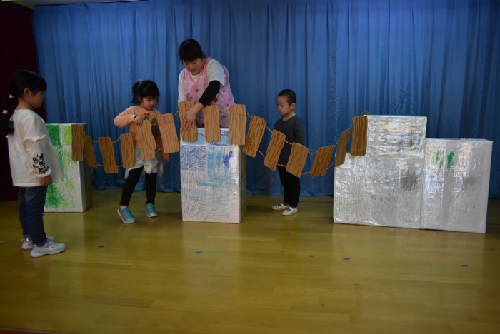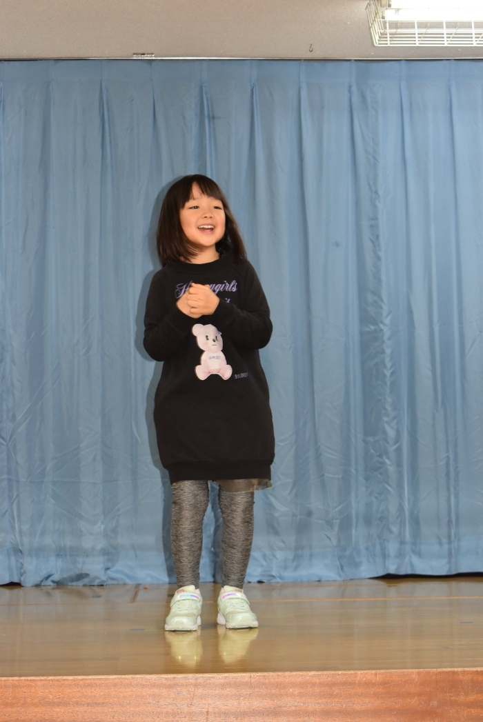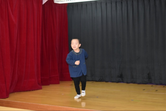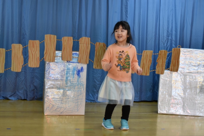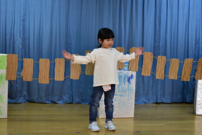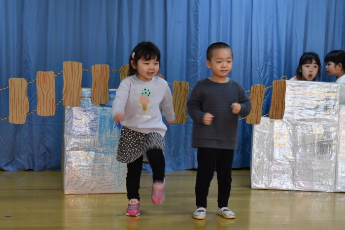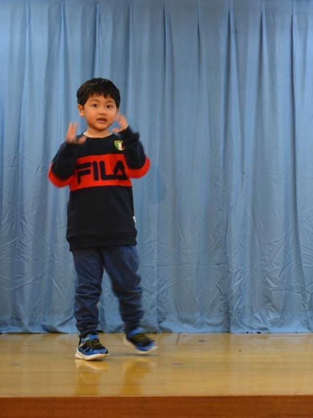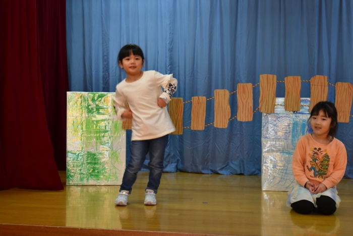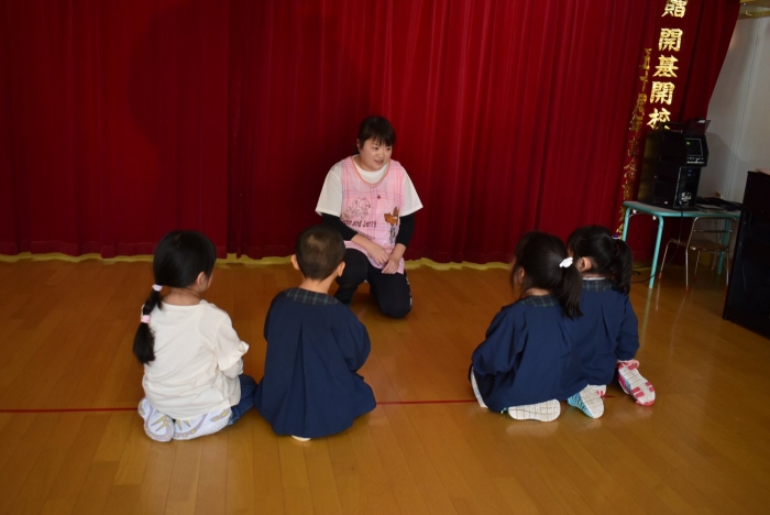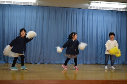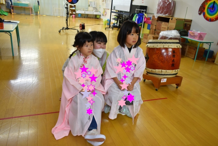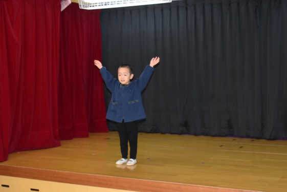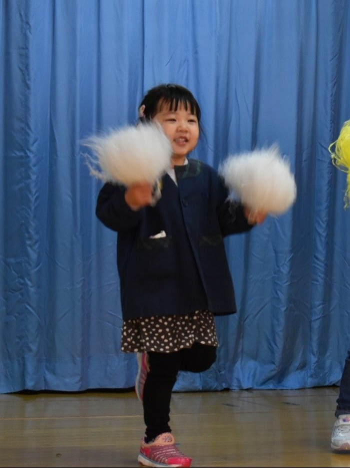 年長組では,劇,遊戯を行っていました。年長組になったら自分も…と,憧れを抱いていた言語劇や,着物・太鼓の遊戯に意欲的に取り組んでいました。早くもセリフを覚え(自主練),感情を込めて演じる姿には,この舞台を成功させたい!! そんな気迫があります。自分が演じることの楽しさはもちろん,友達のよさも認めながら取り組んでいる姿には大きな成長を感じます。