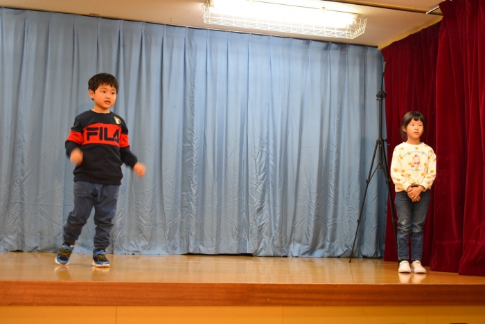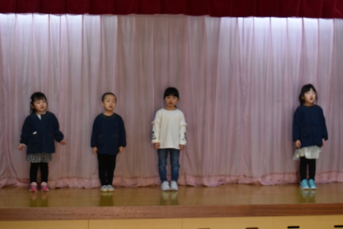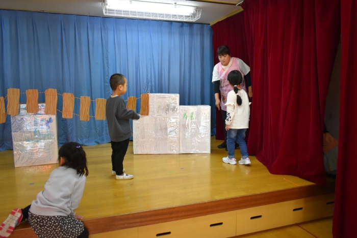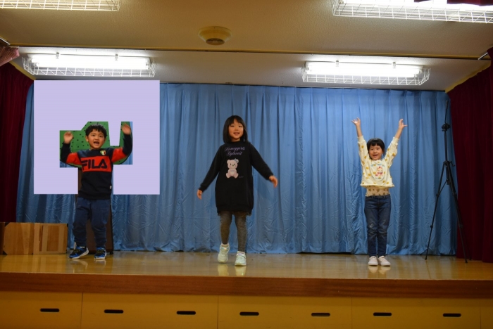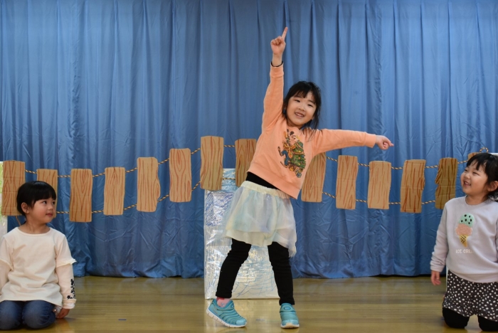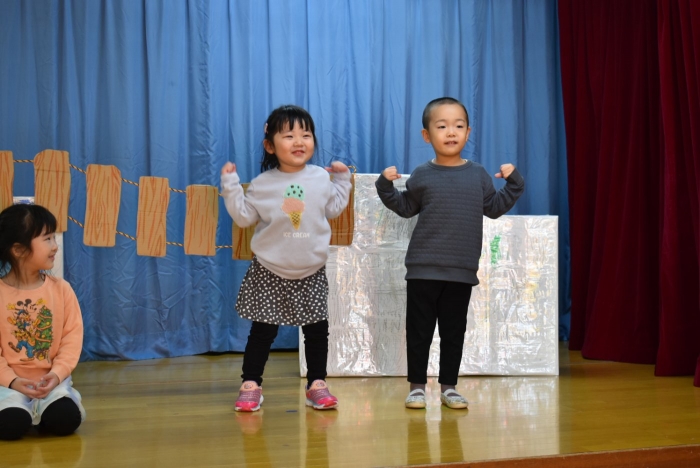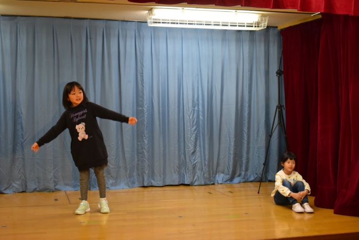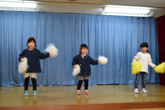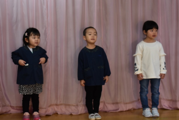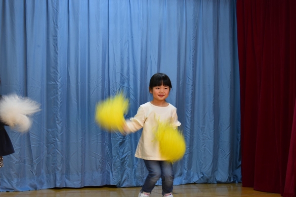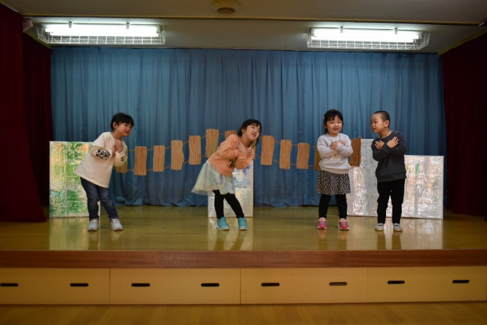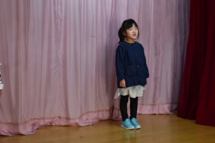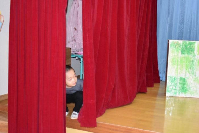 発表会まで,後10日余りとなりました。今週からは,各クラス交代で本格的にステージ練習に取組んでいます。年少・年中組では,歌,遊戯,オペレッタを行っていました。お客さん(担任・クラス外の人)の目があると緊張感を漂わせていた子も,ステージ発表での年長組の姿勢に刺激を受け,客席に目を向け歌ったり,互いの遊戯を見合ったりステージ下で一緒になって踊る姿がありました。自分のやりたい役になりきって演じている姿,友達と一緒で楽しい♪ そんな笑顔にあふれているステージは,見ている方も楽しくなります。舞台裏,自分の出番を今か今かと心待ちにしている姿も,微笑ましいものがあります。 お客さんからは,かなり丸見えですけど(笑)