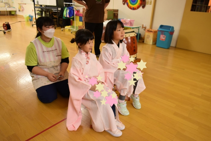 そして,遊戯練習ではスペシャルゲスト『中西別草原太鼓保存会』の指導者,武藤師匠にお越しいただきました☆彡 今年は,太鼓と着物の演舞を融合させた演目に挑戦する年長組。それに合った太鼓の振付や打ち方を伝授してもらいました。構えの姿勢,指先・足先まで意識した所作を分かりやすく丁寧に教わった年長児。その後は,ひと味違うキレのある踊り方となっていました。さすが師匠です☆彡