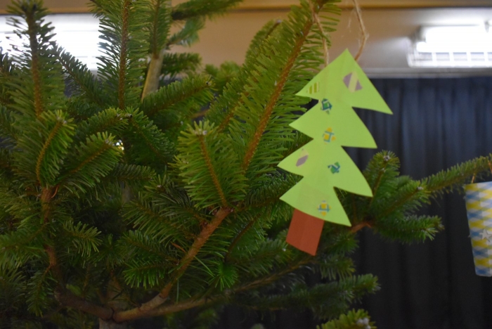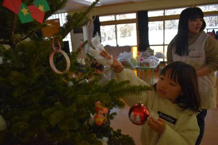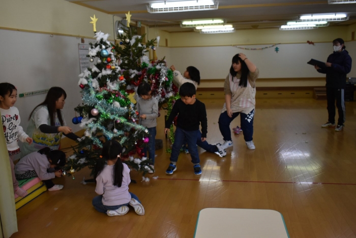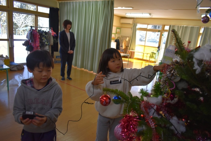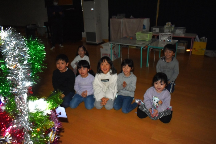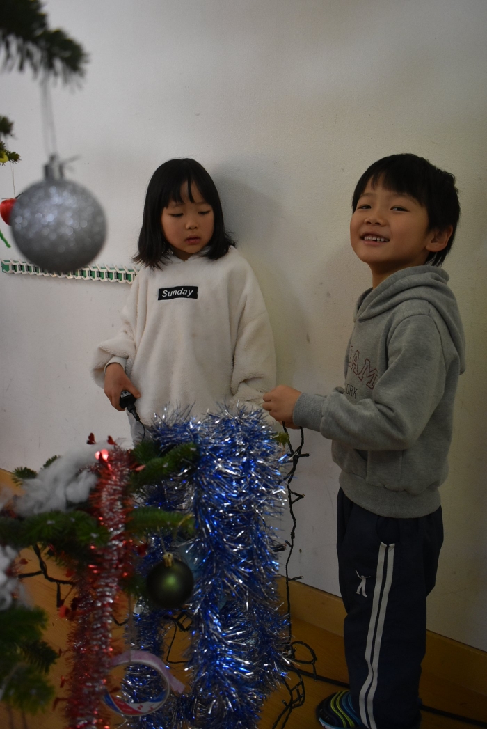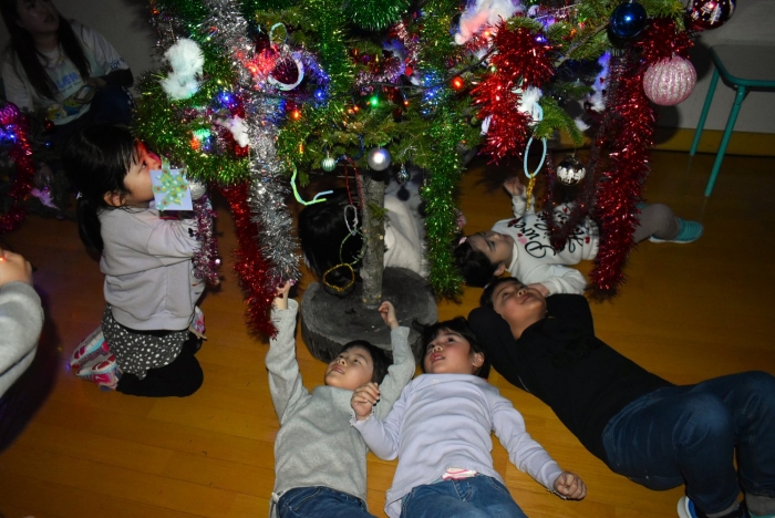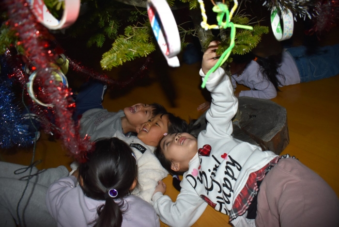 最後に電飾も巻き付け,カウントダウンで『点灯式』も行いました。 パッ☆彡とツリーが光り輝いた瞬間,「わぁ~」と感動の声を上げていた子ども達。 ツリーの下に潜り込み,星空を眺めるようにXmasツリーを見上げながら,幻想的な美しさを友達同士で共感し合っていました。