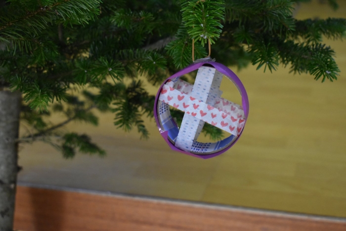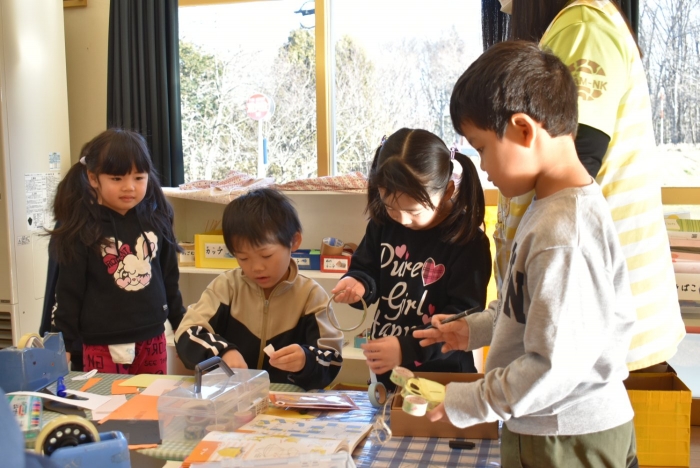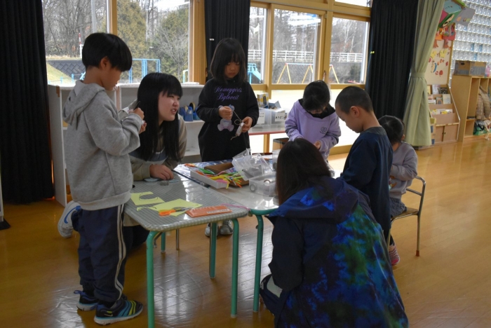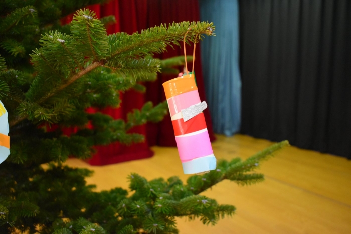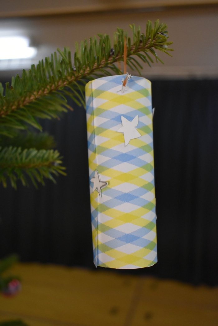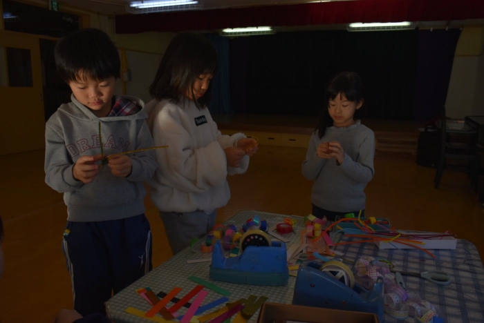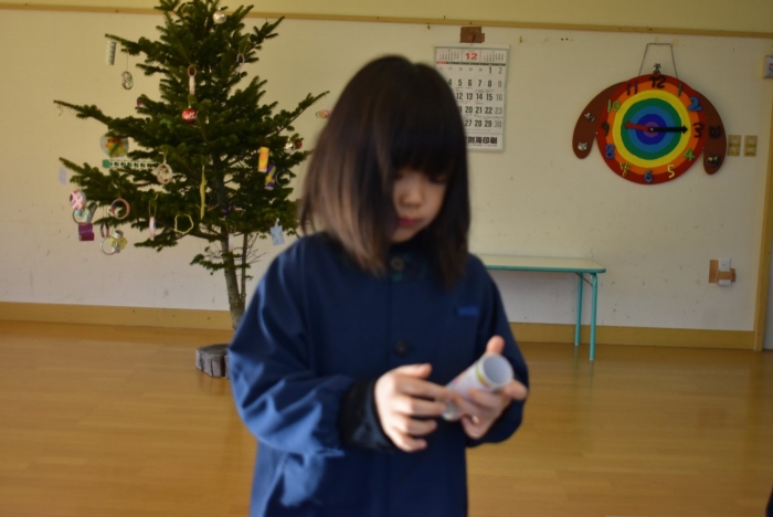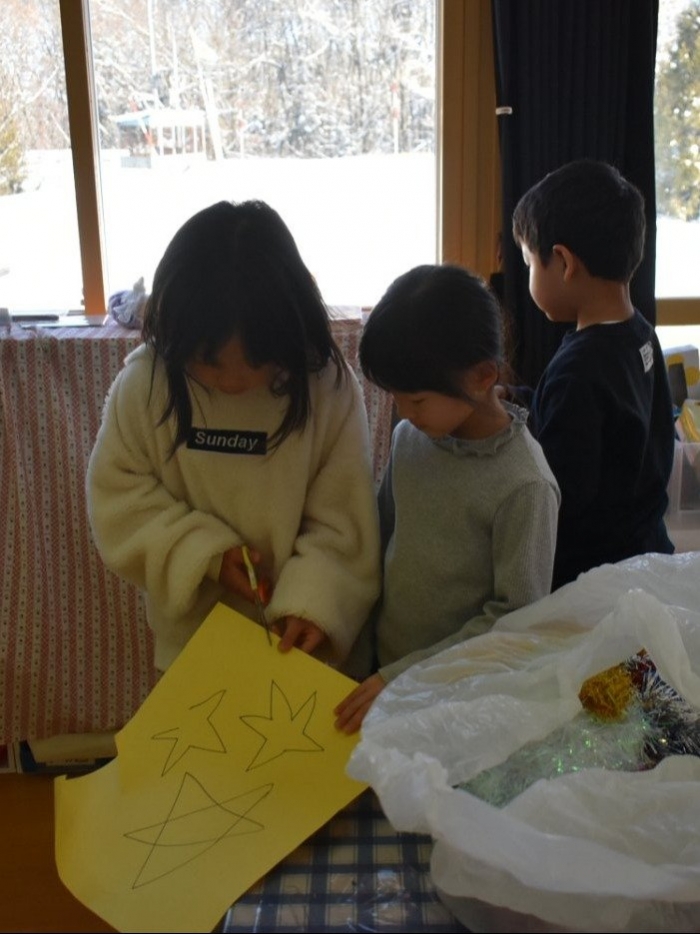 最後に電飾も巻き付け,カウントダウンで『点灯式』も行いました。 パッ☆彡とツリーが光り輝いた瞬間,「わぁ~」と感動の声を上げていた子ども達。 ツリーの下に潜り込み,星空を眺めるようにXmasツリーを見上げながら,幻想的な美しさを友達同士で共感し合っていました。