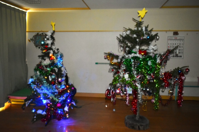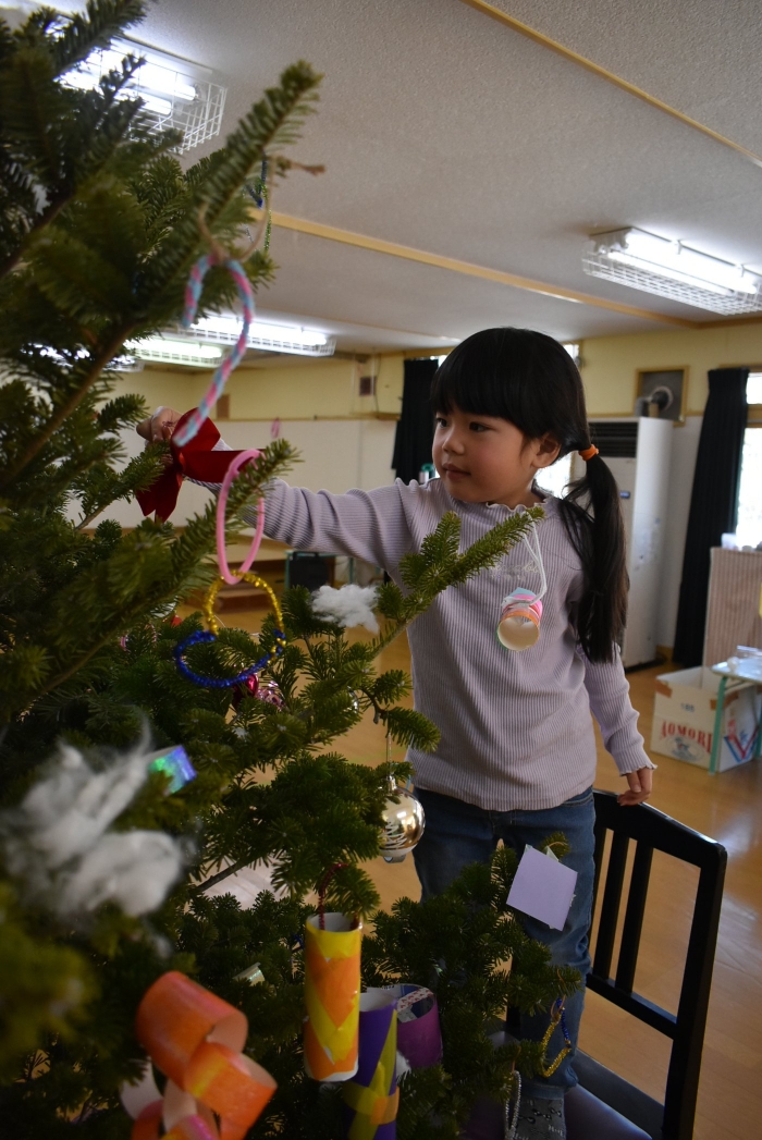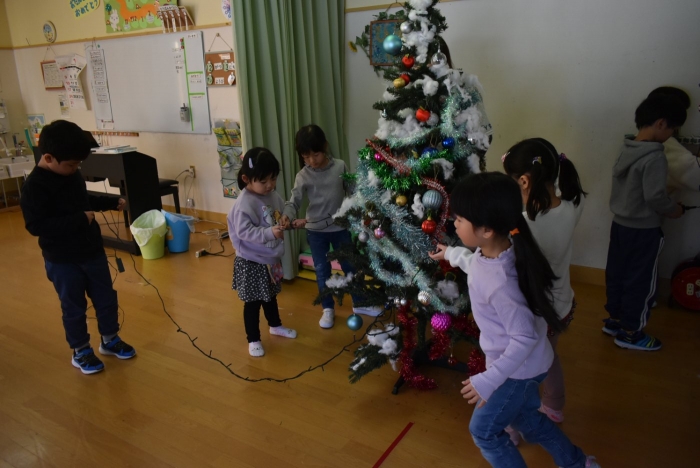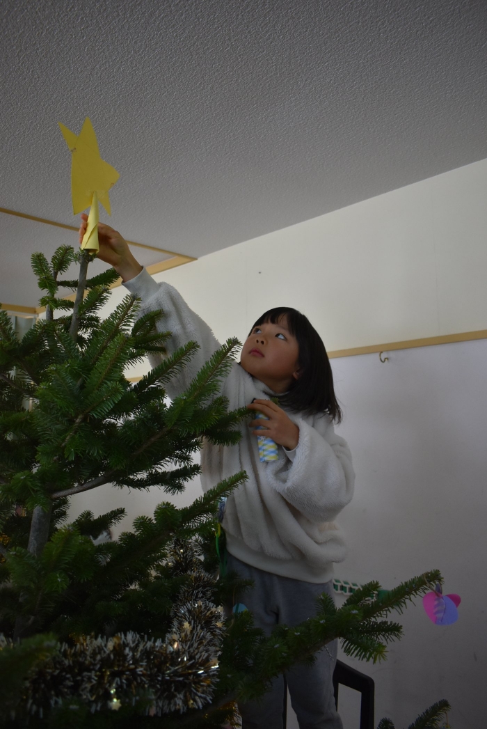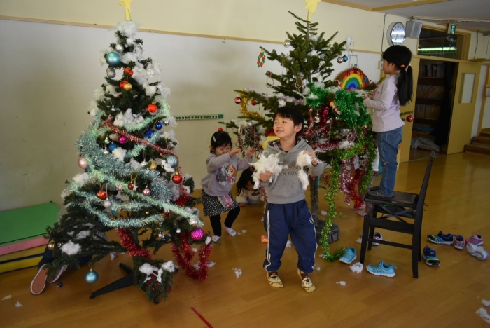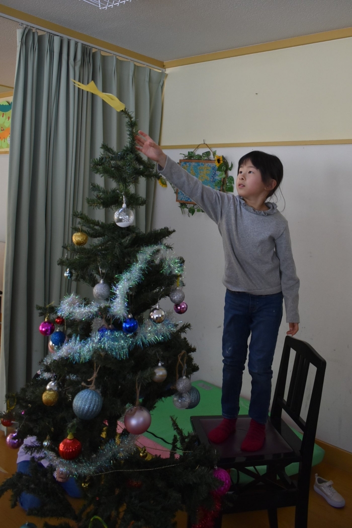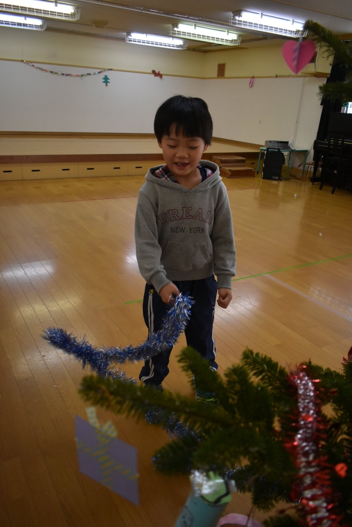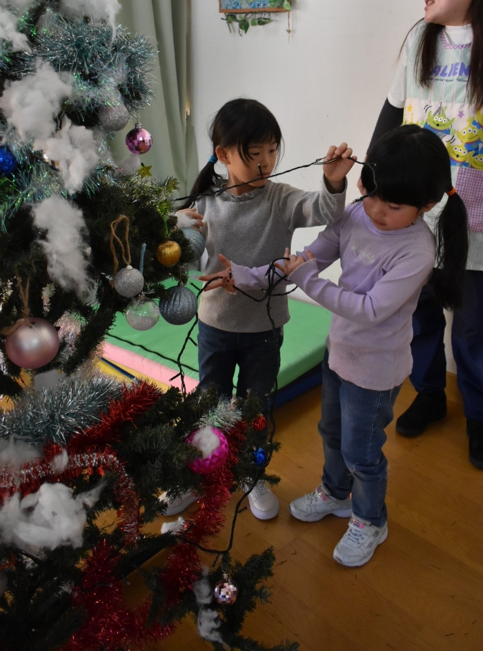 『サンタさんが(プレゼントを持って)来てくれますように…』と願いを込めながら,毎日コツコツ飾りを作ってはツリーや窓辺,壁に飾付けをしていた子ども達。そして, 明日は『クリスマスお楽しみ会』ということで,原木ツリーや幼稚園ツリーを更にきらびやかに飾付けました。「窓の外からも,サンタさんに気づいてもらえるように!」「サンタさんに喜んでもらえるように!!」と,代々受け継がれてきたオーナメントやパーティーモール,綿の雪を これでもか!! というくらい装飾(笑) ツリーの天辺には,思いの込もった年長児作の星も輝いています☆彡