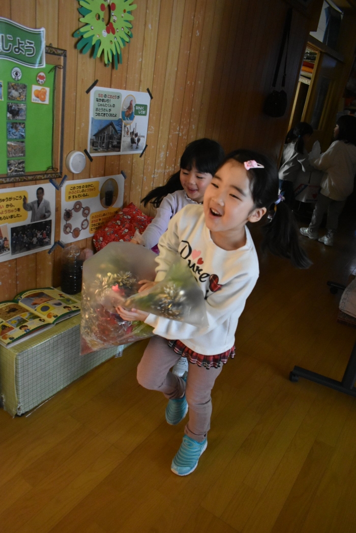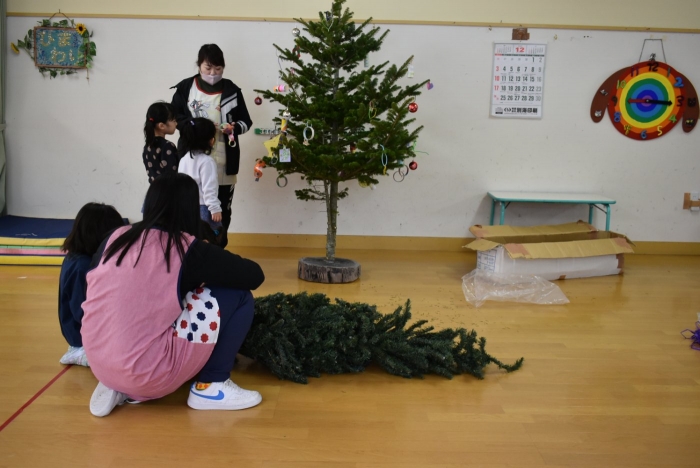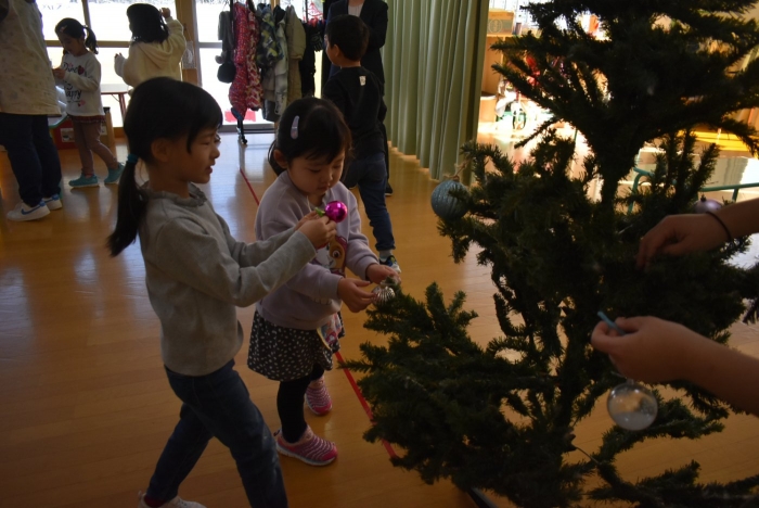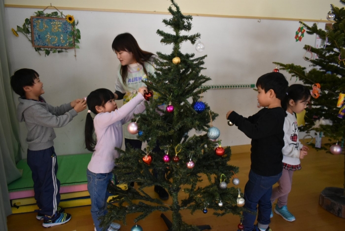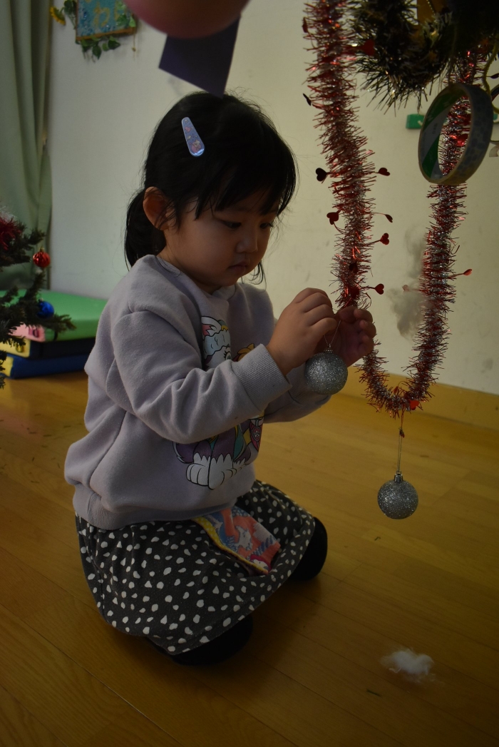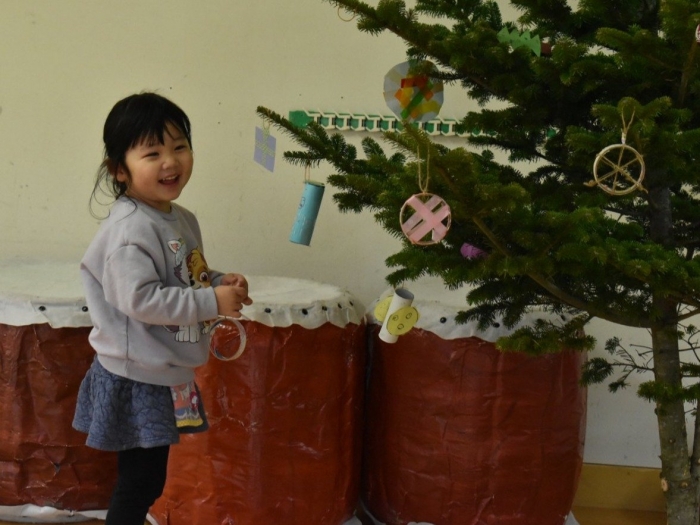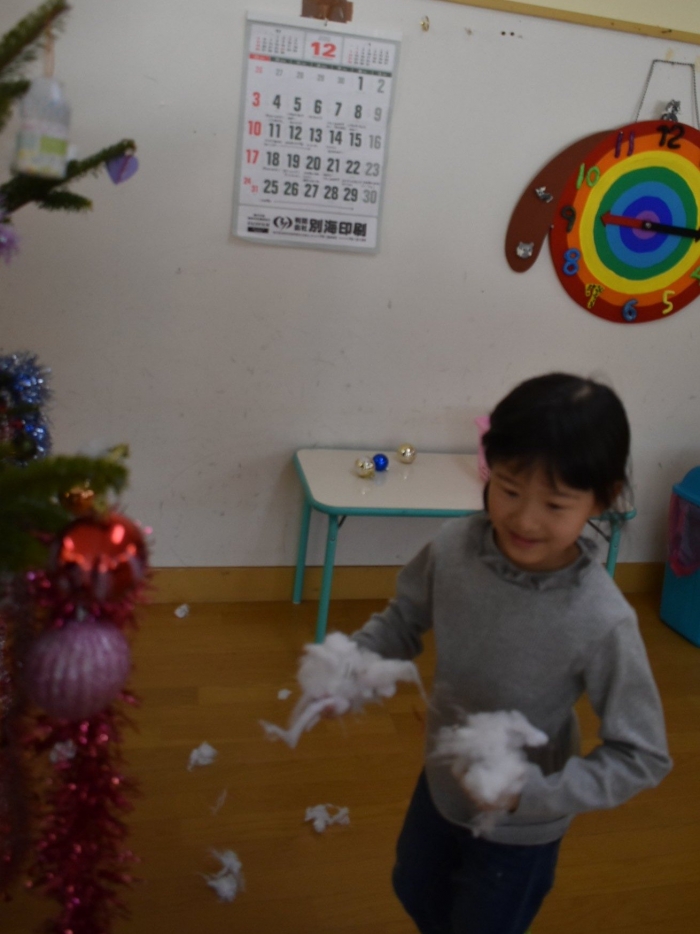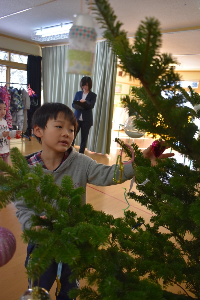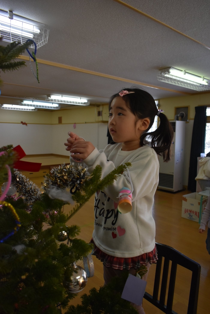 『サンタさんが(プレゼントを持って)来てくれますように…』と願いを込めながら,毎日コツコツ飾りを作ってはツリーや窓辺,壁に飾付けをしていた子ども達。そして, 明日は『クリスマスお楽しみ会』ということで,原木ツリーや幼稚園ツリーを更にきらびやかに飾付けました。「窓の外からも,サンタさんに気づいてもらえるように!」「サンタさんに喜んでもらえるように!!」と,代々受け継がれてきたオーナメントやパーティーモール,綿の雪を これでもか!! というくらい装飾(笑) ツリーの天辺には,思いの込もった年長児作の星も輝いています☆彡