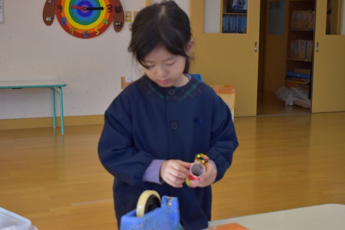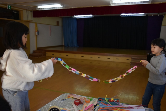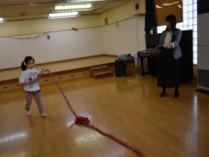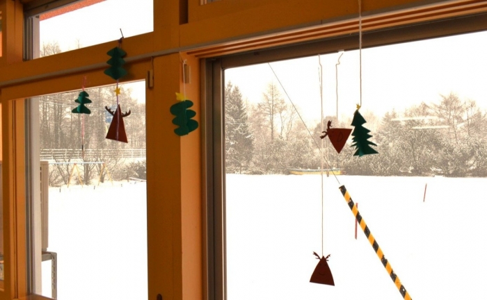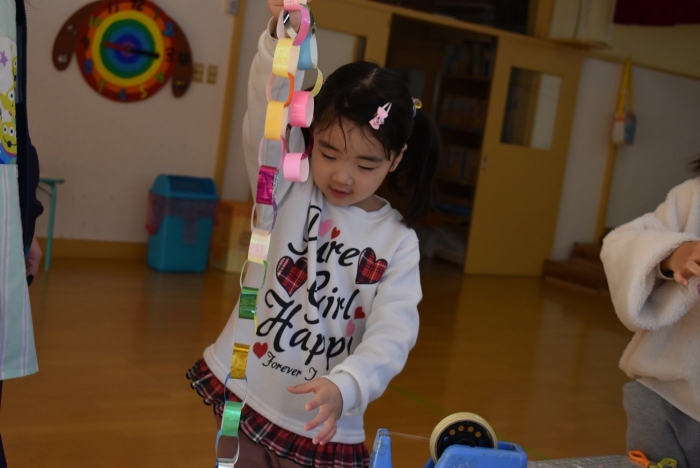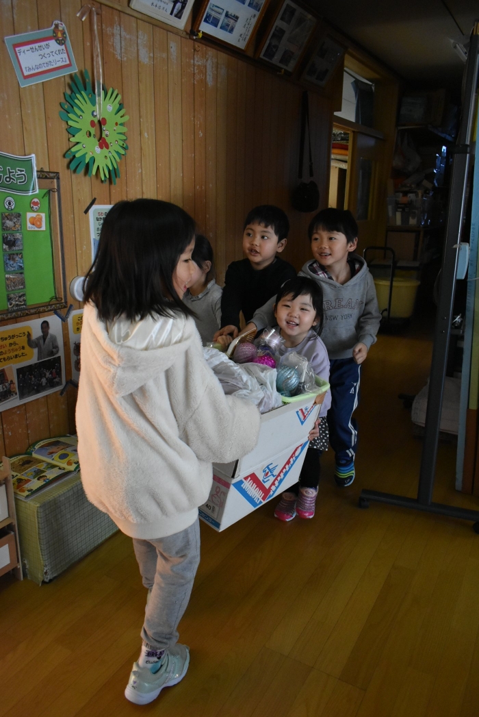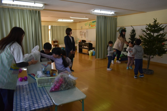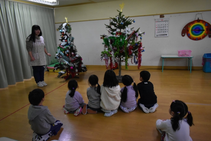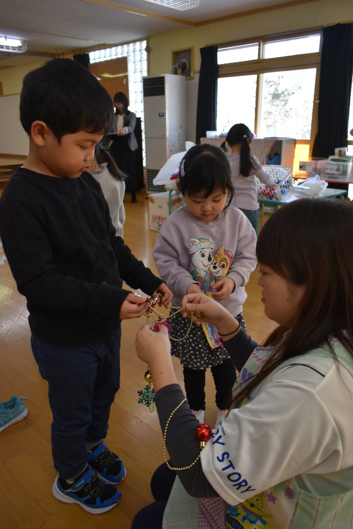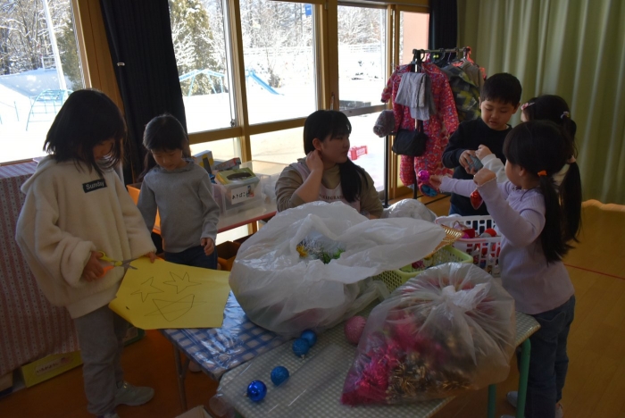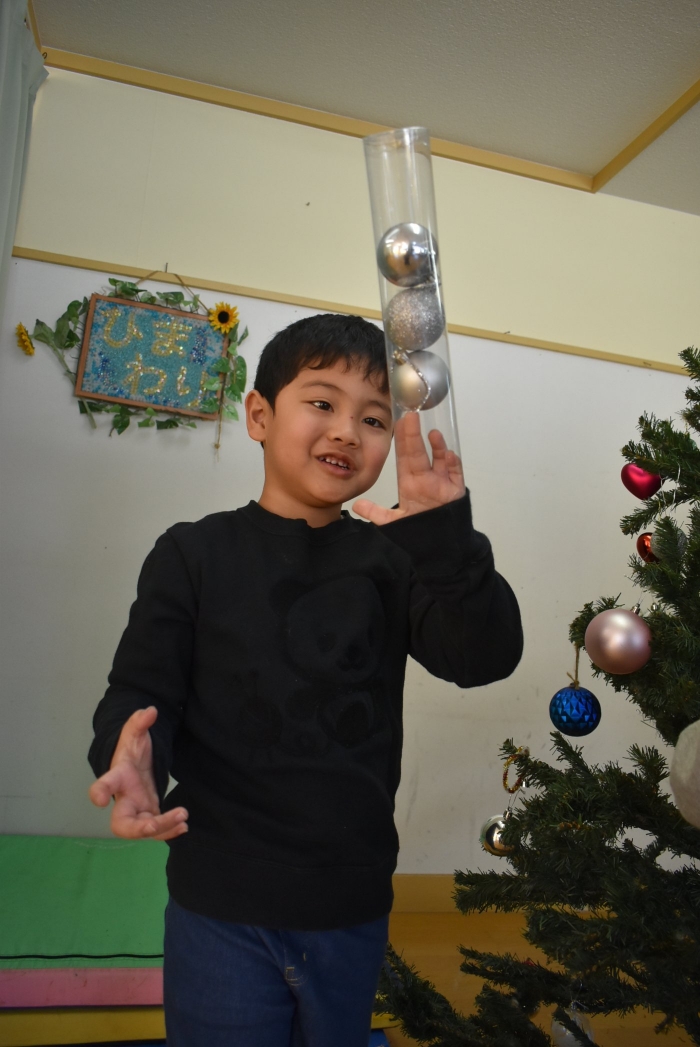 『サンタさんが(プレゼントを持って)来てくれますように…』と願いを込めながら,毎日コツコツ飾りを作ってはツリーや窓辺,壁に飾付けをしていた子ども達。そして, 明日は『クリスマスお楽しみ会』ということで,原木ツリーや幼稚園ツリーを更にきらびやかに飾付けました。「窓の外からも,サンタさんに気づいてもらえるように!」「サンタさんに喜んでもらえるように!!」と,代々受け継がれてきたオーナメントやパーティーモール,綿の雪を これでもか!! というくらい装飾(笑) ツリーの天辺には,思いの込もった年長児作の星も輝いています☆彡