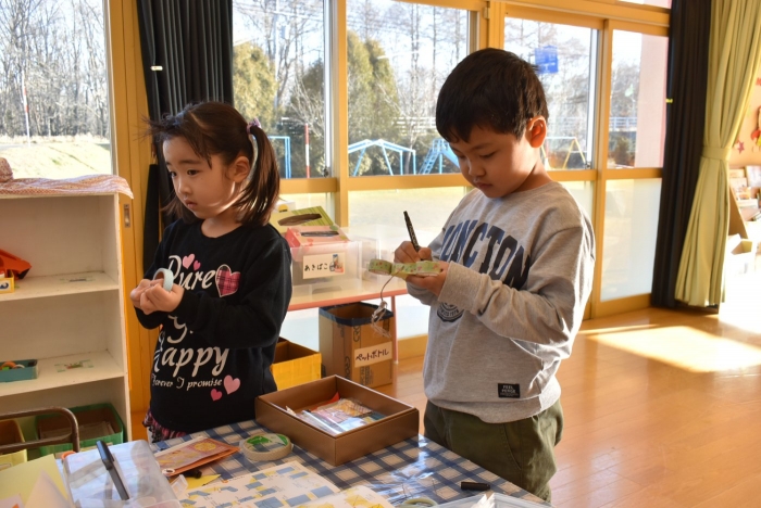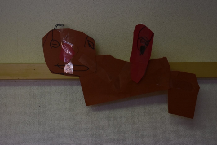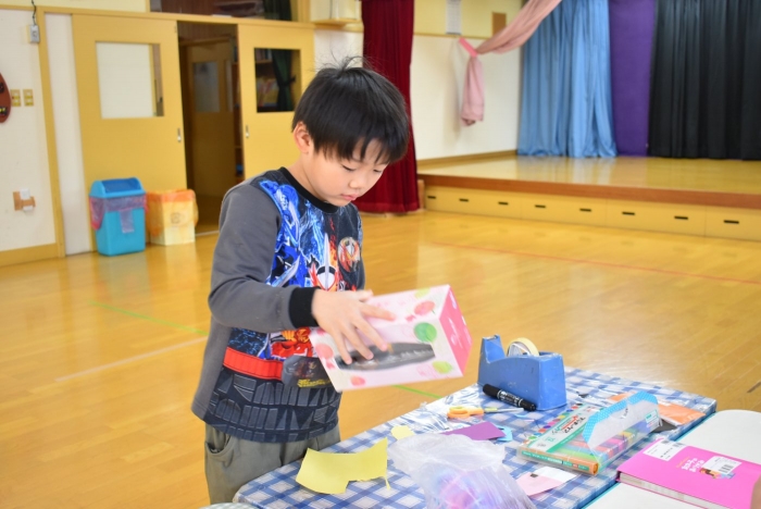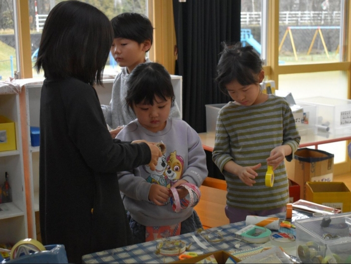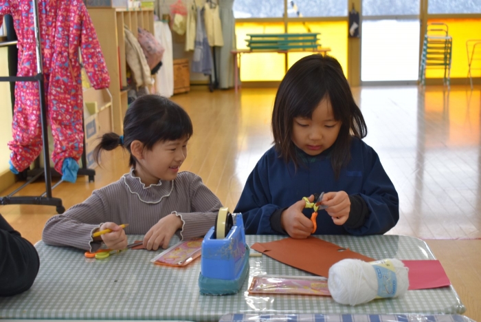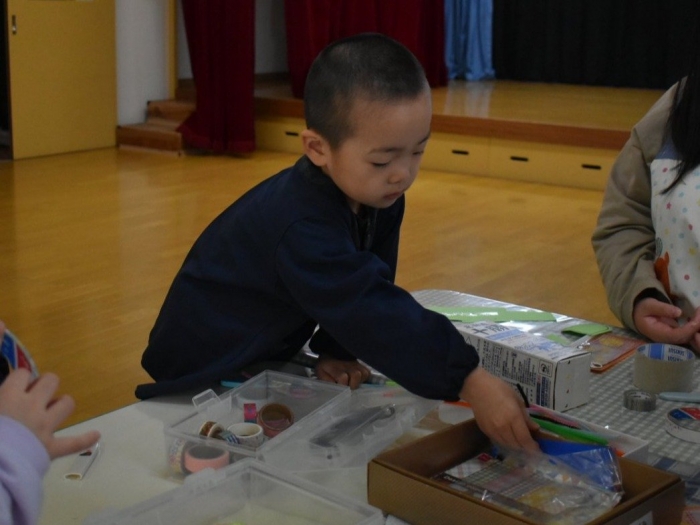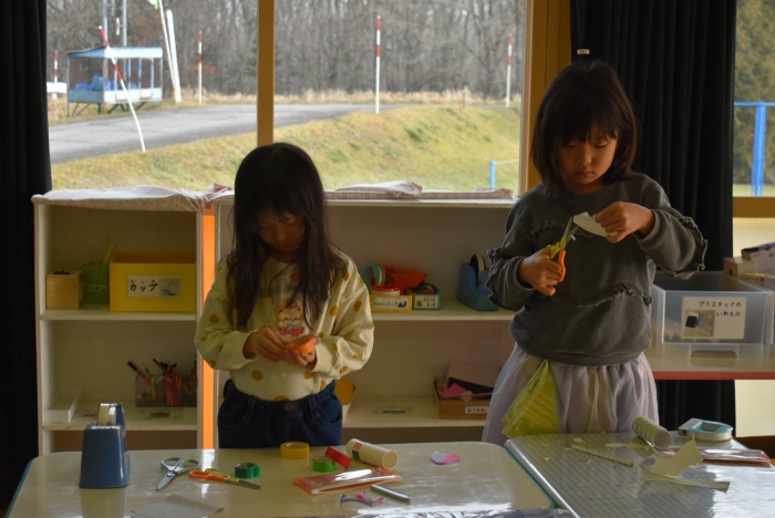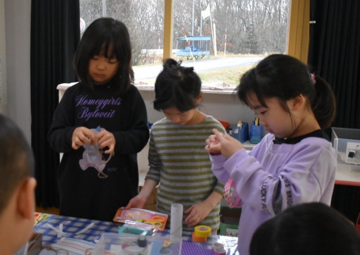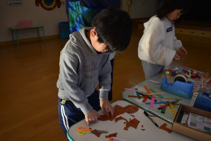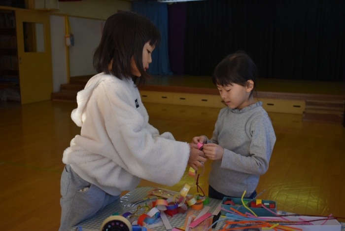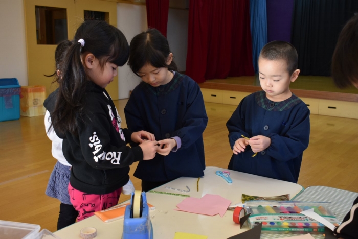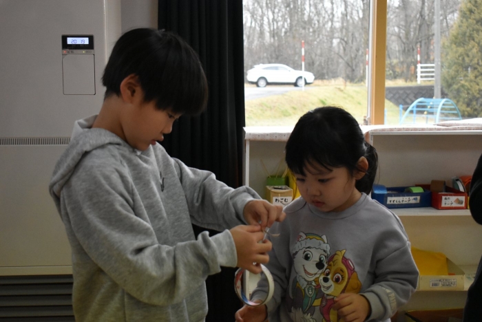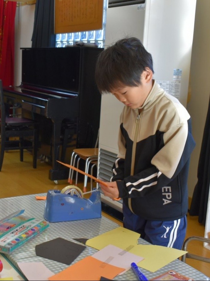 『サンタさんが(プレゼントを持って)来てくれますように…』と願いを込めながら,毎日コツコツ飾りを作ってはツリーや窓辺,壁に飾付けをしていた子ども達。そして, 明日は『クリスマスお楽しみ会』ということで,原木ツリーや幼稚園ツリーを更にきらびやかに飾付けました。「窓の外からも,サンタさんに気づいてもらえるように!」「サンタさんに喜んでもらえるように!!」と,代々受け継がれてきたオーナメントやパーティーモール,綿の雪を これでもか!! というくらい装飾(笑) ツリーの天辺には,思いの込もった年長児作の星も輝いています☆彡