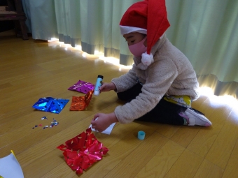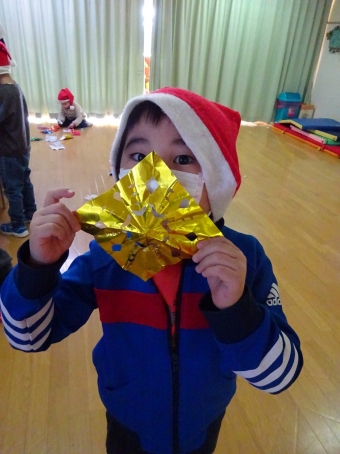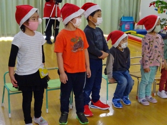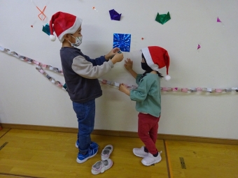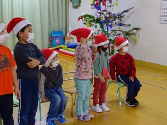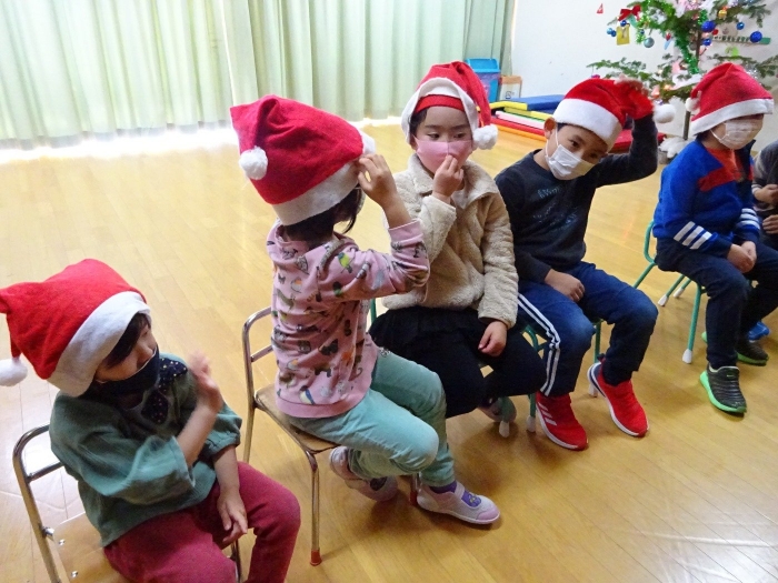 ワクワク楽しみに待っていた『クリスマスお楽しみ会』! ツリーへの飾り付けやクリスマス製作をしたり,サンタさんへの願いごとを描いたり…,クリスマス気分も最高潮で当日を迎えました。登園時には,先生方がサンタ衣装で子ども達をお出迎え☆彡 その後、子ども達もサンタ帽子を身に付け,会場設営へ☆彡 全園児のアイディアが満載☆ハイセンス!?なパーティー会場となりました。
