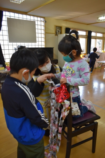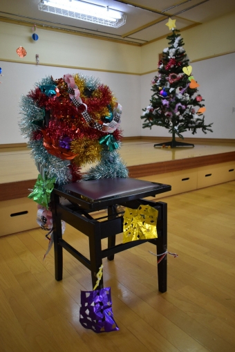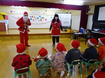素敵にセッティングできた会場で『クリスマスお楽しみ会』を開催☆彡 シルエットクイズやクリスマスバージョン玉入れ&リレー,そして,みんな大好き❤お馴染みの曲『あわてんぼうのサンタクロース』を歌いました。歌い終わると,♫リンリンリン…鈴の音と共にサンタさんが登場☆彡 突然の出来事に驚く子,今年も来てくれた!と喜ぶ子,一瞬思考が停止する子…。でも,『いい子の証』!?プレゼントを受け取ると,み~んな笑顔があふれていました。