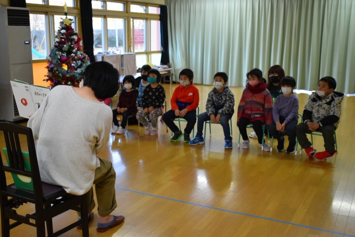 今回は,Xmasスペシャル☆彡2冊の絵本を読んでいただきました。読み手のお母さんが小さい頃読み聞かせしてもらったという『ぐりとぐらのおきゃくさま』,そして『『クリスマス☆げきじょう』という現代版クリスマス絵本を読んでいただきました。昔から語り継がれている『ぐりとぐら』の絵本は,いつの時代の子ども達にも愛されることを実感,クリスマスの不思議なお話4編が詰まった『クリスマス☆げきじょう』は子ども達から驚きと笑い声が! 世界観の違うクリスマスの物語を存分に味わった子ども達です。