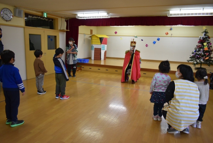 昨年度はコロナ禍により国王様の各園訪問(牛乳消費拡大事業の一環)は中止となりましたが,今年度は訪問可能に! 国王様をおもてなししようと,クリスマス仕様の煌びやかな椅子も準備して待ち望んでいた子ども達です。そして,国王様が到着!! 豪華な冠、真っ赤なマントという装いに,「この人がミルクの王様か~」と感動していましたが,話を聞くと残念ながら国王様は来られず,国王様の代理…なので第一王子様!? がお越しくださったそうです。子ども達からの質問に答えてくださったり、ヨーグルトのプレゼント(本日の給食デザートとして),一人ずつ握手&温かなお言葉をいただきました。後日,ヨーグルト以外の🎁も届くそうです。お楽しみに!
