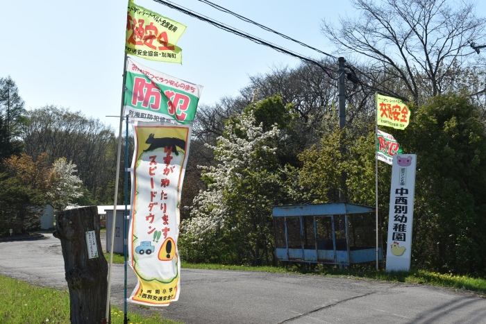 中西別交通安全協会協賛の下,中西別小学校の現4年生が手掛けた交通安全を呼び掛けるのぼり旗を,幼稚園門にも掲げていただきました。交通量の多い国道沿いで,車にひかれ命を落とす身近な野生動物リスの姿を目の当たりにしたことをきっかけに,交通安全の旗や看板を作成することになったそうです。中西別から上春別へ向かう通園路も,一瞬で命を落とすようなスピードで通り過ぎる車を多く見掛けます。この旗を目にし,少しでも安全運転に心掛けてもらえればと願います。