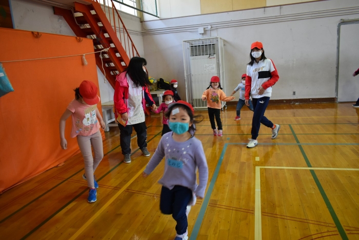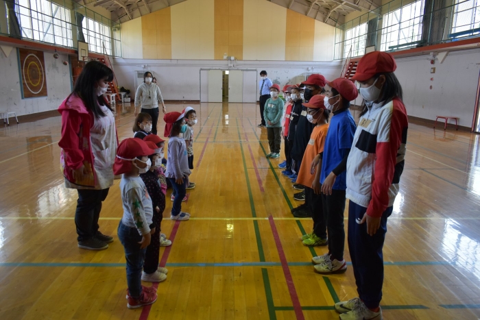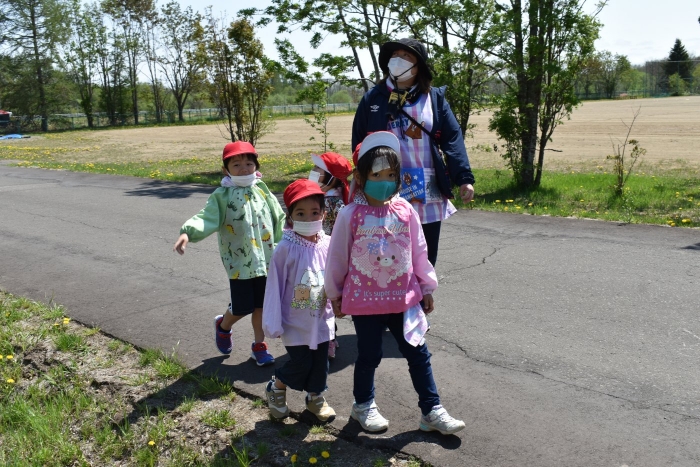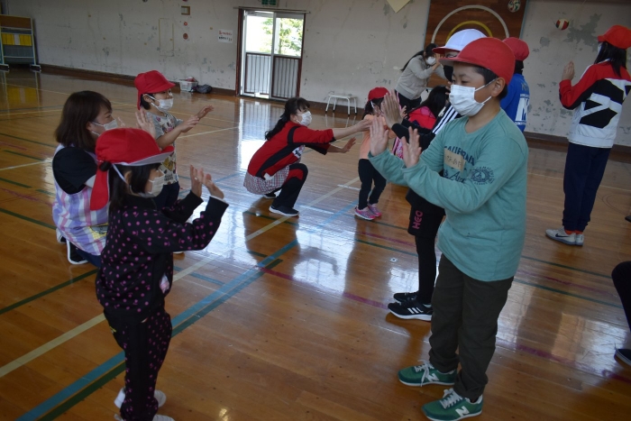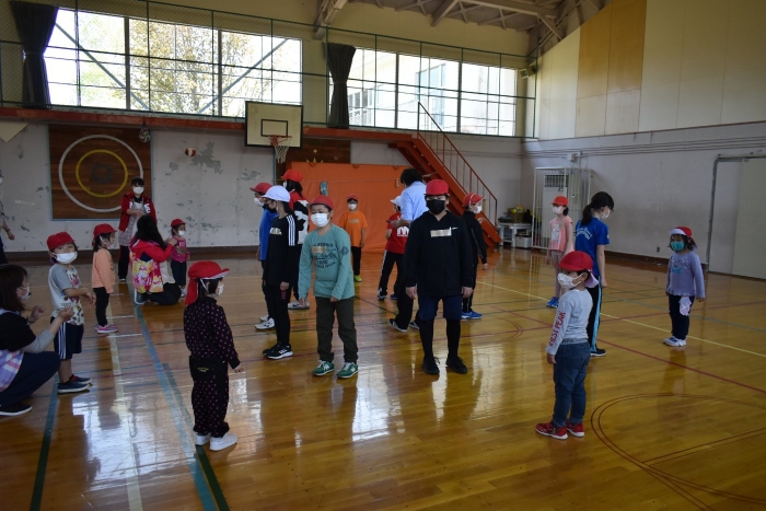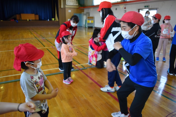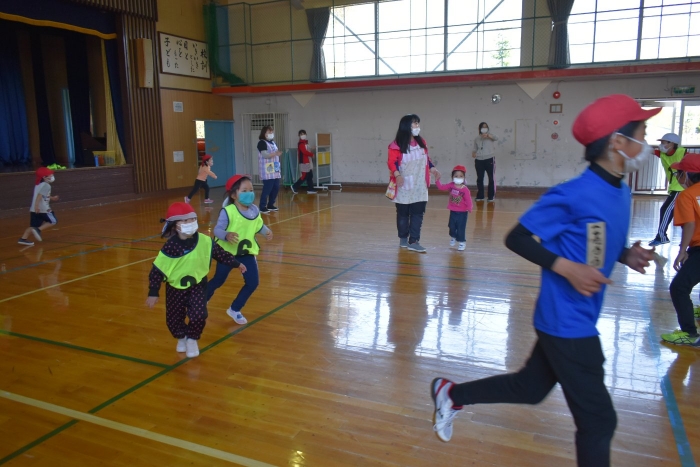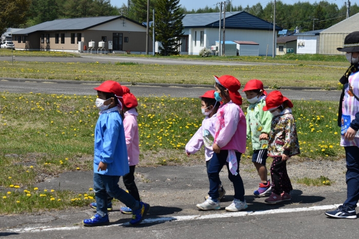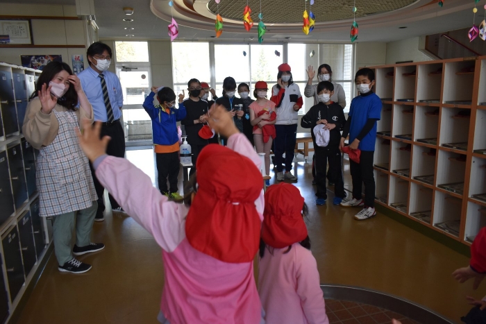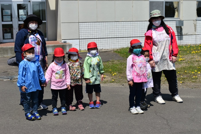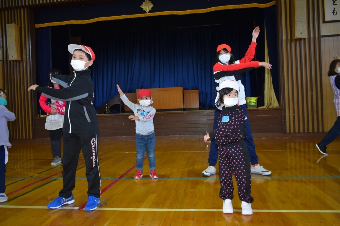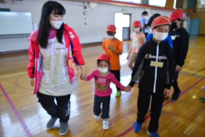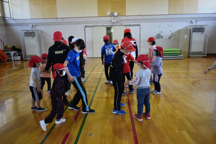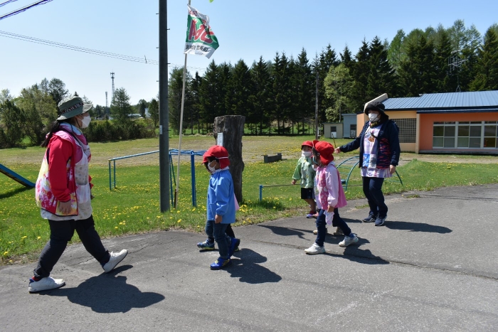 6月4日(土)開催『中西別幼稚園・中西別小学校合同運動会』に向け,遊びの中でも「かけっこ」や「リレー」「フォークダンス」を楽しんだり,「行進」「駆足」など運動会に関連した動きに触れたりして活動しています。 今日は,小学校5・6年生に『ラジオ体操』を教えてもらったり,『糸まき』を一緒に踊ろうと,全園児で小学校に出掛けました。以前,交通安全教室や公園へ出掛けた際とは違っている景色に心を動かしたり,小学校のことを話題にしたりなど,道中も期待に胸をはずませながら小学校へ!  初めて校舎内に入る子もいて緊張している様子もありましたが,小学生や先生方が温かく出迎えてくれ,ちょっと一安心。運動会の活動の前に,自己紹介や園児に馴染みのある遊び『氷鬼ごっこ』で一緒に遊んだり,園児の目線に合わせ優しく関わってくれたことで,少しずつ気持ちもほぐれていった子ども達です。来週からは小学校グランドでの運動会練習が始まったり,小学校読み聞かせに参加させてもらったしますが,交流の機会を有意義に活用し,学校という環境や関わりのある人に親しみがもてるような援助をしていきたいと思います。