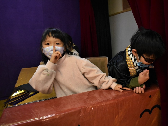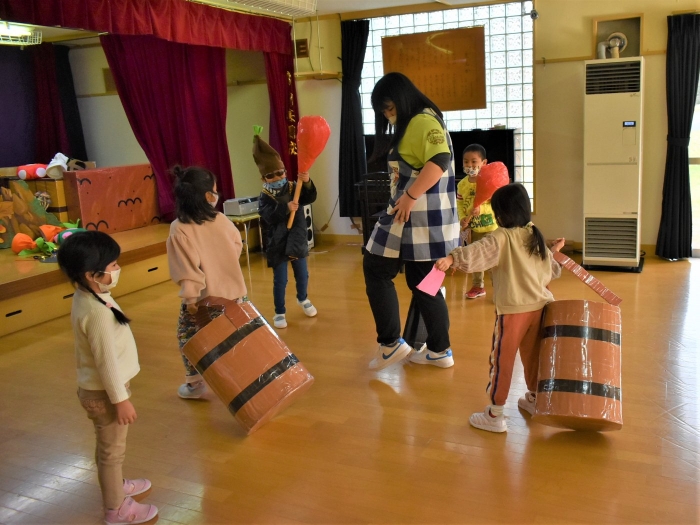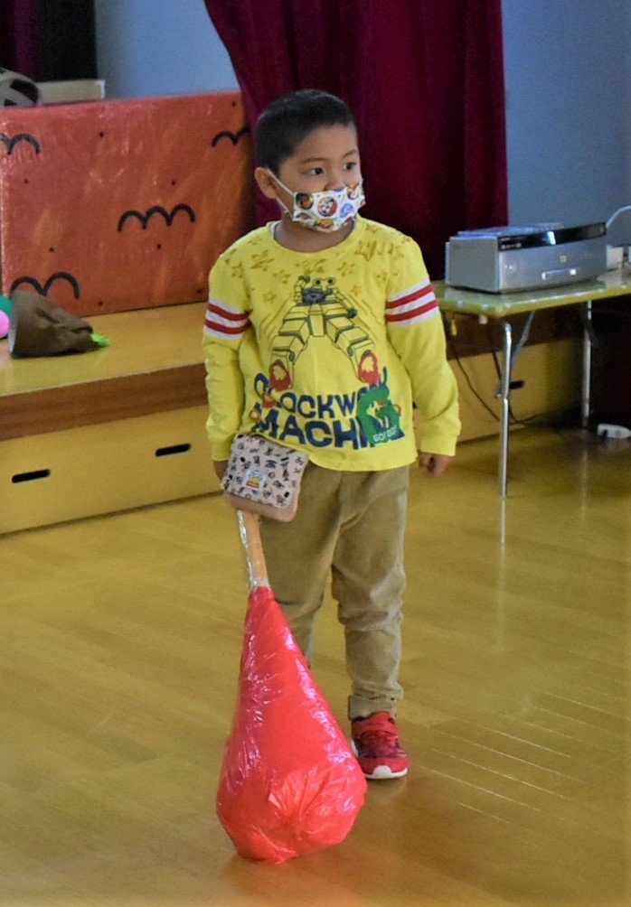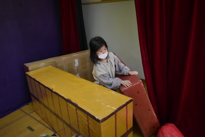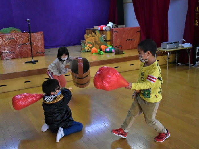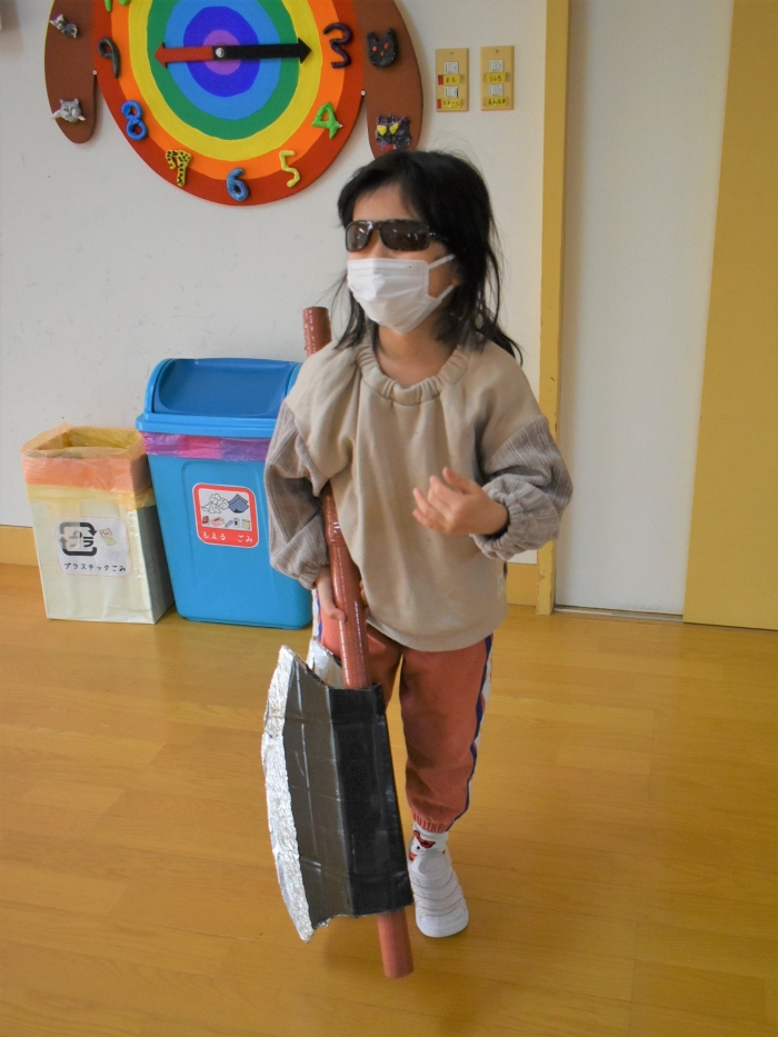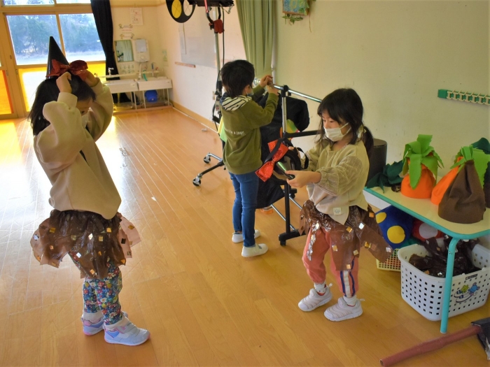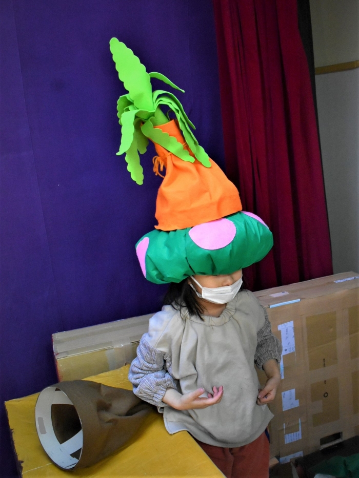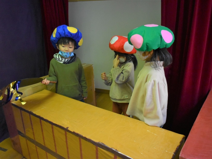 登園後の朝遊びでは,発表会の余韻を味わっている子ども達。遊戯やオペレッタでの衣装や小物を使いオリジナルコーディネイトを楽しんだり,遊戯の振付にアレンジを加えて踊ったりしています。大道具や小道具を活用して新たなごっこ遊びを展開かる姿も! 発表会に向けての活動体験を通し,更に表現力・発想力に磨きがかかってきている子ども達です。