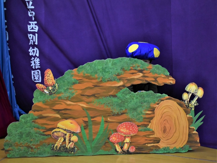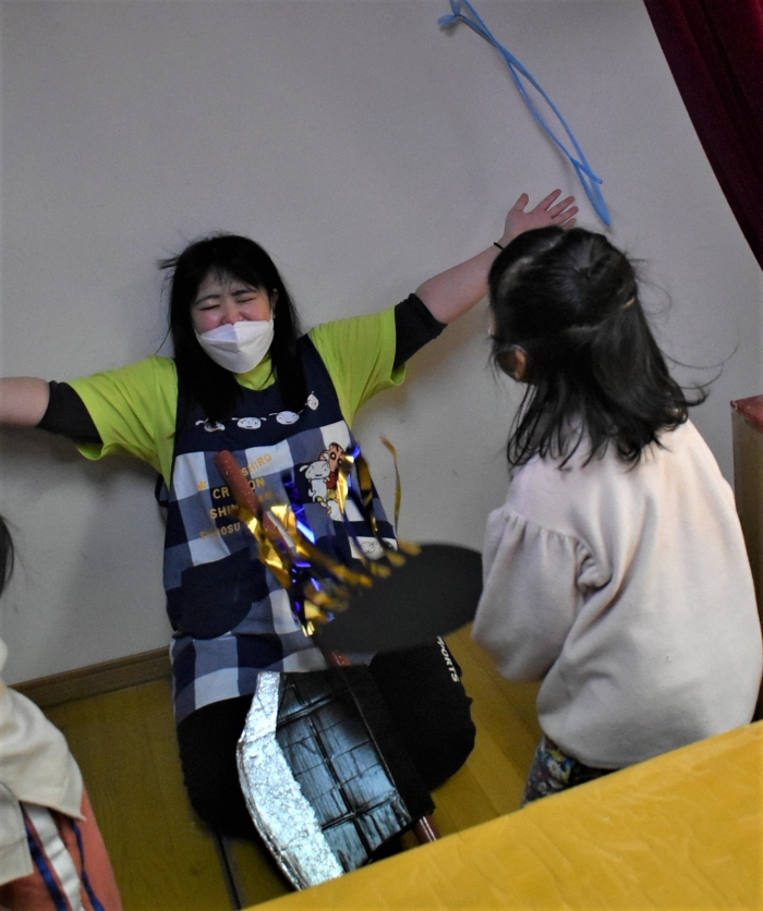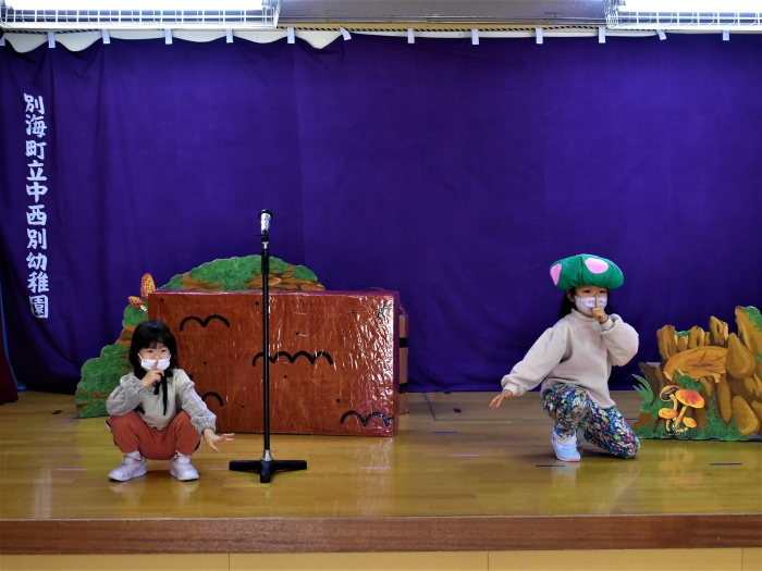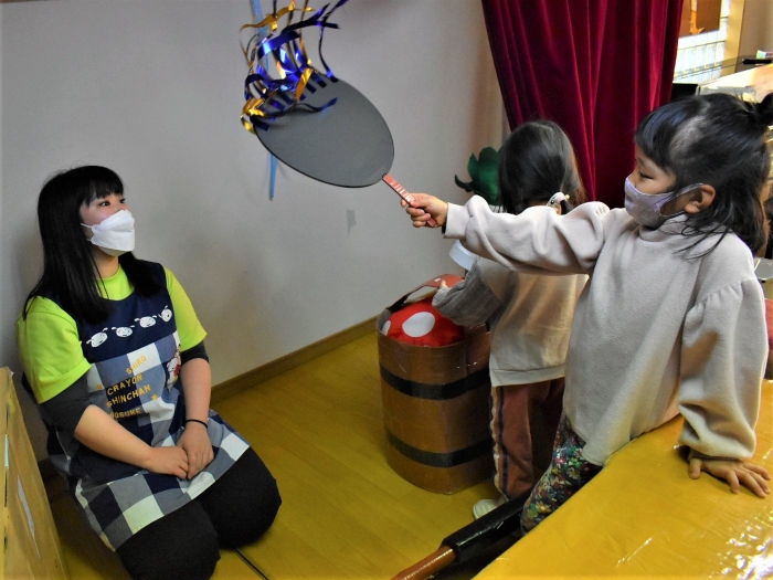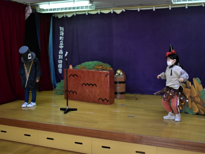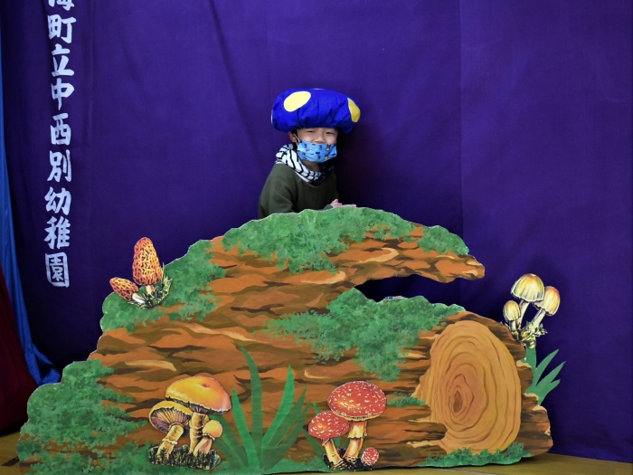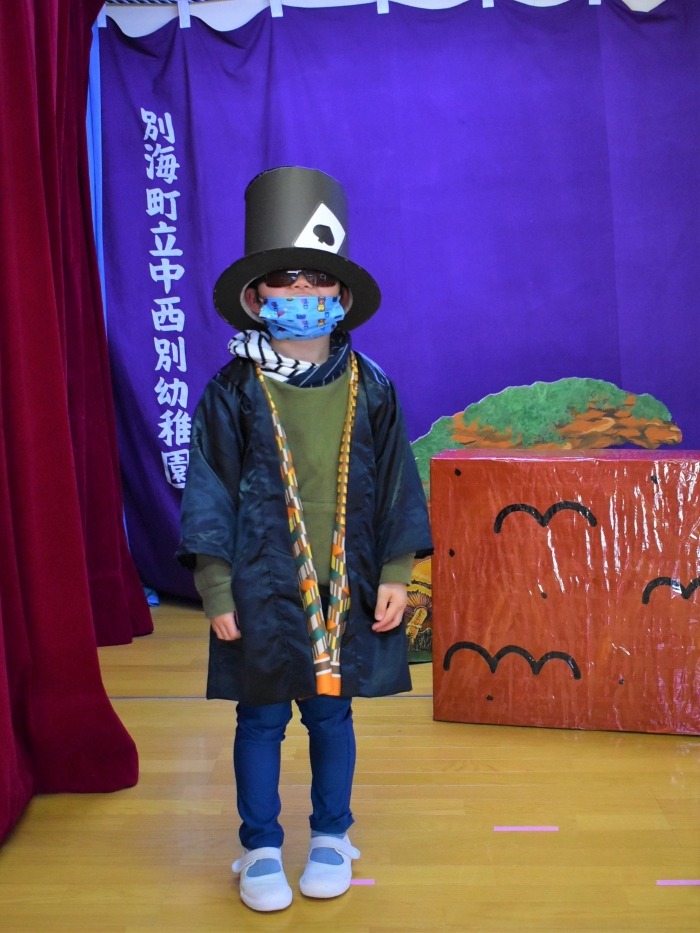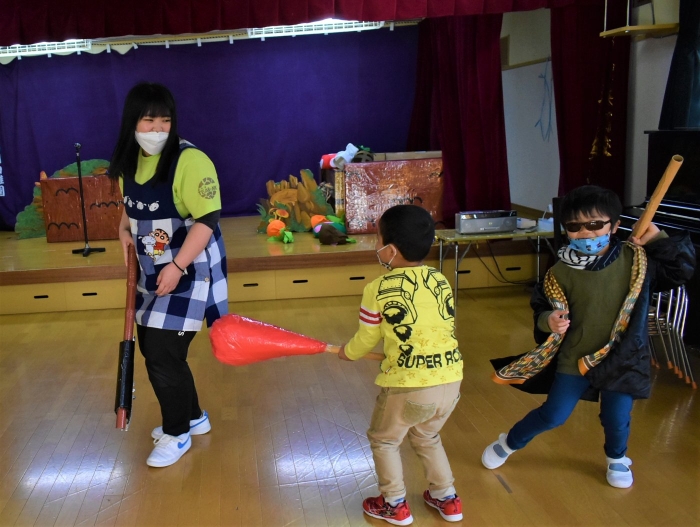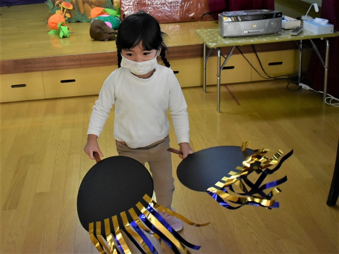 登園後の朝遊びでは,発表会の余韻を味わっている子ども達。遊戯やオペレッタでの衣装や小物を使いオリジナルコーディネイトを楽しんだり,遊戯の振付にアレンジを加えて踊ったりしています。大道具や小道具を活用して新たなごっこ遊びを展開かる姿も! 発表会に向けての活動体験を通し,更に表現力・発想力に磨きがかかってきている子ども達です。
