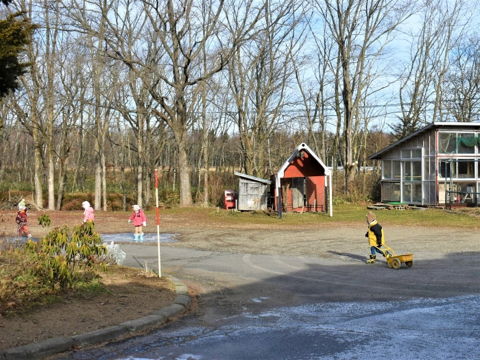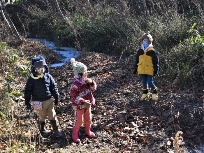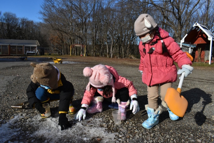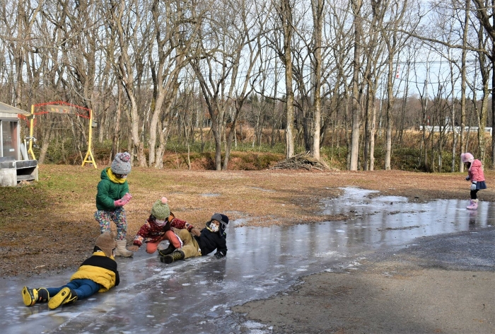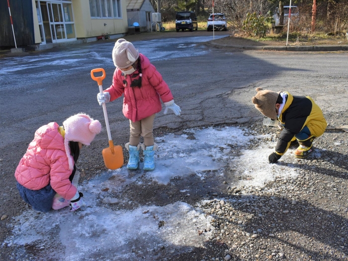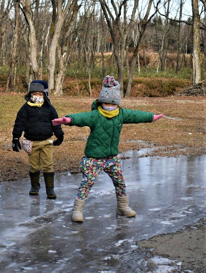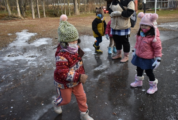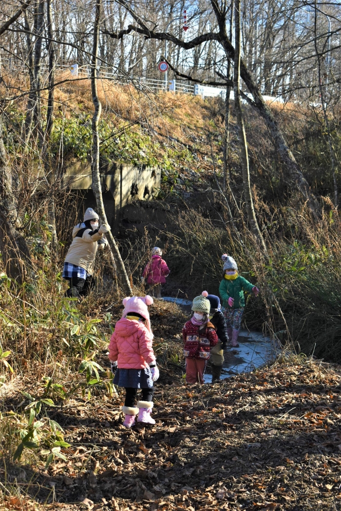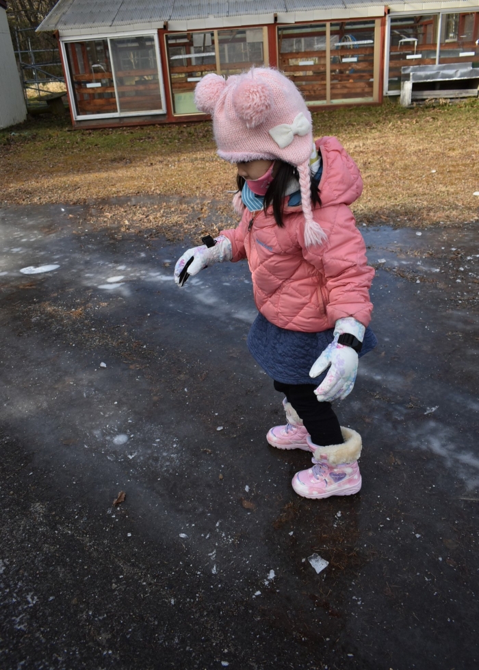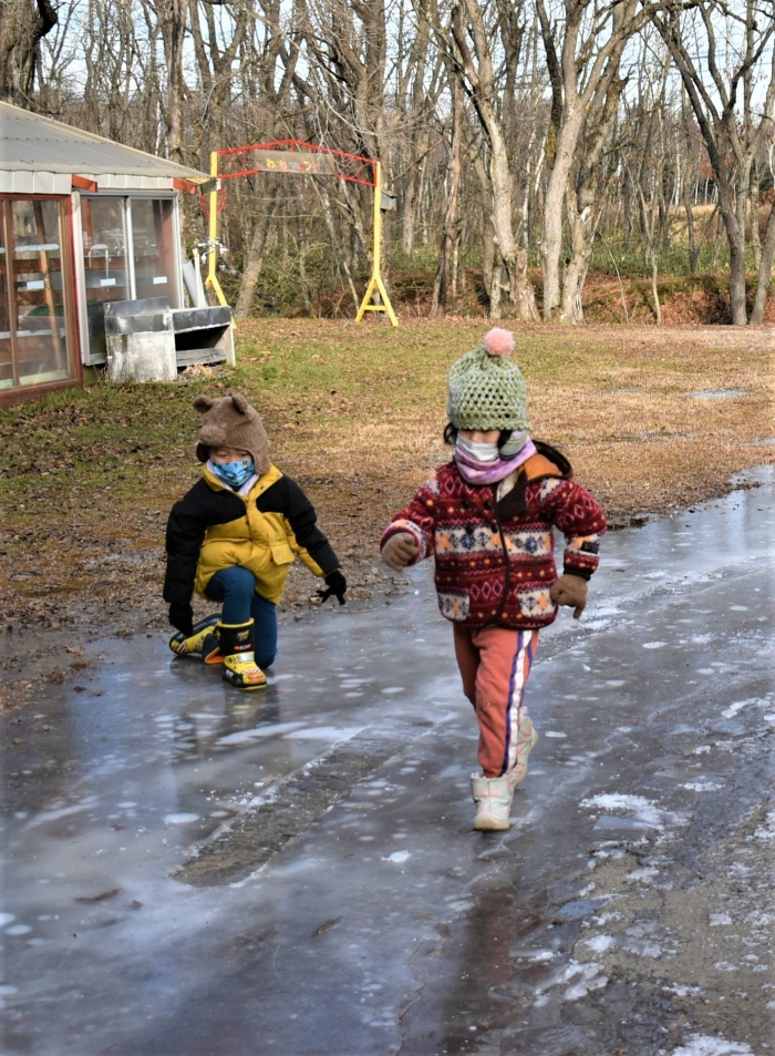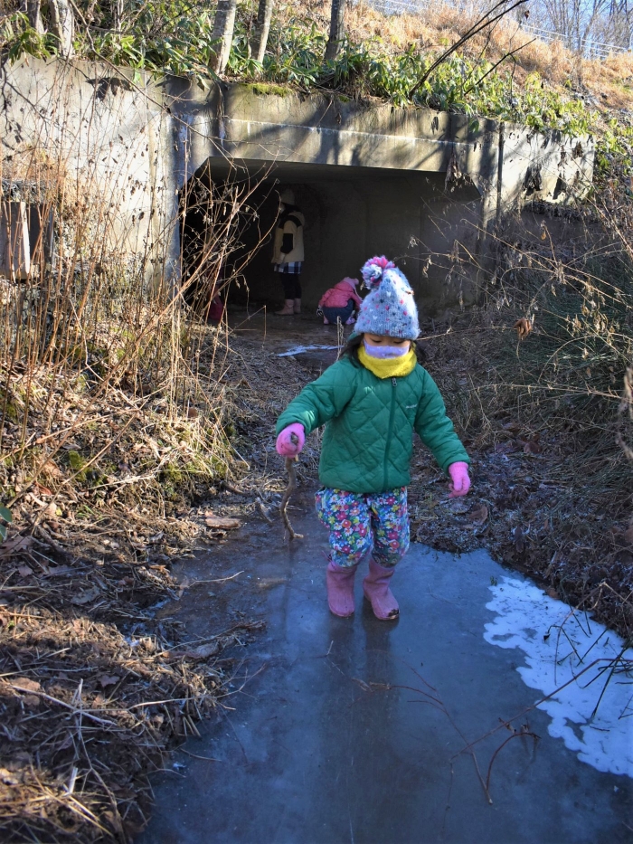 「集めた氷はどうなっているかな?」前日の遊びを思い起こし,朝の会後は戸外へ! 「氷,溶けてないよー!!」「今日は氷滑りしよう♬」「いちごジュース作るんだぁ♪」,それぞれ目的をもって遊びに向かっていました。 わくわくジャングルの氷の川や,トンネル空間がお気に入りの子も! 今日は,トンネルの暗がりからお化け,お化け⇒ゾンビ⇒ゾンビ追いかけ鬼へと遊びが広がり,わくわくジャングルをのびのび駆け回っていた子ども達です。