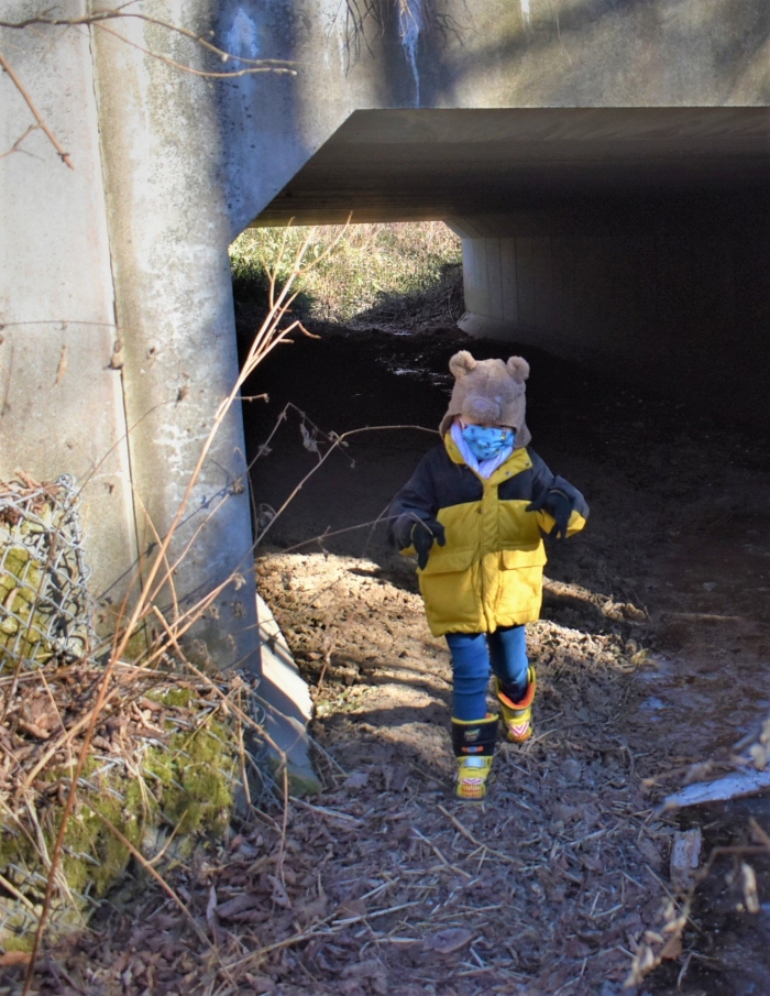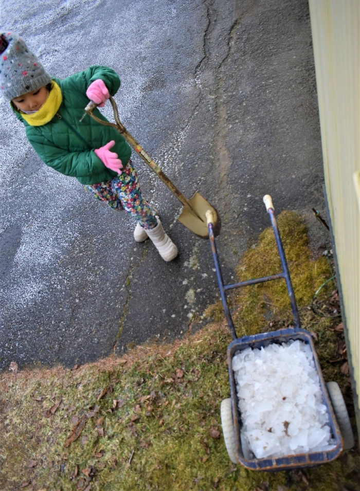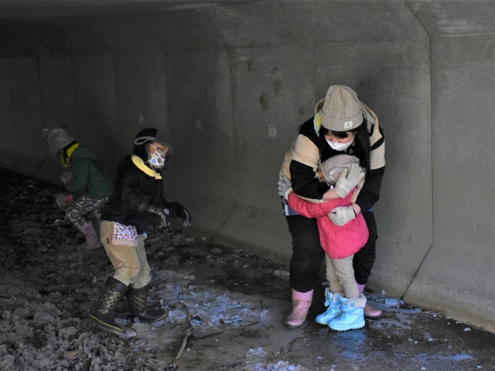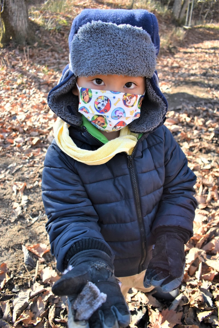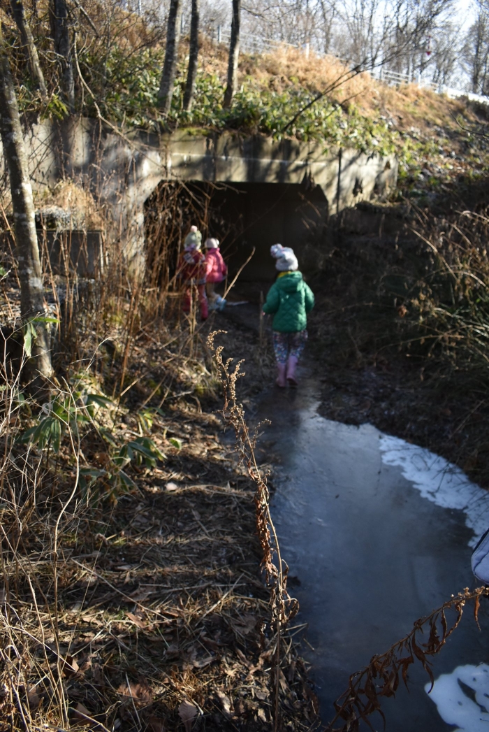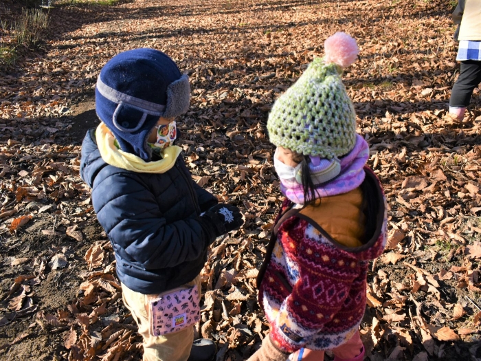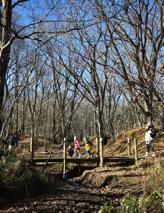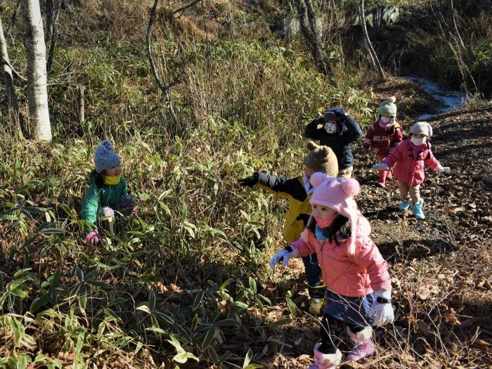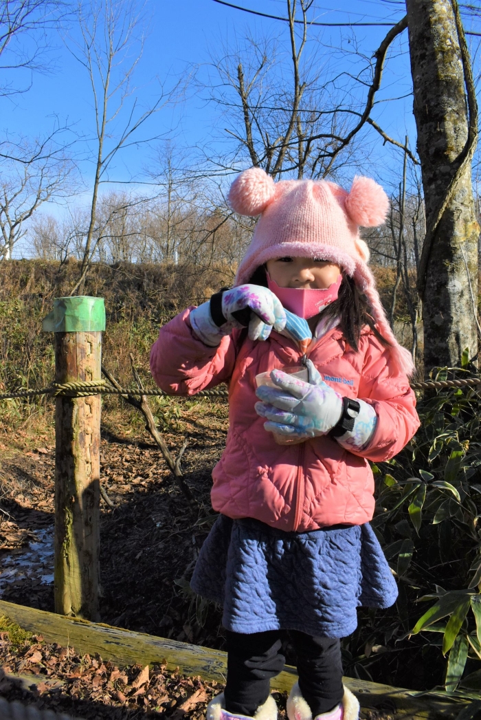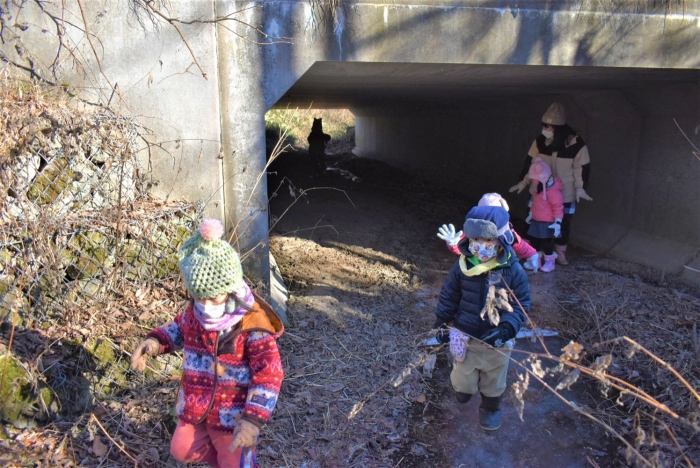 「集めた氷はどうなっているかな?」前日の遊びを思い起こし,朝の会後は戸外へ! 「氷,溶けてないよー!!」「今日は氷滑りしよう♬」「いちごジュース作るんだぁ♪」,それぞれ目的をもって遊びに向かっていました。 わくわくジャングルの氷の川や,トンネル空間がお気に入りの子も! 今日は,トンネルの暗がりからお化け,お化け⇒ゾンビ⇒ゾンビ追いかけ鬼へと遊びが広がり,わくわくジャングルをのびのび駆け回っていた子ども達です。