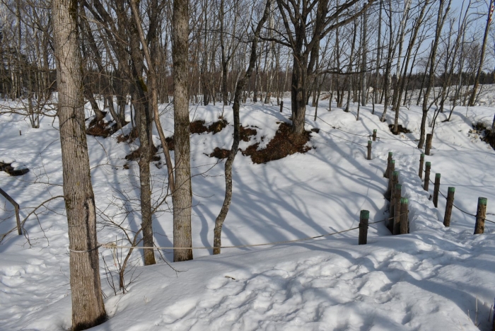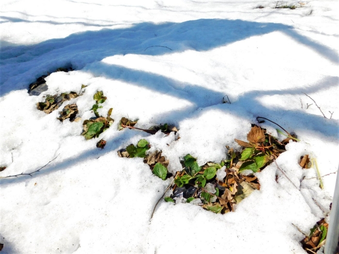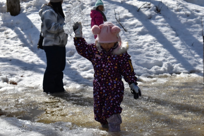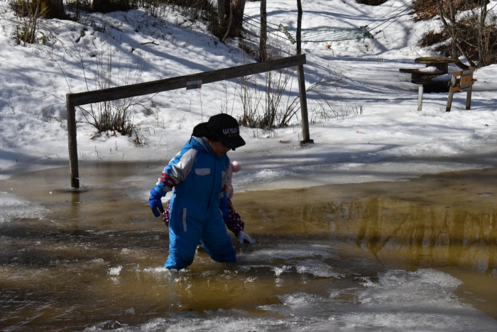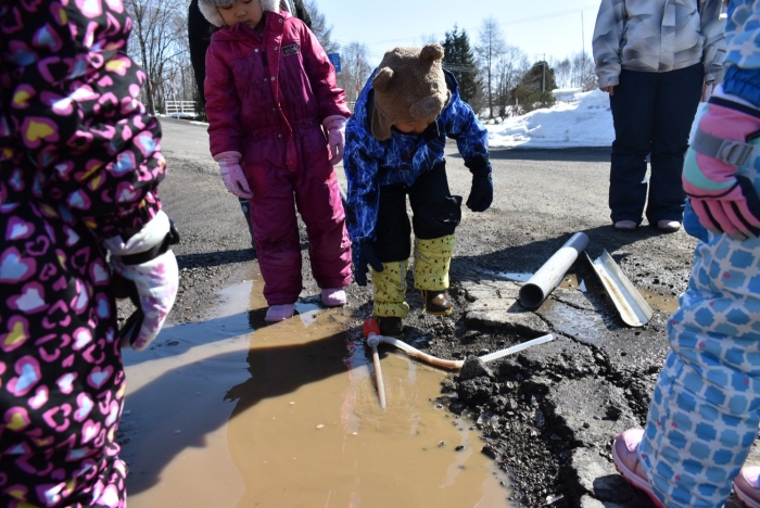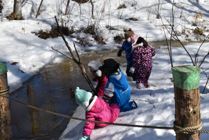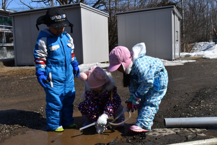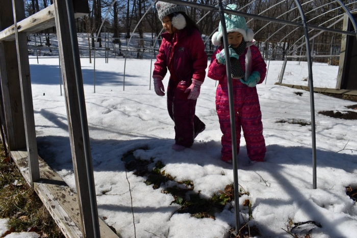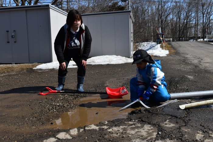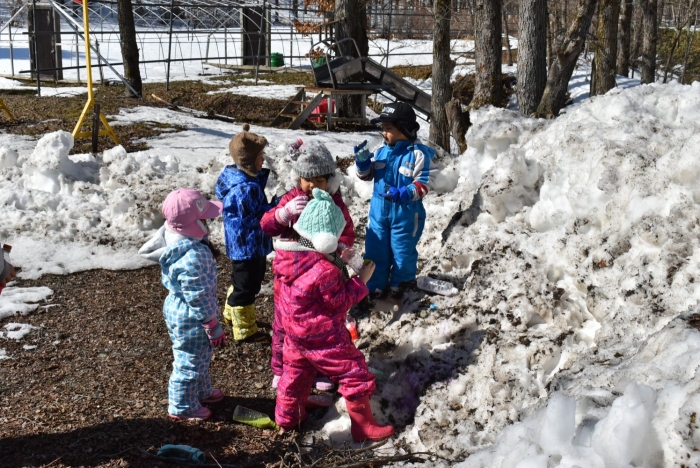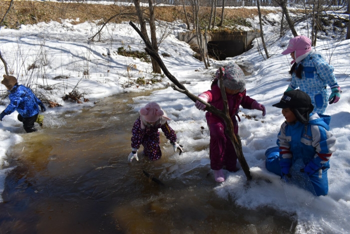 「わくわくジャングルはどうなっているかな?」 今日は,久しぶりに足を運んでいました。わくわくジャングルに向かう途中,大きく立ちはだかっていた除雪の雪山が平たくなっていたり,真っ白な雪が積もっていた場所が雪解けで川になっていたり,以前と様変わりした景色に驚いていた子ども達。川の音に耳をすませたり,うっすら張っていた氷を踏み集めたりして楽しんでいました。畑の方にも足を運び,雪解けからイチゴの新葉が出ていることを発見☆彡 早春ならではの自然を満喫していた子ども達です。