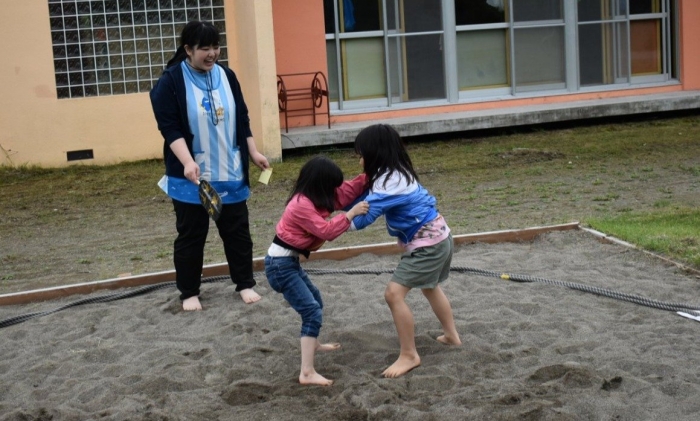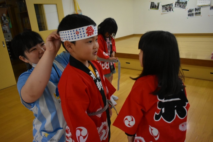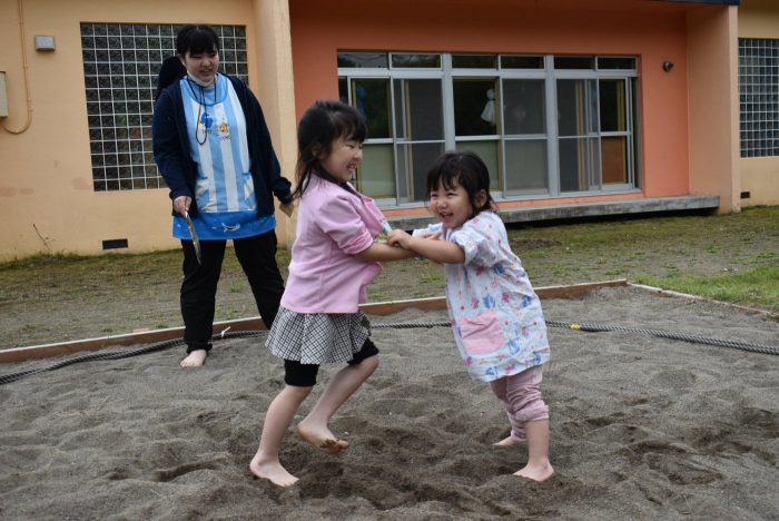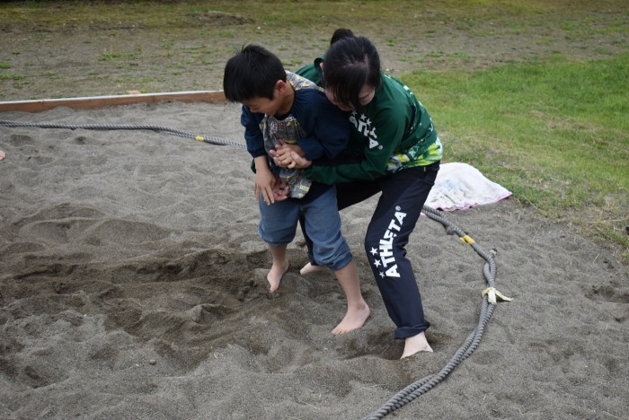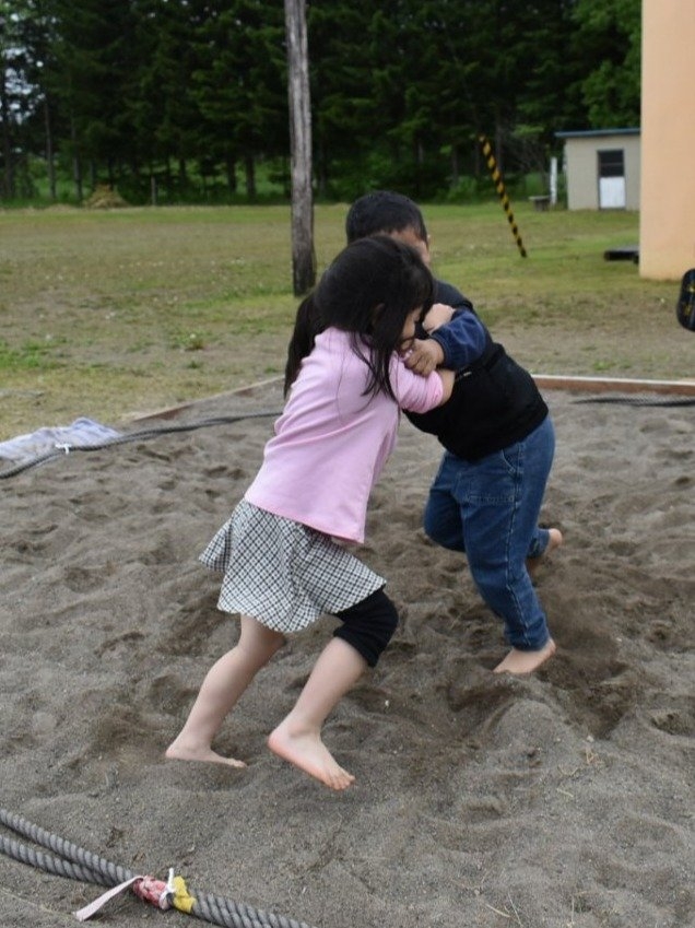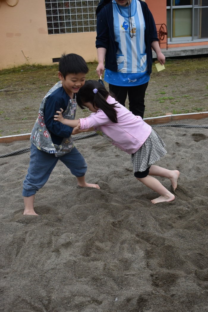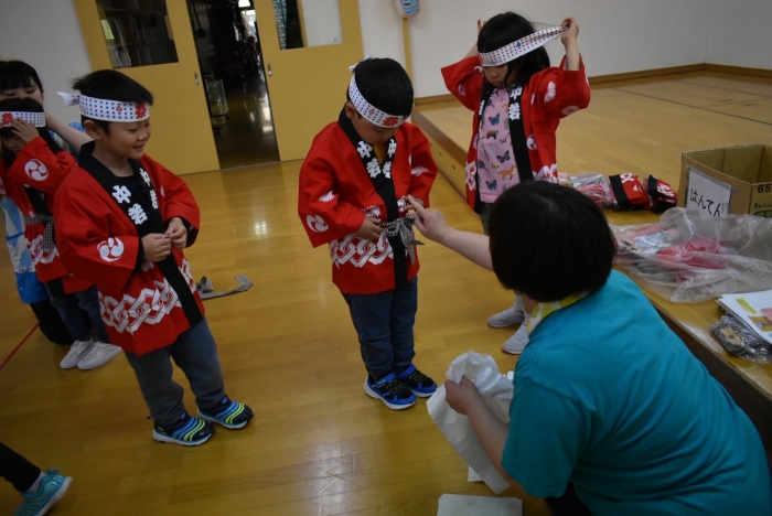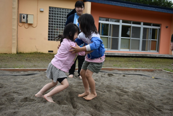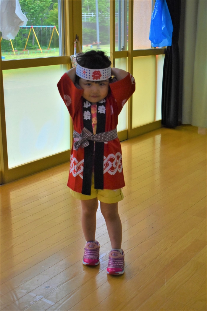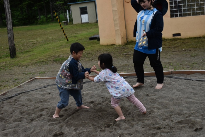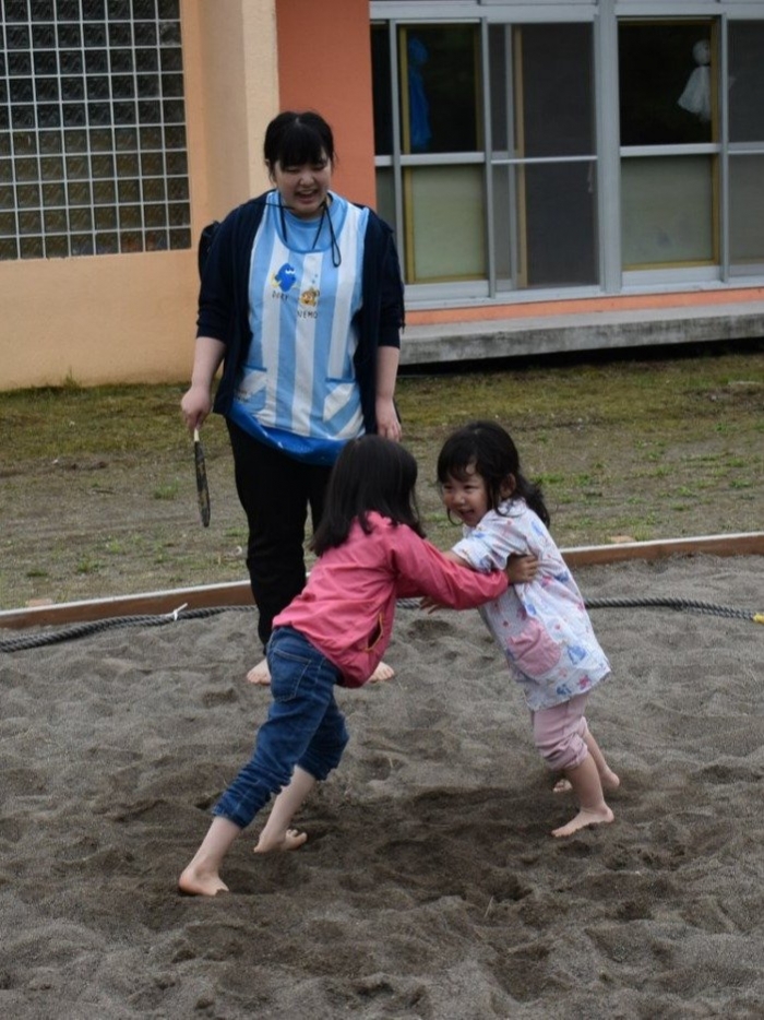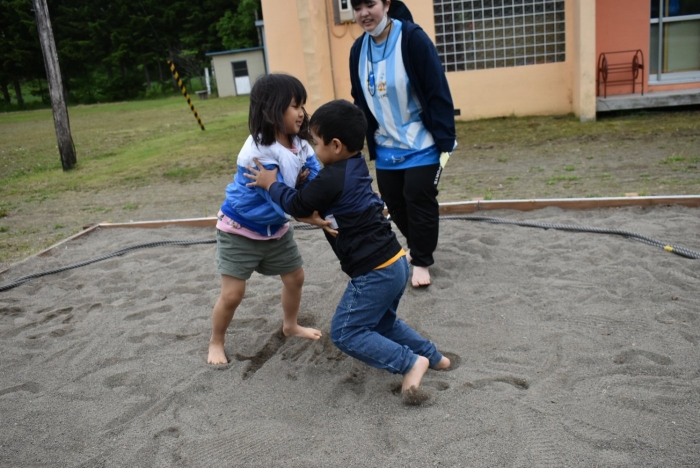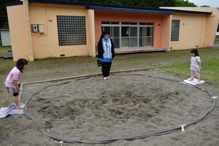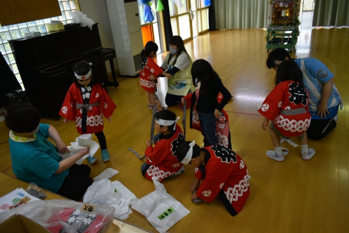 今日は,お祭リーダーへ笛を授与,リーダーの合図でアンパンマン音頭を踊ったり,当日着る法被合わせを行ったりしました。年長組では,燃えに燃えている相撲で四股名を相談! それを聞いた年少・年中組も賛同し,それぞれ自分の名前とマッチングさせた四股名を命名していました。そして,園庭の砂場土俵で取組も行いました。勝敗がつきものの相撲取組。負けた悔しさで涙がこぼれたり歯を食いしばったりしながも,終わりの礼をしっかりと行い,次の取組に挑んだり友達に声援を送ったりする姿には,心を動かされるものがありました。子ども達の成長した姿を,ぜひ保護者の方,地域の方にも見てもらえればと思います。