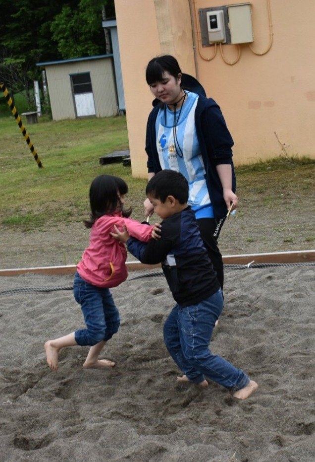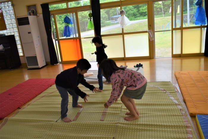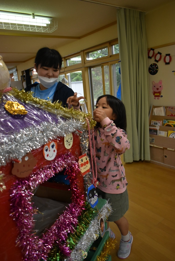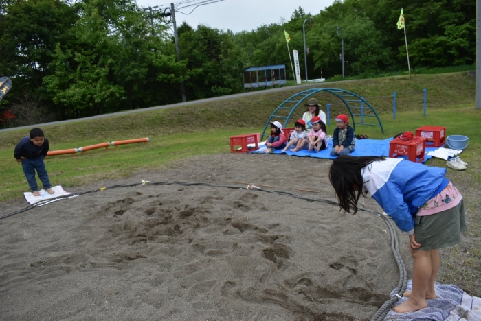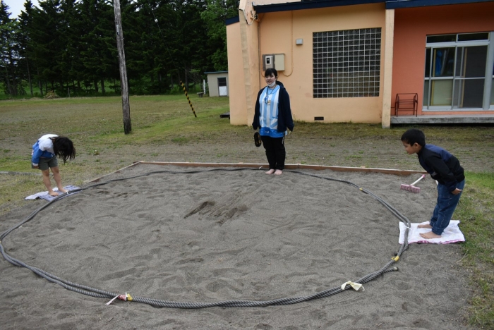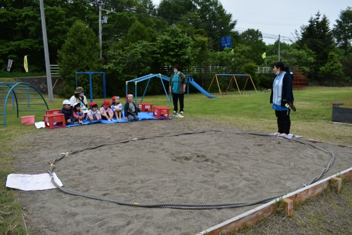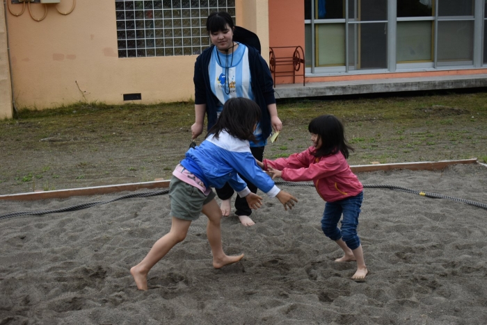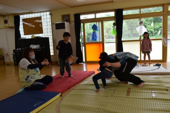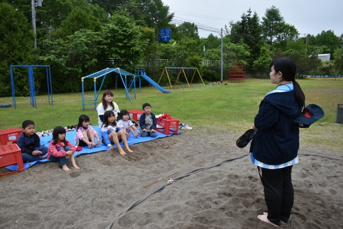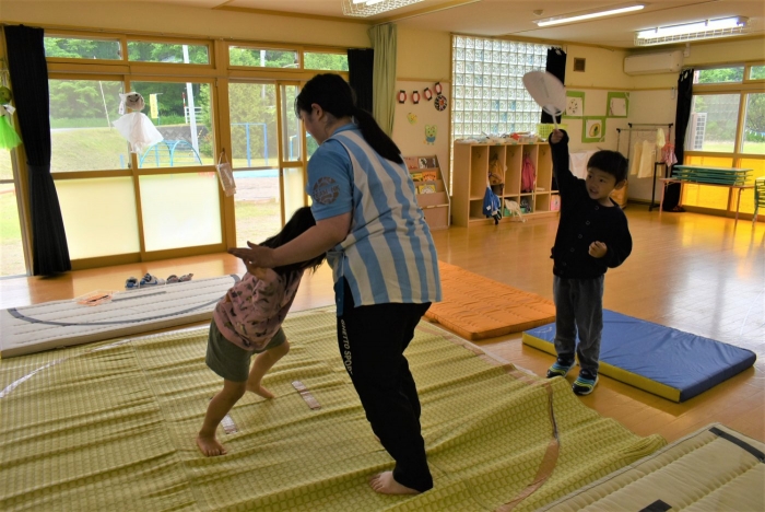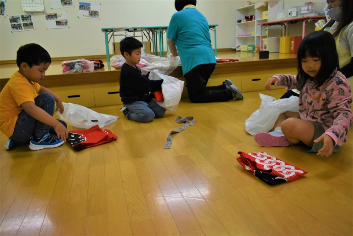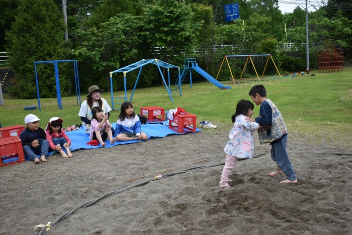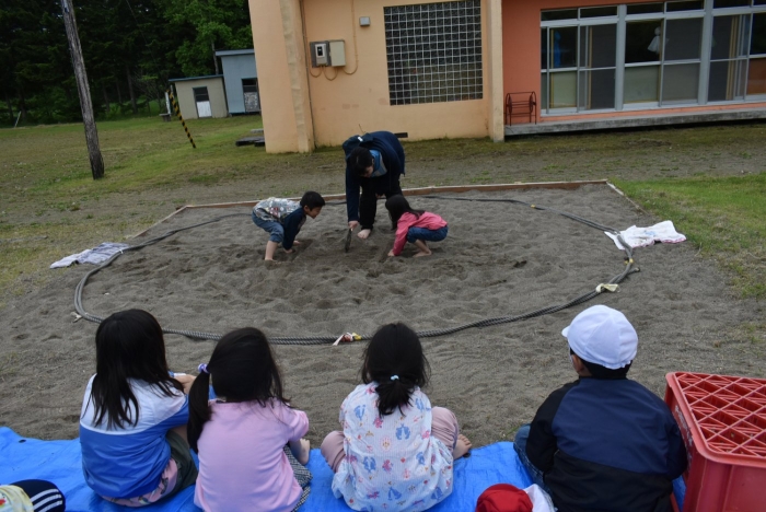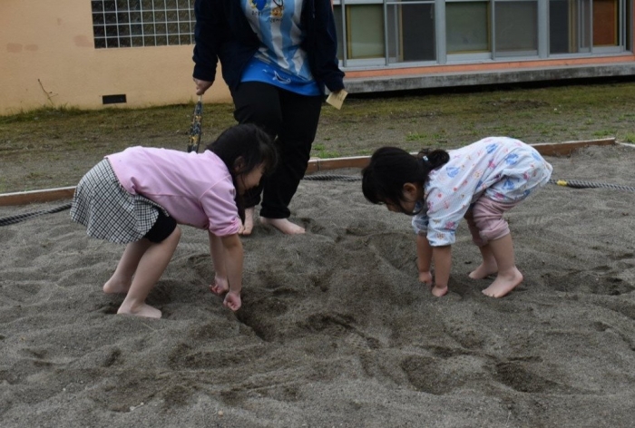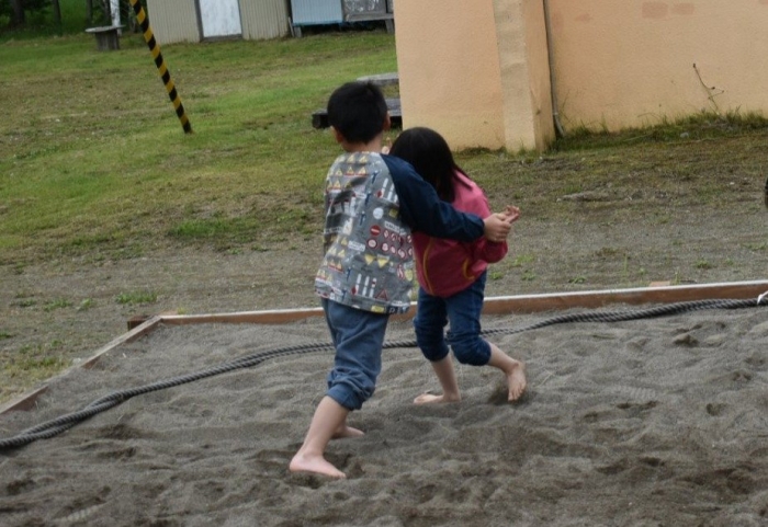 今日は,お祭リーダーへ笛を授与,リーダーの合図でアンパンマン音頭を踊ったり,当日着る法被合わせを行ったりしました。年長組では,燃えに燃えている相撲で四股名を相談! それを聞いた年少・年中組も賛同し,それぞれ自分の名前とマッチングさせた四股名を命名していました。そして,園庭の砂場土俵で取組も行いました。勝敗がつきものの相撲取組。負けた悔しさで涙がこぼれたり歯を食いしばったりしながも,終わりの礼をしっかりと行い,次の取組に挑んだり友達に声援を送ったりする姿には,心を動かされるものがありました。子ども達の成長した姿を,ぜひ保護者の方,地域の方にも見てもらえればと思います。