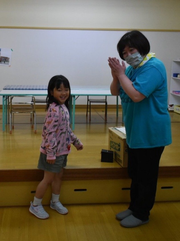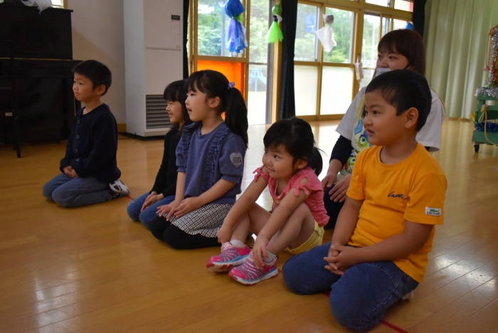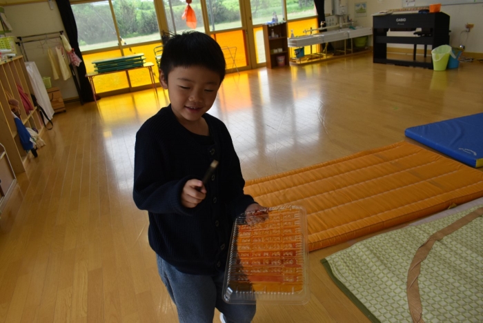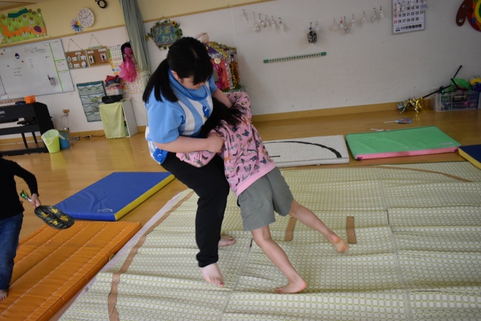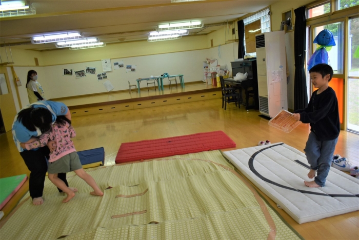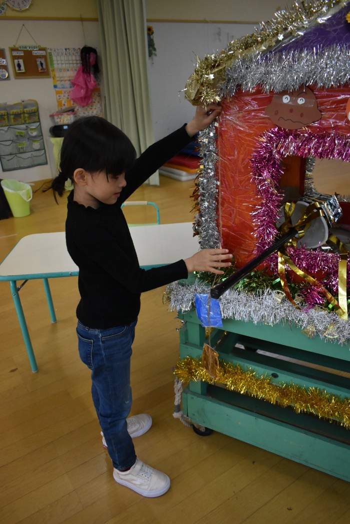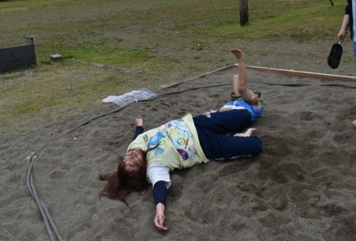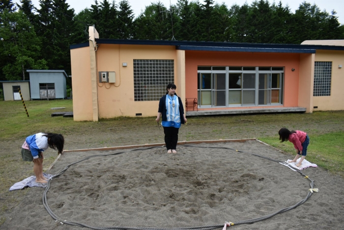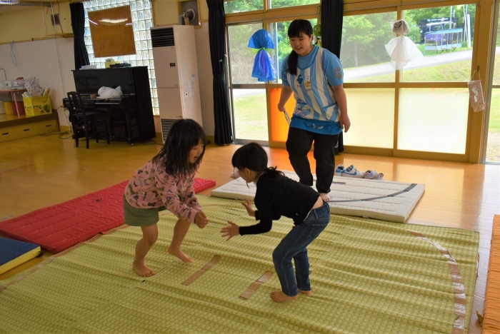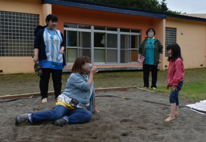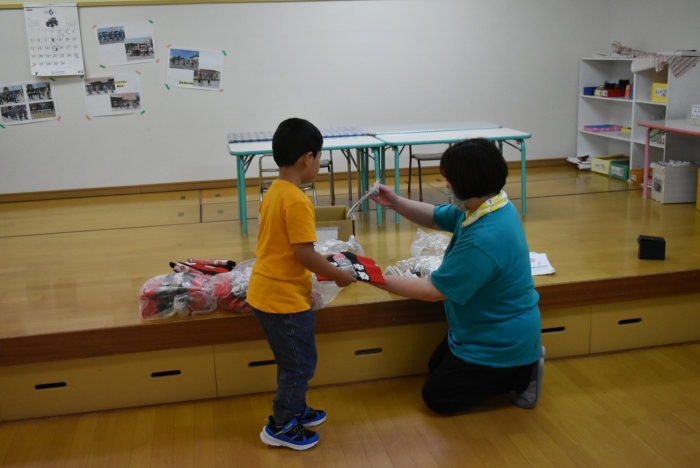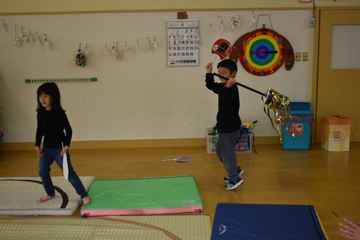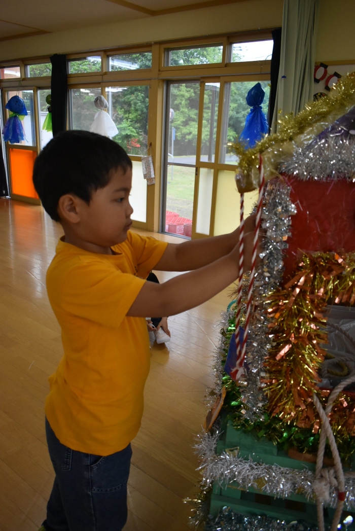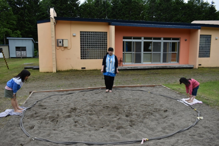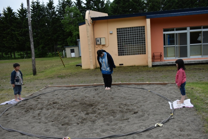 今日は,お祭リーダーへ笛を授与,リーダーの合図でアンパンマン音頭を踊ったり,当日着る法被合わせを行ったりしました。年長組では,燃えに燃えている相撲で四股名を相談! それを聞いた年少・年中組も賛同し,それぞれ自分の名前とマッチングさせた四股名を命名していました。そして,園庭の砂場土俵で取組も行いました。勝敗がつきものの相撲取組。負けた悔しさで涙がこぼれたり歯を食いしばったりしながも,終わりの礼をしっかりと行い,次の取組に挑んだり友達に声援を送ったりする姿には,心を動かされるものがありました。子ども達の成長した姿を,ぜひ保護者の方,地域の方にも見てもらえればと思います。