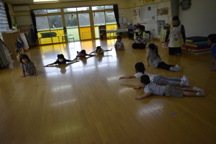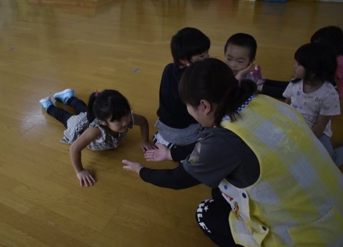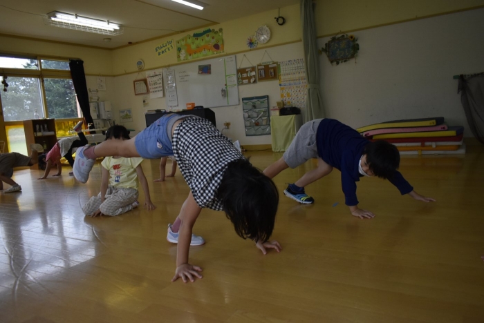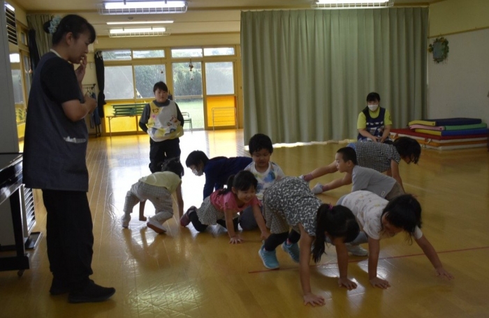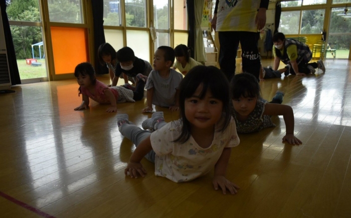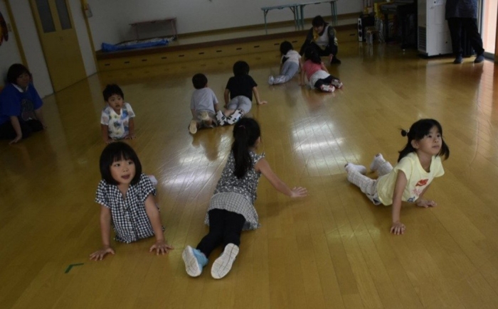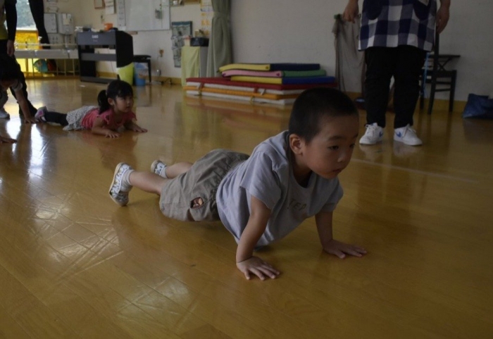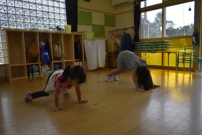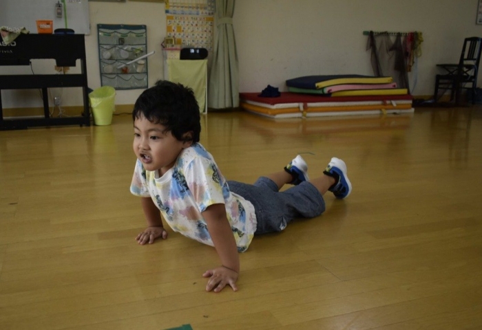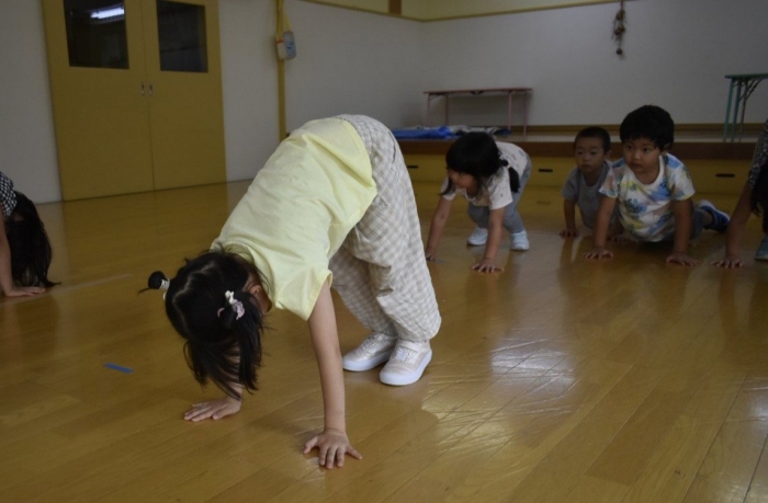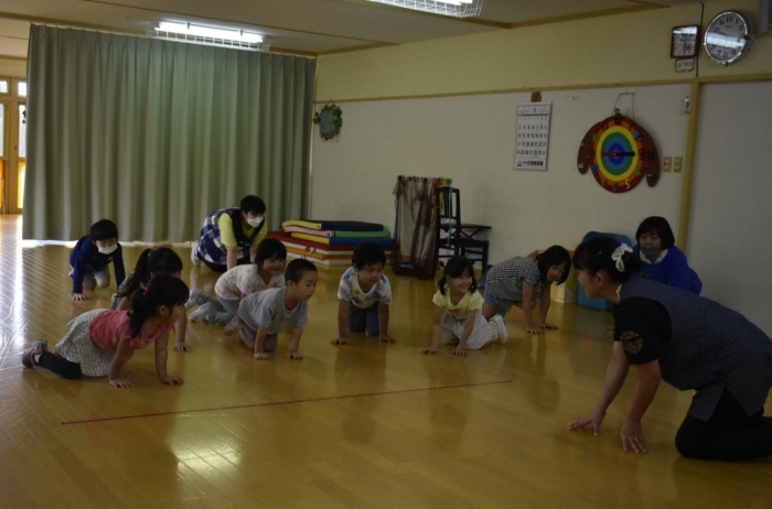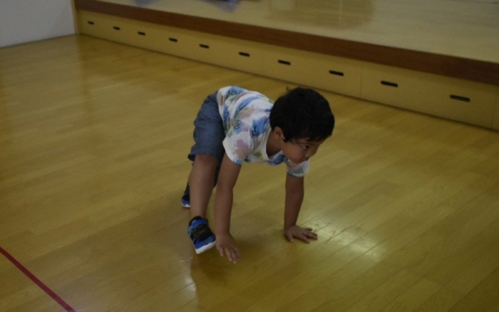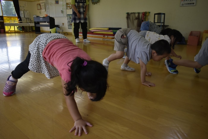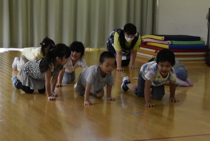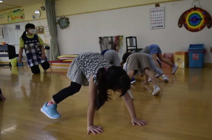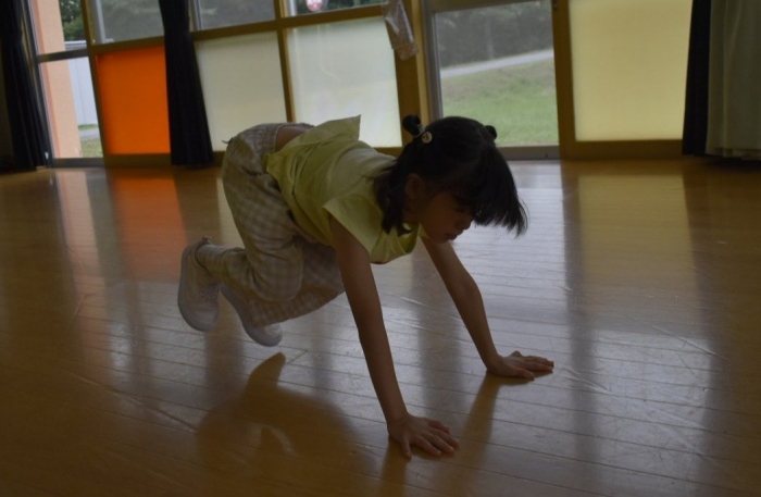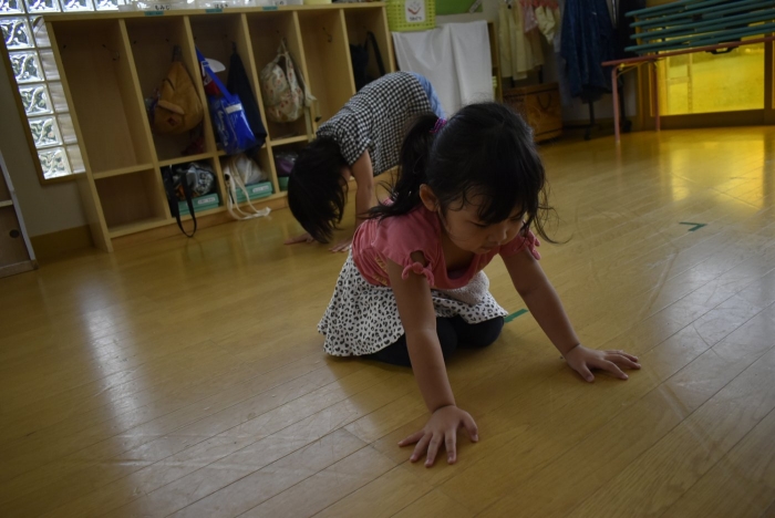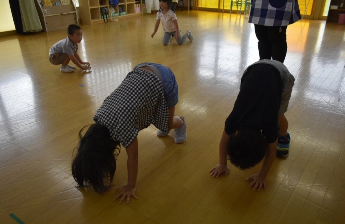 9/4(月)今日の『体で遊ぼう!』では,ディズニー体操で体をほぐした後,イヌ,クマ,シャクトリムシ,カエル,アザラシといった動物の動きを真似た支持運動を行いました。最初は,簡単なイメ歩き(四足歩行)から,膝を曲げずに四足で歩く,足を使わず腕の力だけで動くなど,体の各部位を意識しながら動くことを頑張っていました。