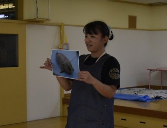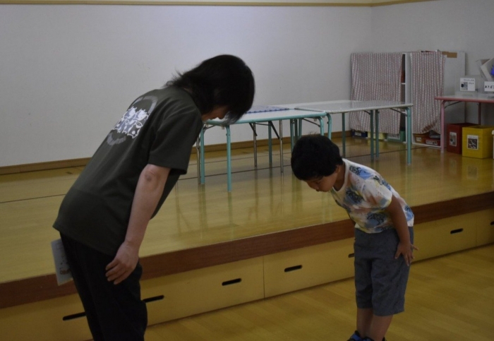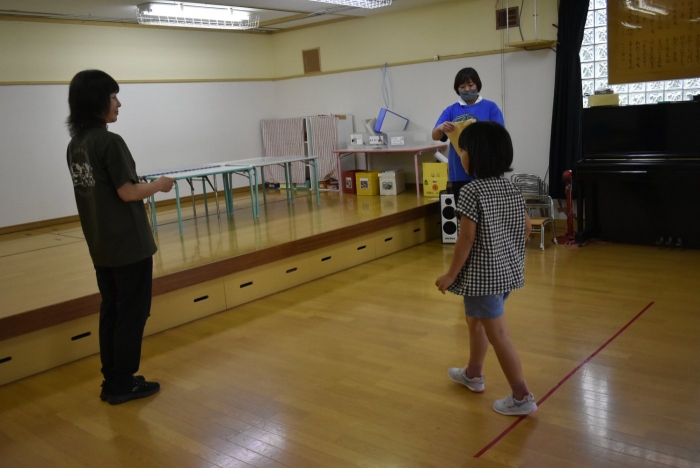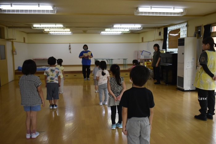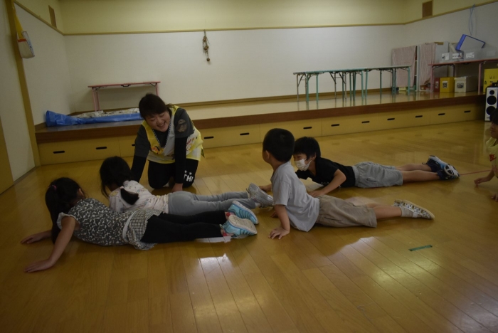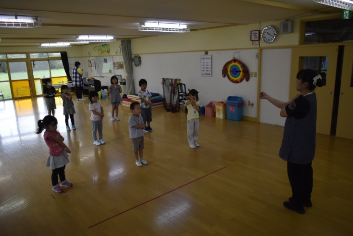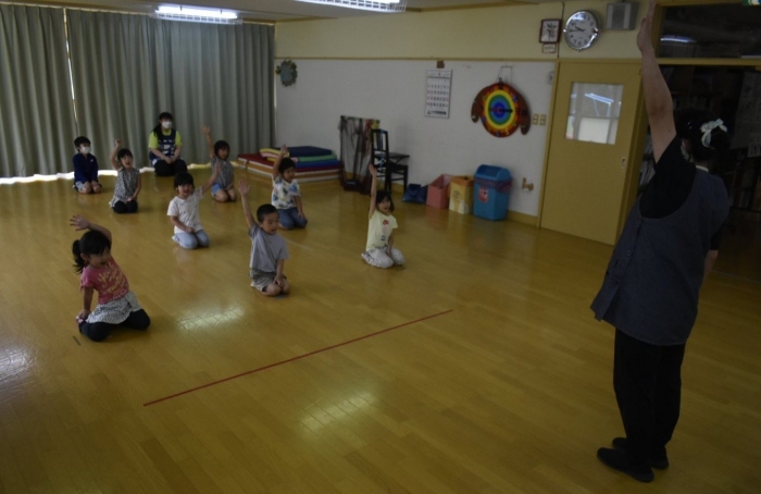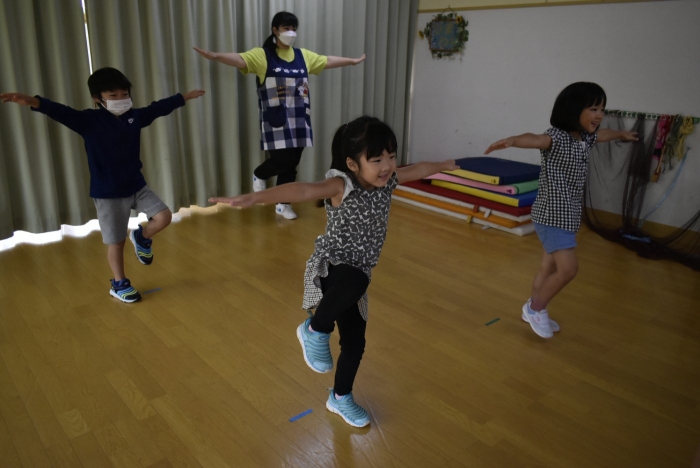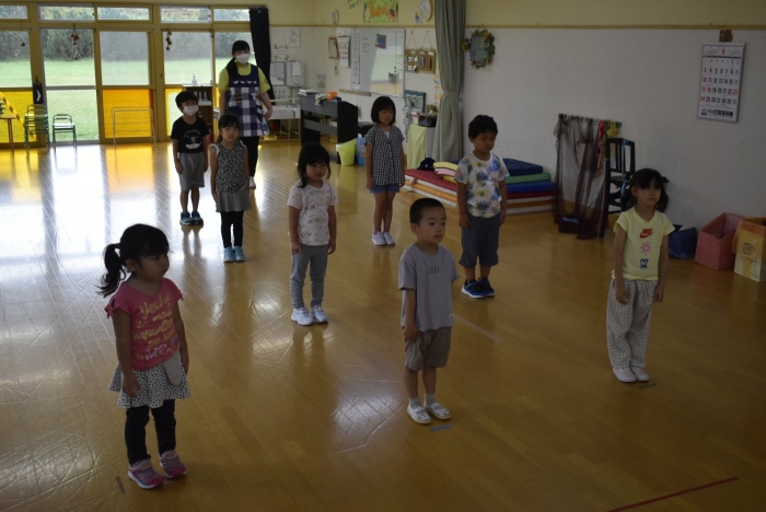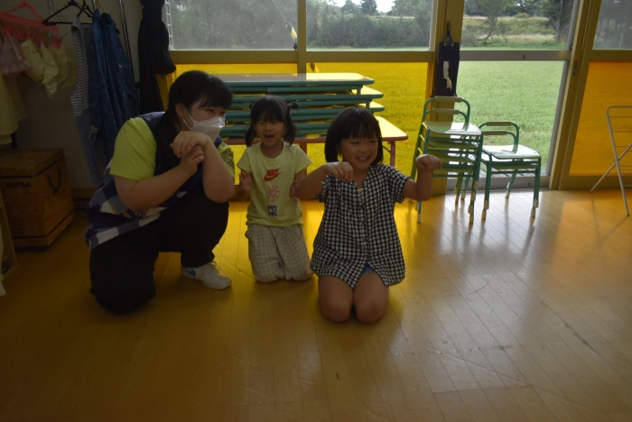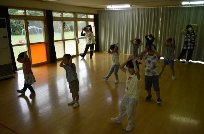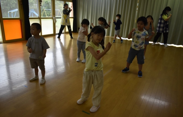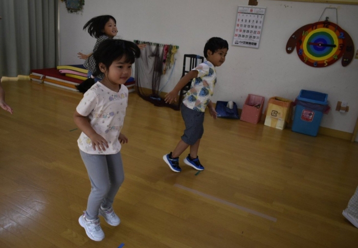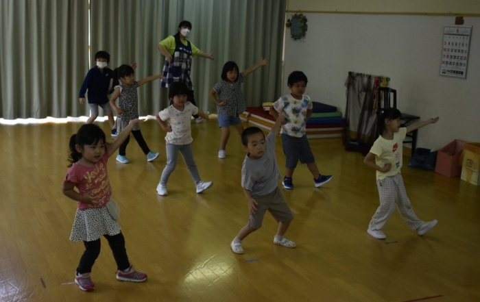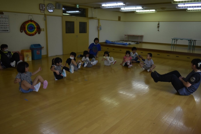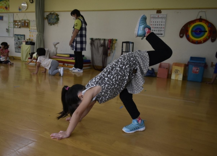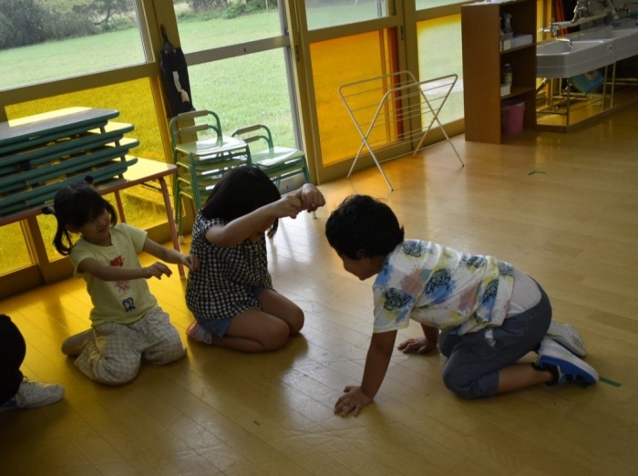 9/4(月)今日の『体で遊ぼう!』では,ディズニー体操で体をほぐした後,イヌ,クマ,シャクトリムシ,カエル,アザラシといった動物の動きを真似た支持運動を行いました。最初は,簡単なイメ歩き(四足歩行)から,膝を曲げずに四足で歩く,足を使わず腕の力だけで動くなど,体の各部位を意識しながら動くことを頑張っていました。