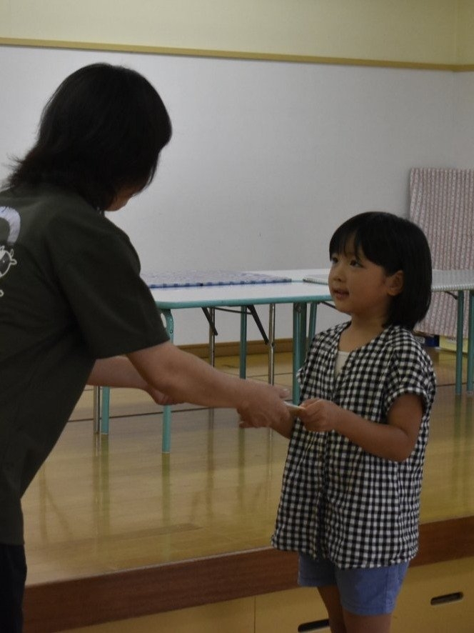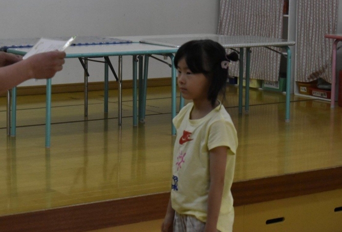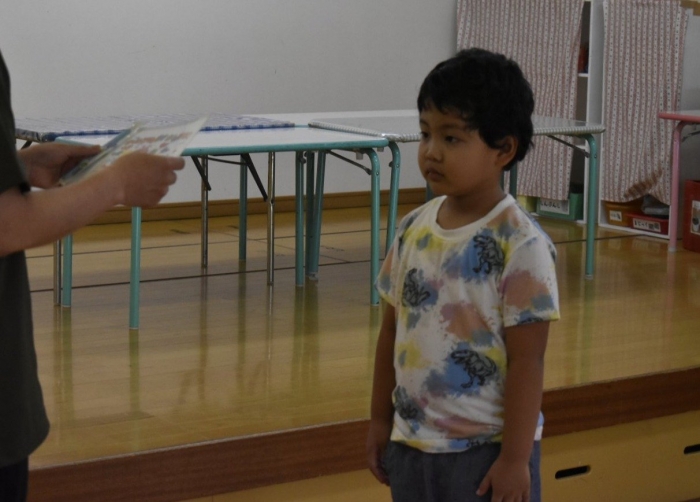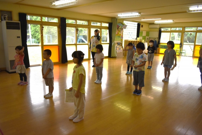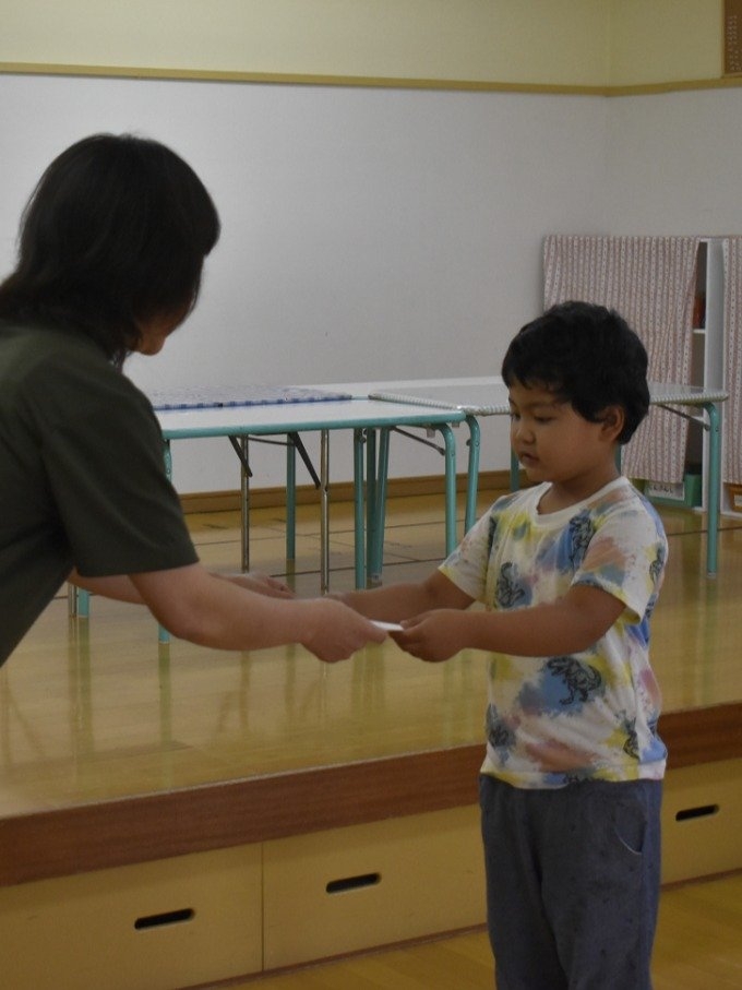 体で遊ぼう後,全園児・職員が見守る中で表彰の場を設けました。事前練習なしの表彰式でしたが,さすが年長組と思える堂々とした姿,そして誇らしげな表情でした。これからも,虫歯ゼロ,輝く白い歯を維持してくださいね。