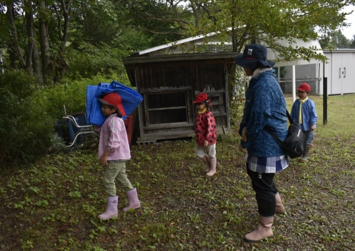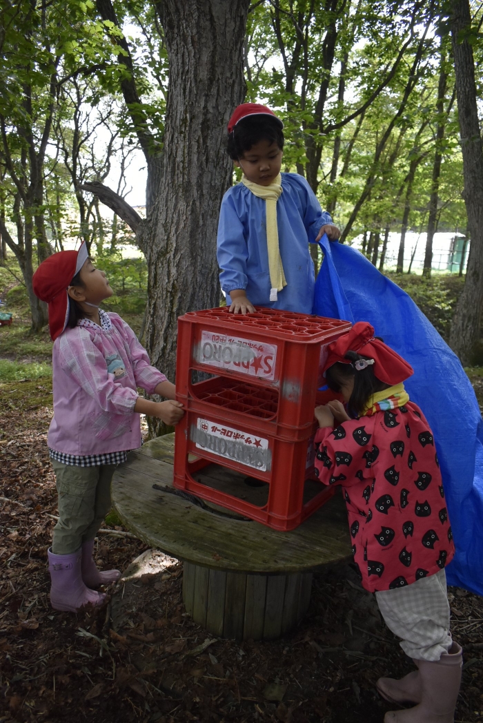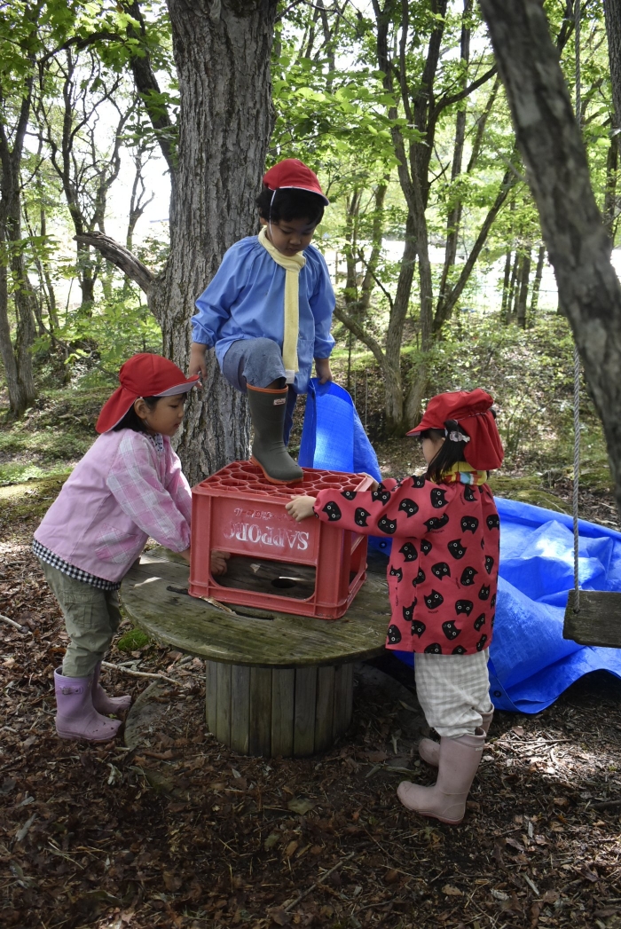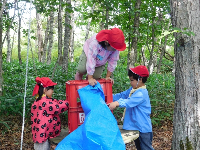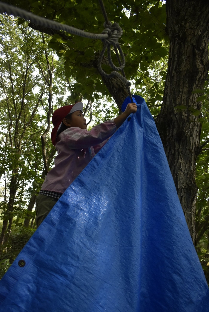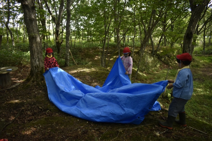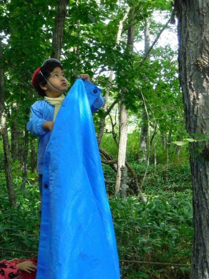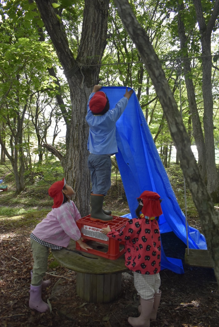 年長組は,物置からブルーシートを探し出し,わくわくジャングルへ! 園内で繰り広げられている忍者ごっこを戸外でも楽しんでいる 年長組。木の棒・手裏剣での戦いや忍者の家作りから,今日は修行の場『滝づくり』をしていました。滝のイメージから使えそうなブルーシート持ってきたものの,どうしたら滝のようになるか友達同士で試行錯誤中! 思いや考えを出し合い,伝え合い,様々な方法を試し工夫しながら遊びを進めていければと,先生は一歩離れて見守っています。 失敗は成功のもと!!  今日の体験から,いいアイディアが出てくるでしょうか?