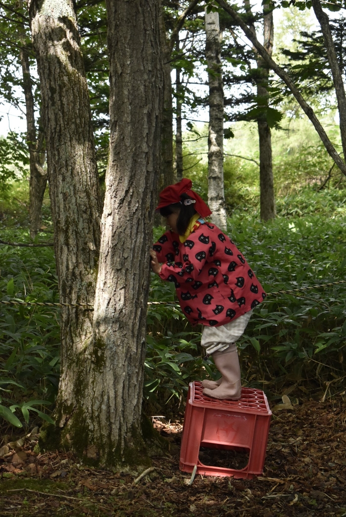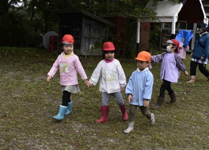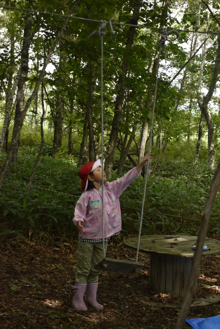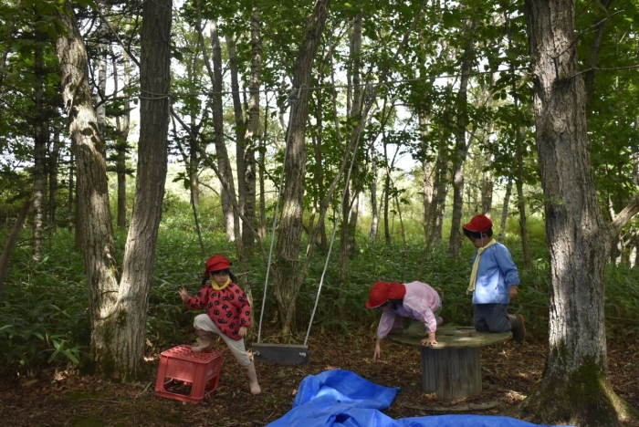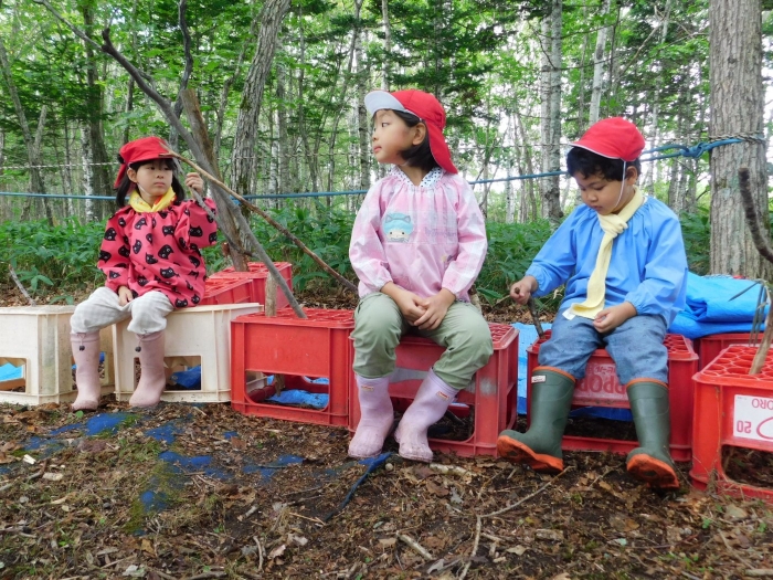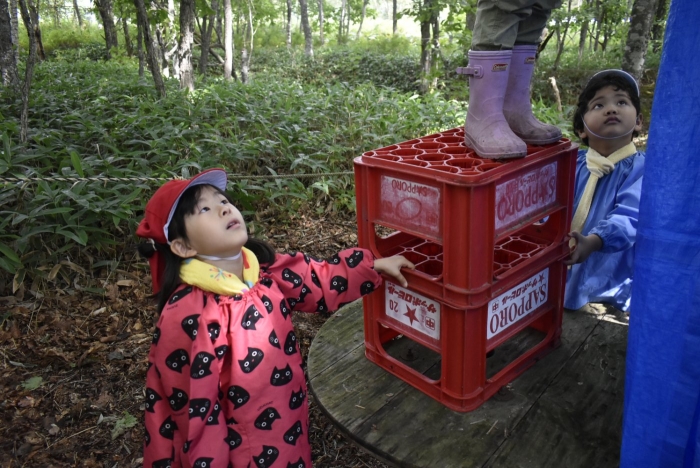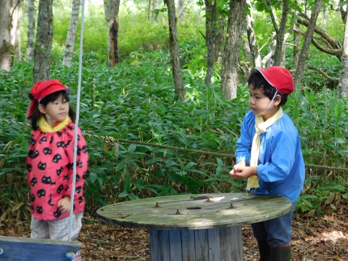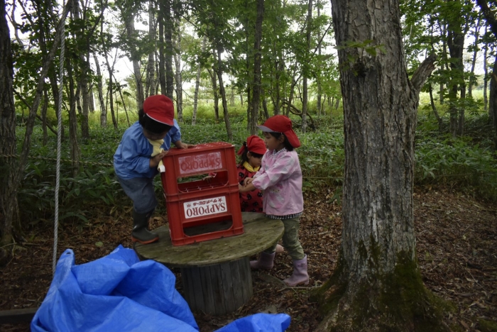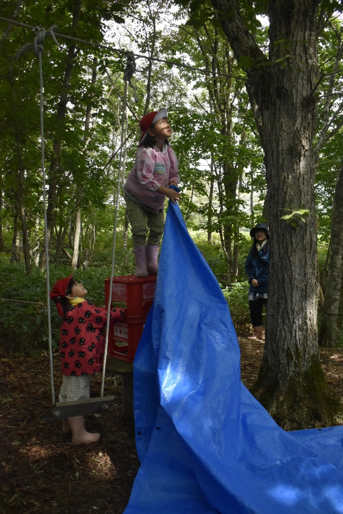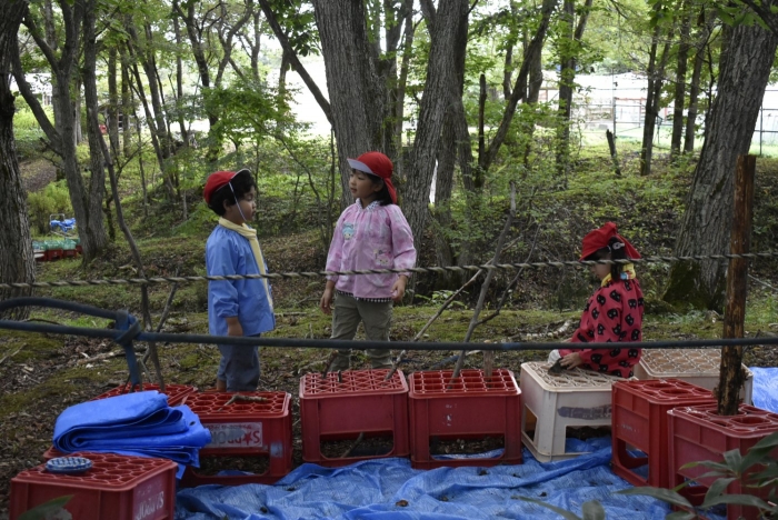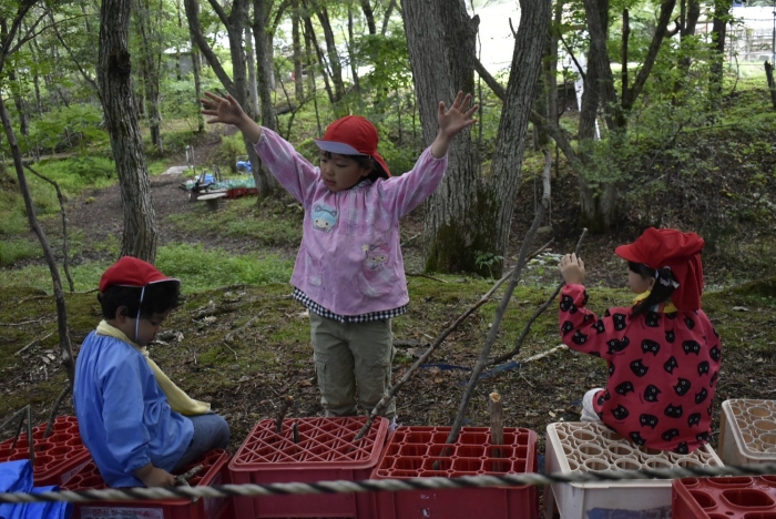年長組は,物置からブルーシートを探し出し,わくわくジャングルへ! 園内で繰り広げられている忍者ごっこを戸外でも楽しんでいる 年長組。木の棒・手裏剣での戦いや忍者の家作りから,今日は修行の場『滝づくり』をしていました。滝のイメージから使えそうなブルーシート持ってきたものの,どうしたら滝のようになるか友達同士で試行錯誤中! 思いや考えを出し合い,伝え合い,様々な方法を試し工夫しながら遊びを進めていければと,先生は一歩離れて見守っています。 失敗は成功のもと!!  今日の体験から,いいアイディアが出てくるでしょうか?