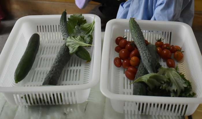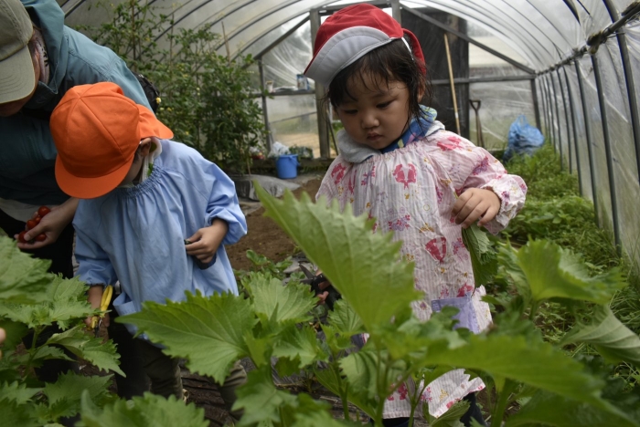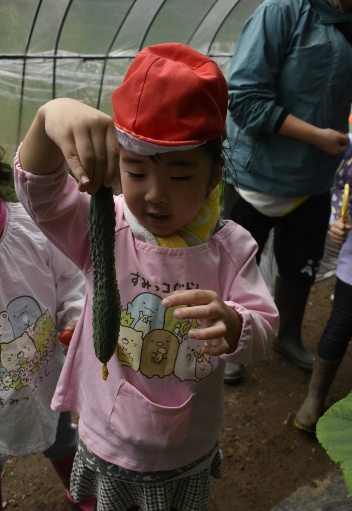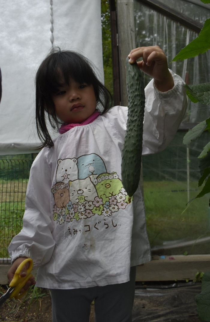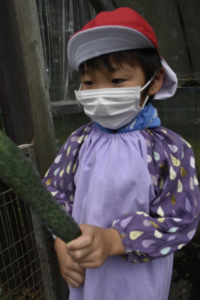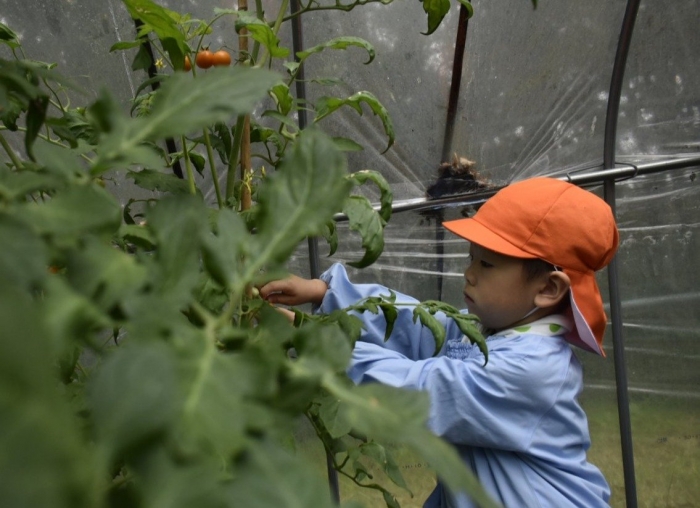 年少・年中組は,ビニールハウスへ!  先週は,まだオレンジがかっていたミニトマトが真っ赤に,食べ頃のキュウリが増えていることに大喜びしていました。食べたい!採りたい!!一心でキュウリのトゲと格闘したり,熟している色を見極めながらトマトを採ったり,みんなで食べられる分があるか数をかぞえながらシソの収穫を楽しんでいました。給食時には,キュウリの漬物,ミニトマト,シソの天ぷらも加わり,幸せいっぱいに頬張っていた子ども達です。