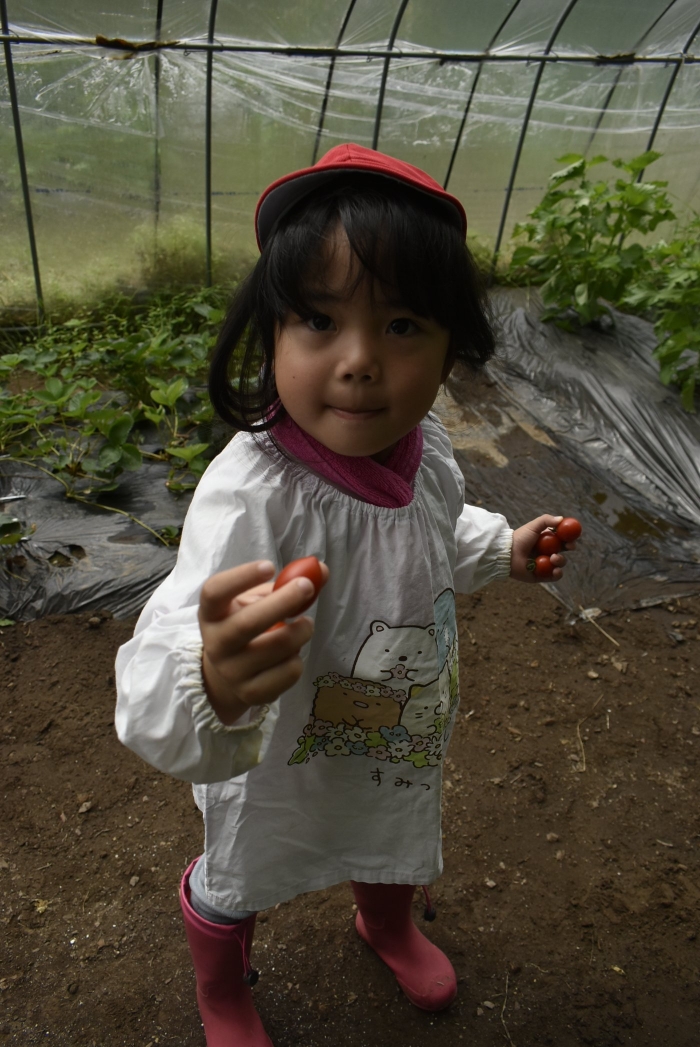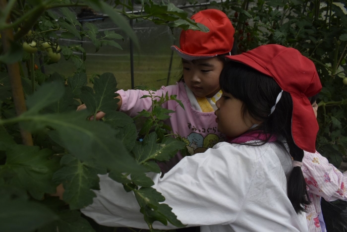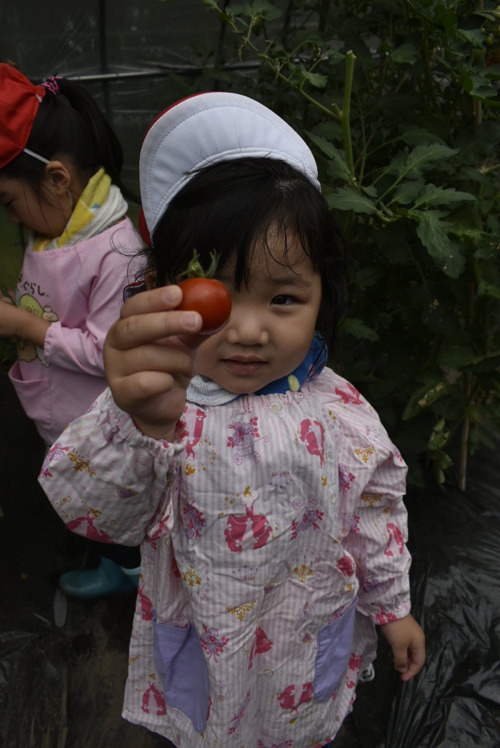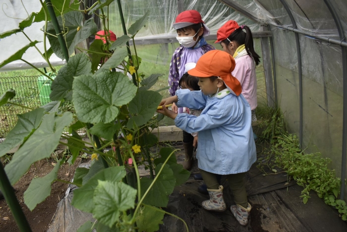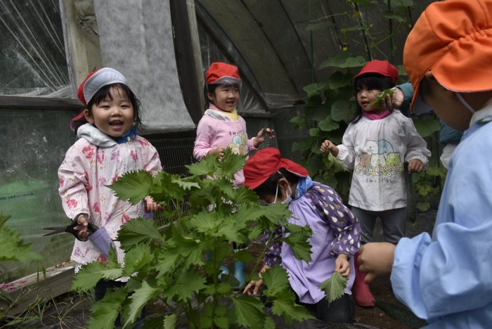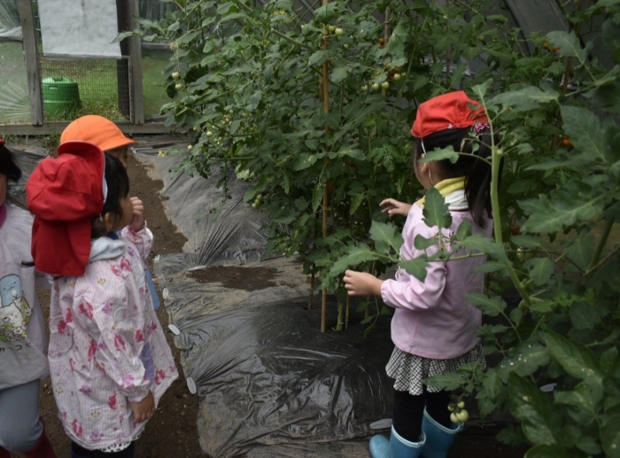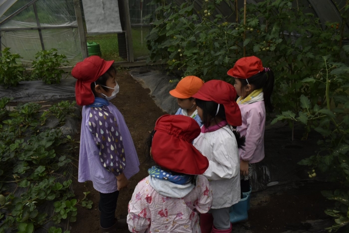 年少・年中組は,ビニールハウスへ!  先週は,まだオレンジがかっていたミニトマトが真っ赤に,食べ頃のキュウリが増えていることに大喜びしていました。食べたい!採りたい!!一心でキュウリのトゲと格闘したり,熟している色を見極めながらトマトを採ったり,みんなで食べられる分があるか数をかぞえながらシソの収穫を楽しんでいました。給食時には,キュウリの漬物,ミニトマト,シソの天ぷらも加わり,幸せいっぱいに頬張っていた子ども達です。