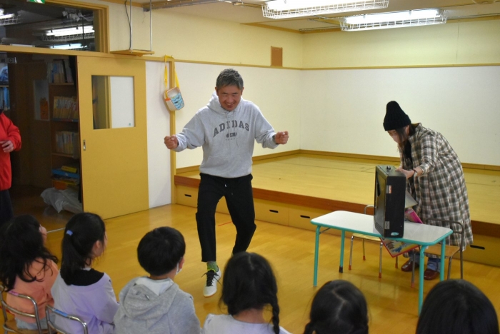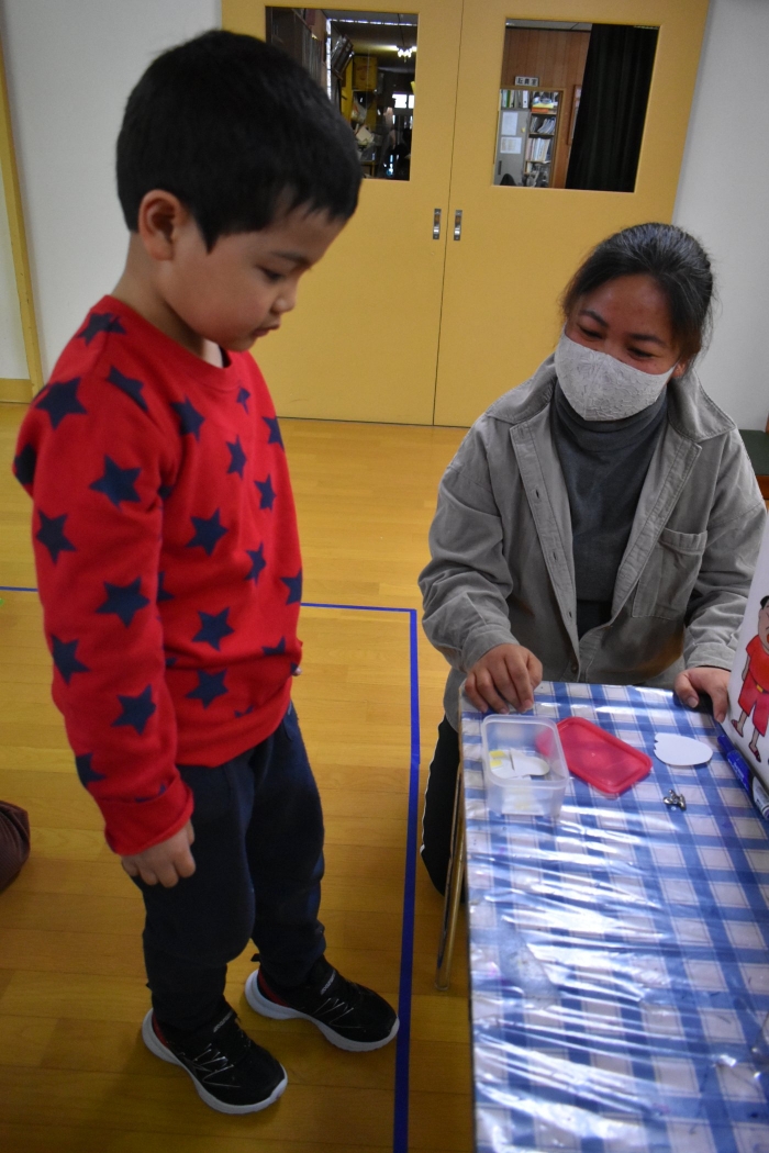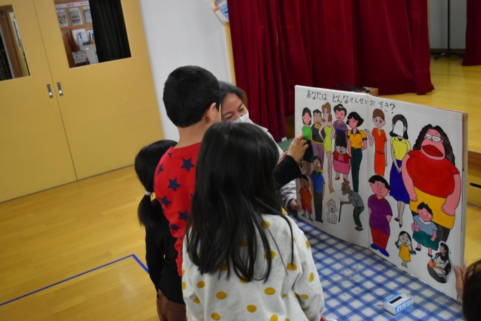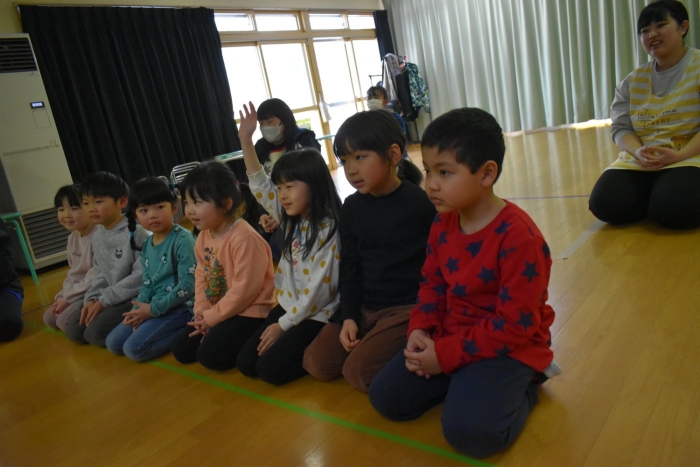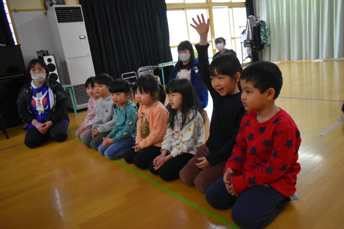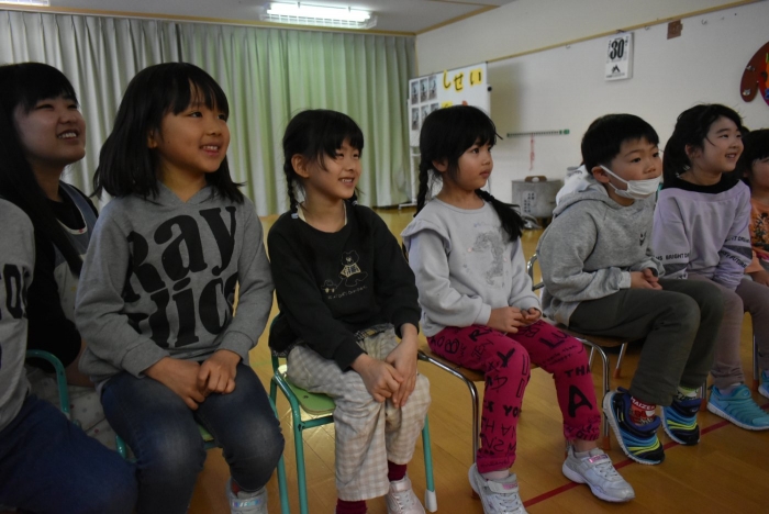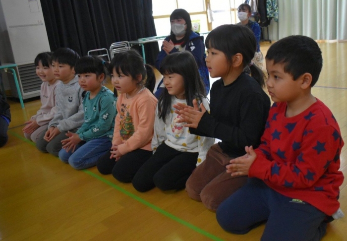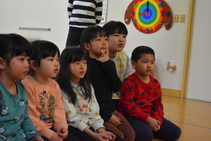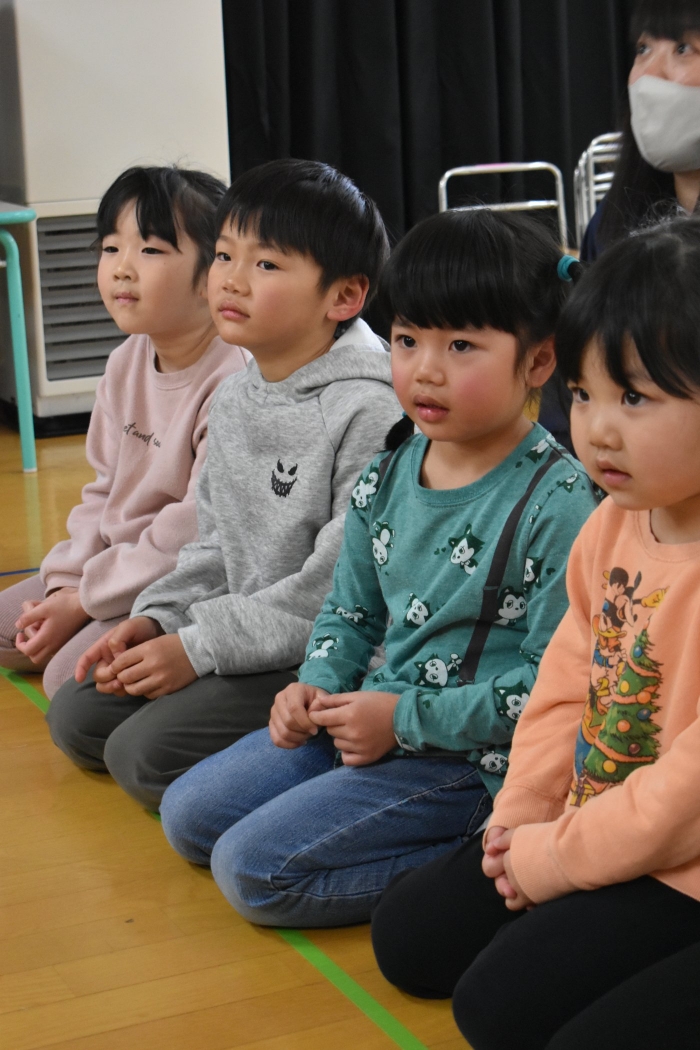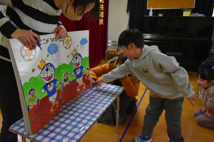 今回は,十二支の由来を題材にした『らいねんは なにどし?』という紙芝居を読み聞かせしてくださいました。お母さんの心地よい通る声と,全身全霊で役になり切るお父さんの見事な掛け合い。十二支+猫+王様+仙人と一人何役もこなさなければならない話でしたが,見事な演じ分けで すっかり物語の世界に引き込まれていた子ども達です。読み聞かせ後も,登場シーンでのお笑いネタをコラボしたり,自分・家族の干支の話をしたりと大盛り上がり! 気分も高らか,自分の干支の動物になり切って各教室へと戻りました。